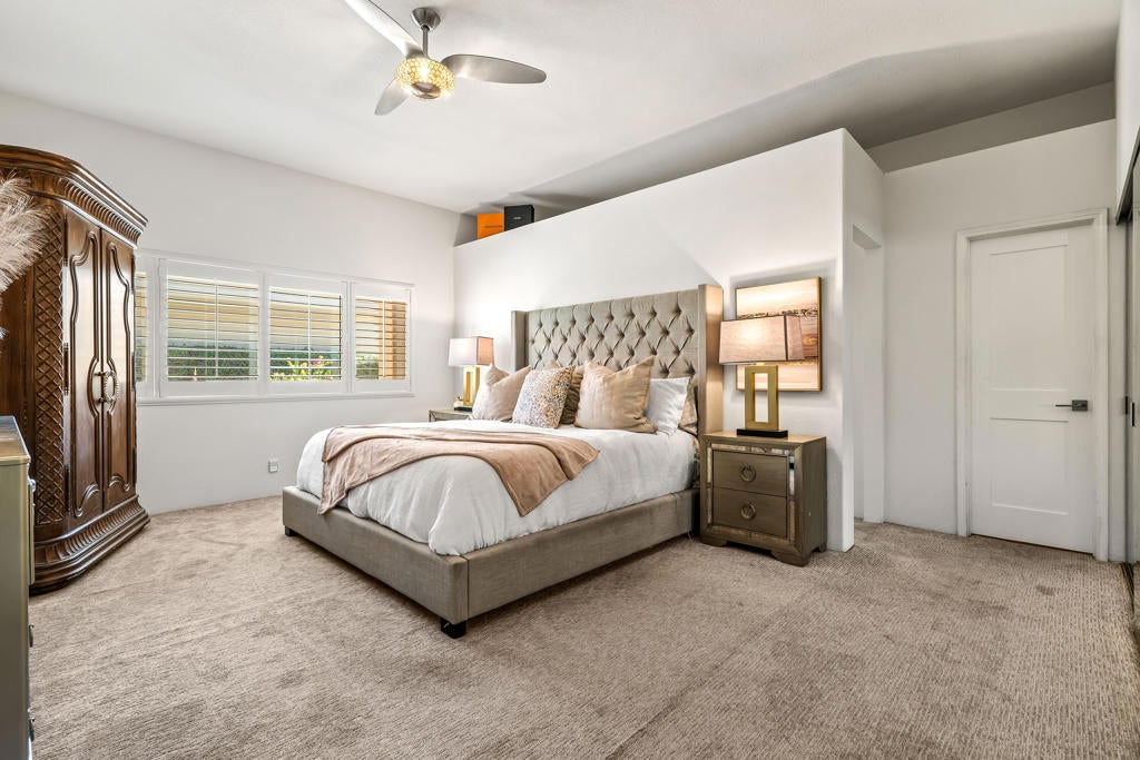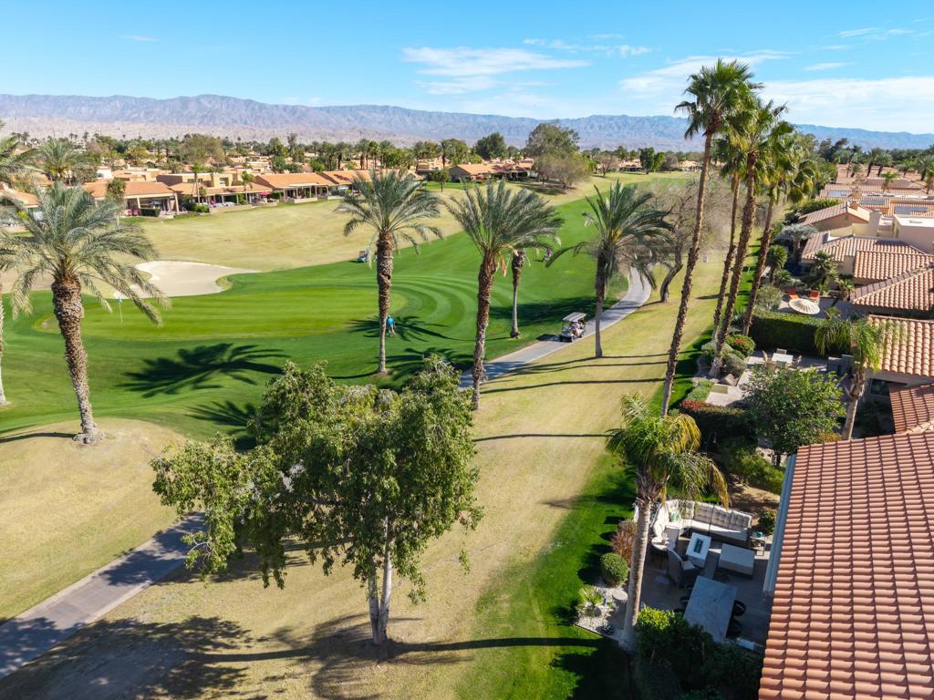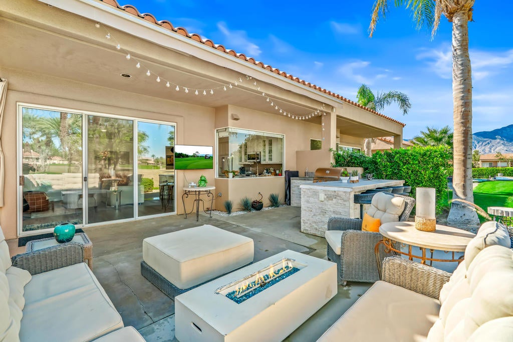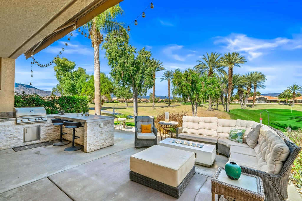 Welcome to this luxurious turnkey furnished condo inside Mission Hills CC East, FEE land not on lease. A beautifully remodeled desert retreat offering panoramic mountain views and perfectly positioned above the 5th green at the Westin Pete Dye course. This unit captures breathtaking vistas from inside your kitchen, living and exterior space that includes a spacious built in BBQ bar and ample seating with this extended patio. Enjoy the outdoor setting to include stunning desert sunsets, Outdoor TV entertaining area and watching the golfers with their golf shots. While you step inside to a completely updated property featuring a striking kitchen showcasing Cafe GE appliances, built in dry bar with wine refrigerator, stylish finishes and a layout designed for everyday living and has ample entertaining space, new flooring, fresh paint, modern baseboards, built in electric fireplace which creates a warm contemporary focal point in the living space. Remote control blinds allow this easy to keep the window treatments up for the day to enjoy these views. The bathrooms have been renovated with elegant, modern touches, while the 3rd bedroom has been used as a functional office, ideal for remote work or a private den.The outdoor living is just as impressive, with the extended patio, built in BBQ and an electric awning to add shade or additional outdoor roomy feel. The perfect setting to relax, entertain and take in the sweeping views. Additional upgrades include newer HVAC, water heater, providing comfort and peace of mind. New inside doors and entry door. This move in ready home blends modern upgrades with resort style living in one of the most desirable country clubs. Memberships available for social and golf. Located near world class golf and tennis..
