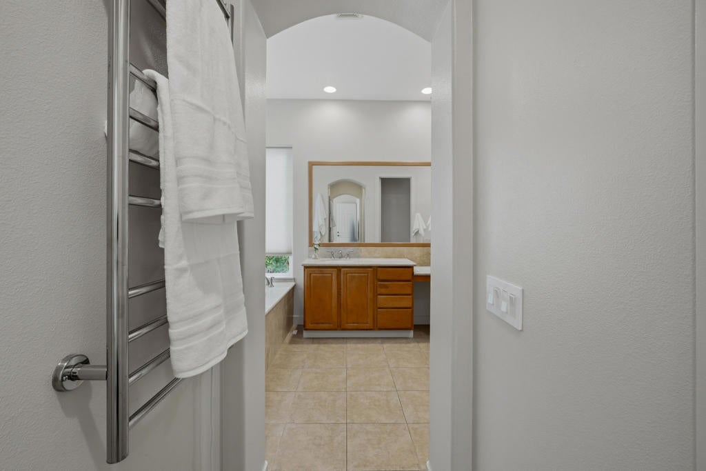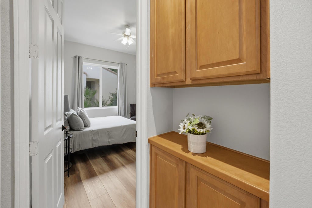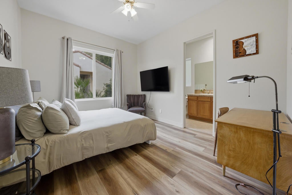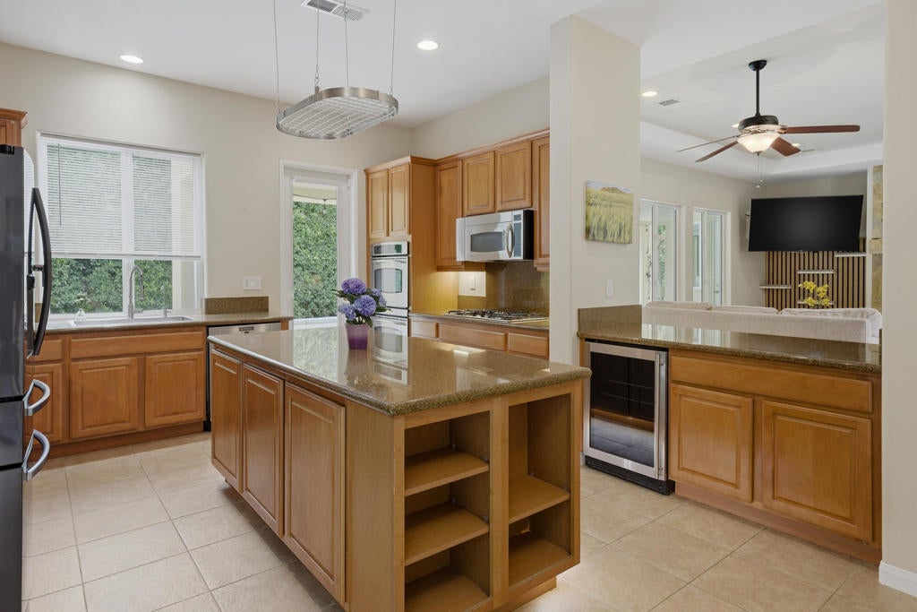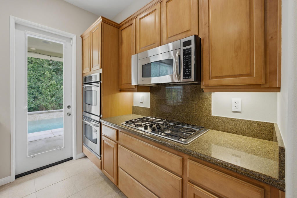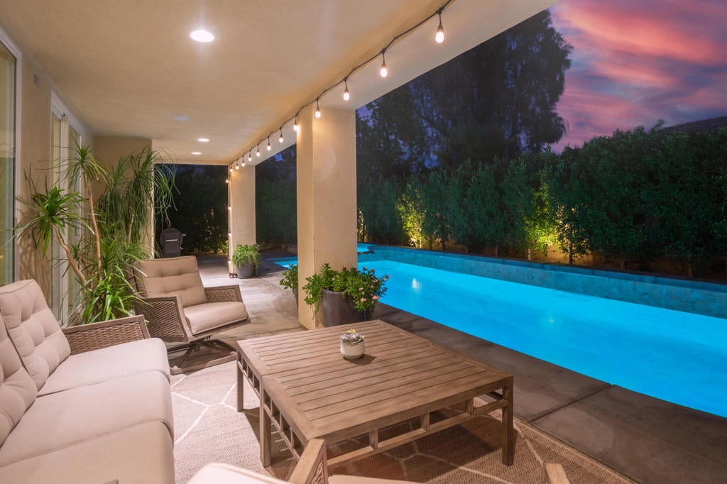 Fabulous Desert Cove Entertainer. Private Quarter Acre Oasis with Resort Living. Don't miss this exceptional opportunity to own a stunning Desert Cove home designed for effortless indoor outdoor living on a rare and highly desirable quarter acre lot. Surrounded by mature landscaping and exceptional privacy, the property feels like your own secluded oasis while still being less than six minutes from town, dining, and shopping. Located in one of La Quinta's lowest HOA gated communities, you will enjoy security, value, and peace of mind. Offering five bedrooms and five bathrooms, the home includes four bedrooms in the main residence plus a spacious detached casita that is ideal for guests, multigenerational living, or a private retreat. Inside, tile flooring flows through the main living areas with updated waterproof laminate flooring in all bedrooms and the casita. LED lighting, soaring 10ft ceilings, and an open great room create a bright and welcoming atmosphere. The space is anchored by a custom stone surround fireplace, expansive windows, and sliding glass doors that connect seamlessly to the backyard. The family style kitchen is perfect for gatherings and features an oversized island, GE Profile stainless steel appliances, double ovens, built-in microwave, beverage cooler, filtered water system to the sink and Samsung refrigerator, plus a French door leading outdoors. A charming breakfast nook with sliding doors opens to the side yard for relaxed mornings and evening breezes.The primary suite offers a peaceful retreat with dual closets, a soaking tub, glass enclosed shower, dual vanities, a towel warmer, and direct access to the pool terrace.Step outside to the private courtyard with a custom Breeo hardwood cooking fire pit and grill, creating the perfect setting for memorable dinners under the stars.The resort style backyard, features a custom pool and spa (installed in 2020) with a tanning shelf, bond beam, two water features, Pentair WhisperFlo pump, saltwater system, Pentair MasterTemp heater, WiFi app automation, LED color changing lights, a custom gas fireplace, extensive concrete decking, sidewalks, and professional landscaping with exterior LED lighting. The oversized lot provides space, serenity, and privacy that is rarely found in the neighborhood. Additional highlights include a three car garage. The double garage is finished with epoxy flooring, and the third garage features laminate flooring and offers flexible space.