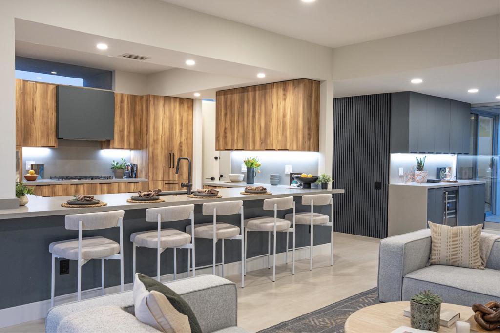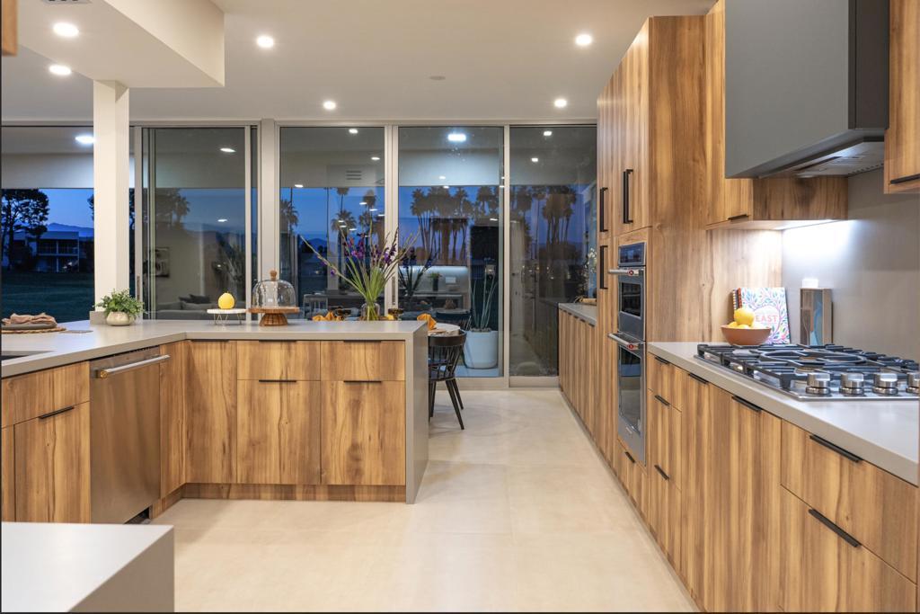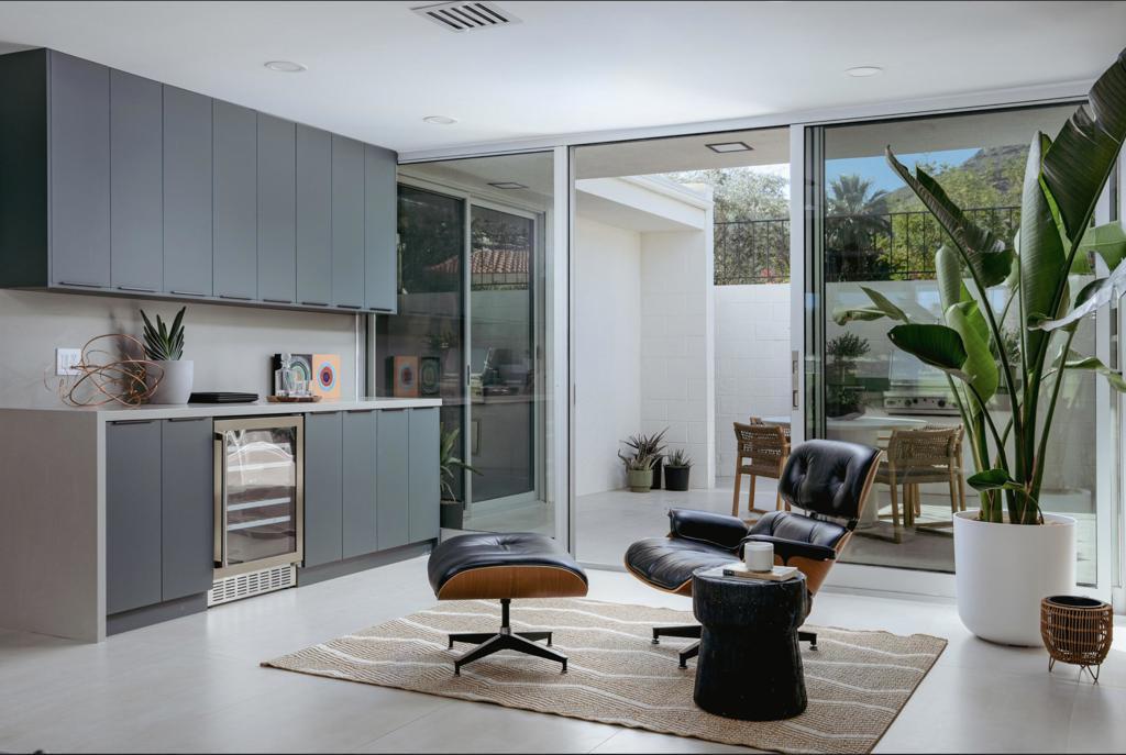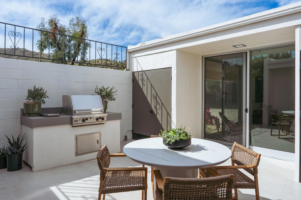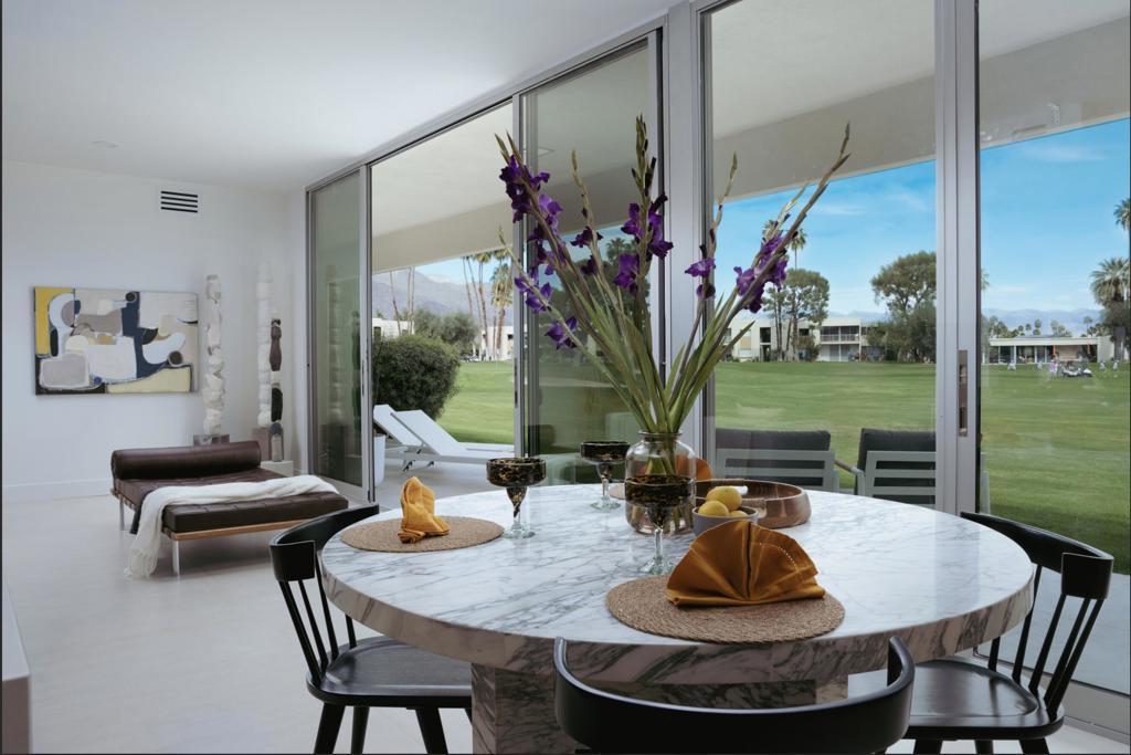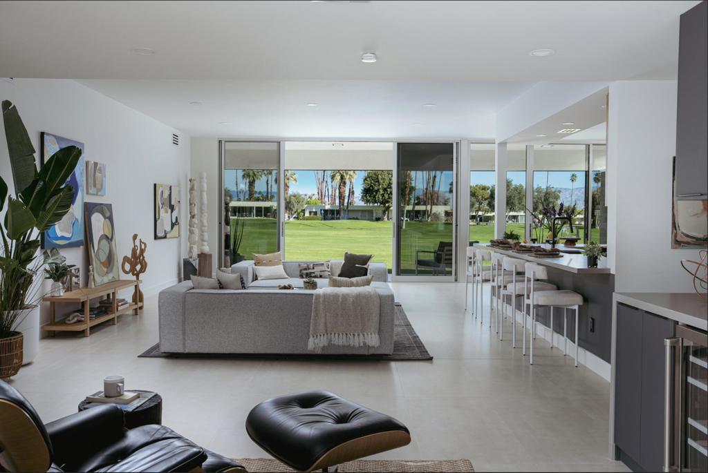 This modernist dream home, in the most desirable floorplan at the coveted Seven Lakes Country Club, has been perfectly reimagined in 2025 for today's desert lifestyle. Spread out over 2200 sq ft in this Richard A. Harrison designed 3bed/3bath. Inside its shadow-blocked walls, this spacious unit's airy layout is highlighted by large format tile floors that extend onto your multiple outdoor spaces. The huge kitchen has been opened to the spacious living and dining areas, allowing you to entertain in style. Finished with custom cabinetry, your high end appliances include a paneled Fisher & Paykel refrigerator and 5 burner gas range, dual wall ovens and a large breakfast bar with waterfall counters. The interior has been extended to create a bar with a wine fridge, to serve cocktails in your private walled courtyard. There you'll take in the view of John Lautner's iconic Bob Hope estate on Southridge, or make dinner on your newer built-in Viking grill. The North end of the home offers walls of glass sliders which open out onto a green leisure terrace with sweeping views of the double fairway and the majestic San Jacinto mountains. All three spacious bedrooms offer sleek custom closets, as well as walk in rain showers in both primary suites. Warm wood tones on all the new cabinetry and doors throughout the home bring respite from the bright desert sun. Out your door, the tranquil pool is just steps away. Past the 24-hour guarded gate, 'The Gem of the Desert' offers a unique elevated lifestyle with its Ted Robinson-designed 18-hole executive golf course, 15 pools and spas and lively William Cody designed clubhouse waiting to welcome you to its formal dining room, casual cocktail lounge and a terrace overlooking the famous Seven Lakes fountain. Welcome home!
