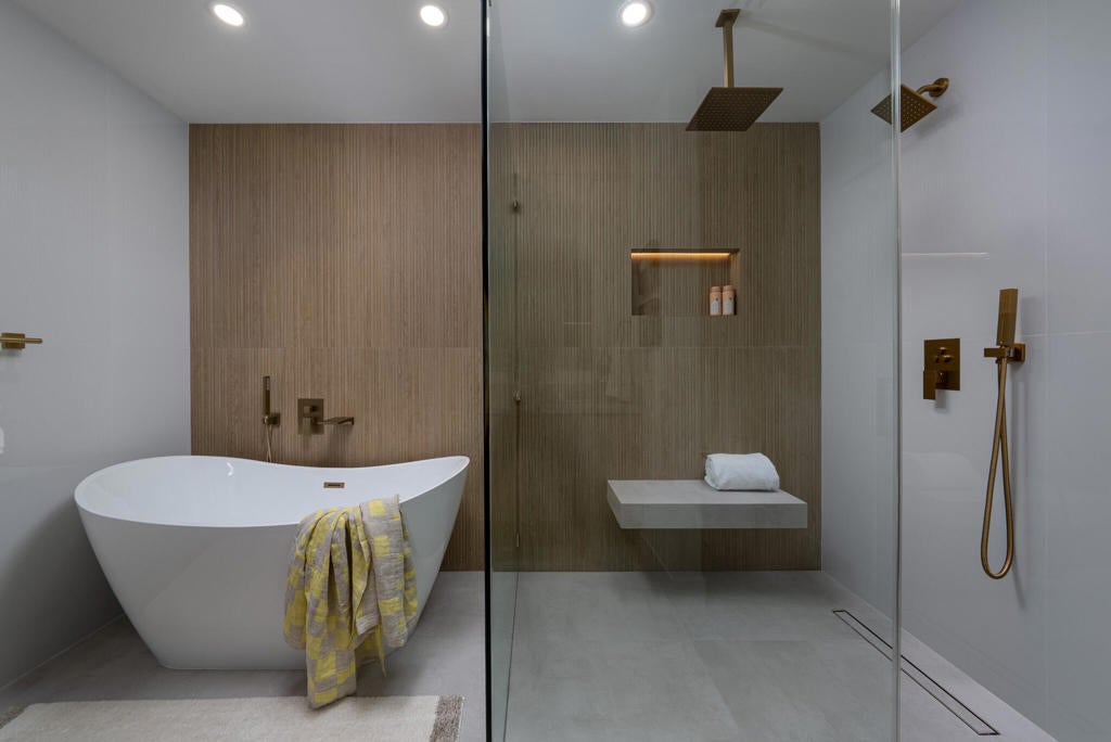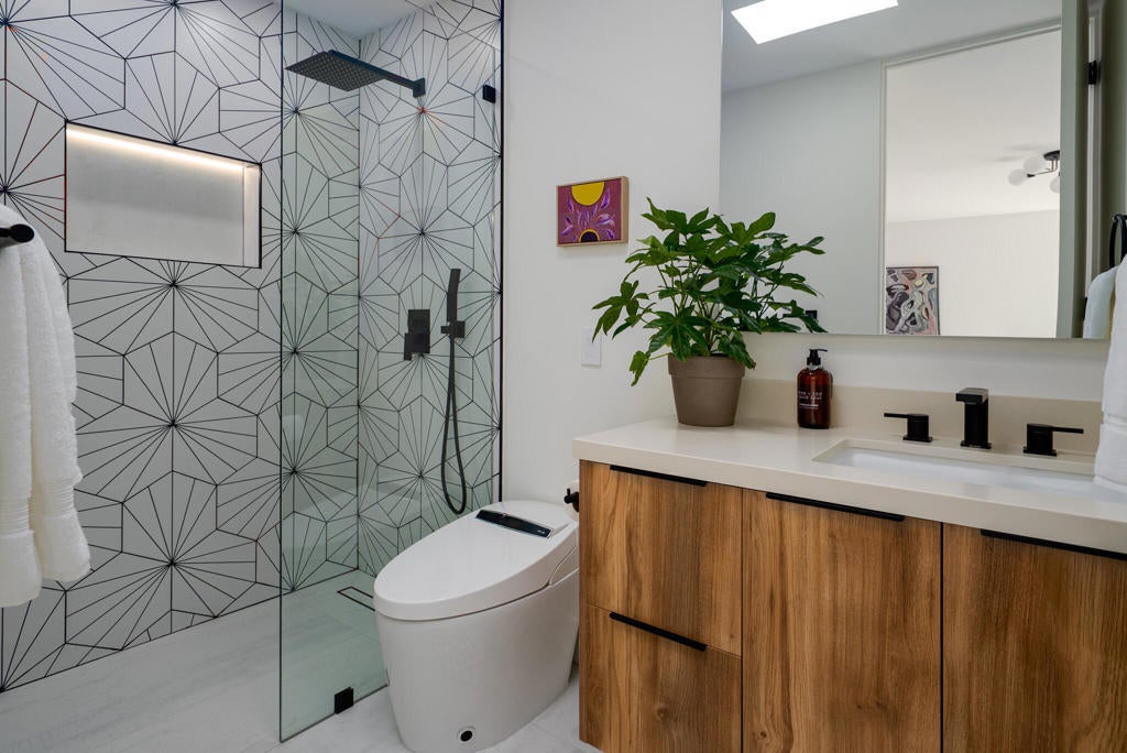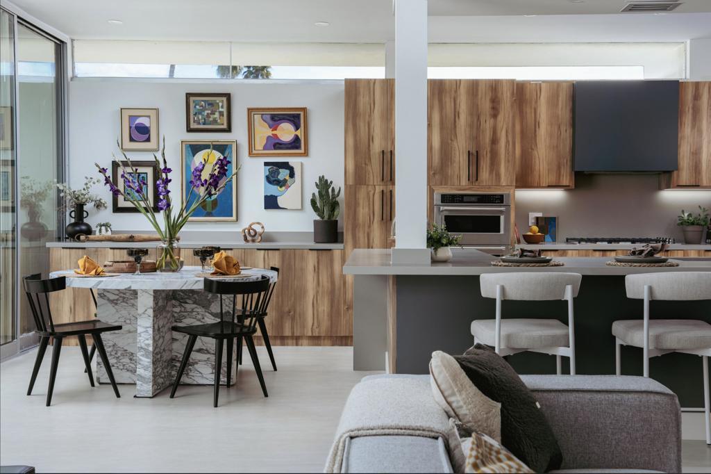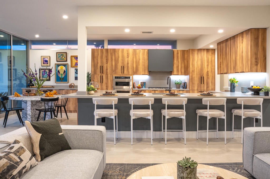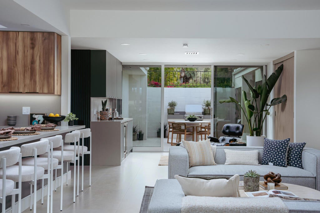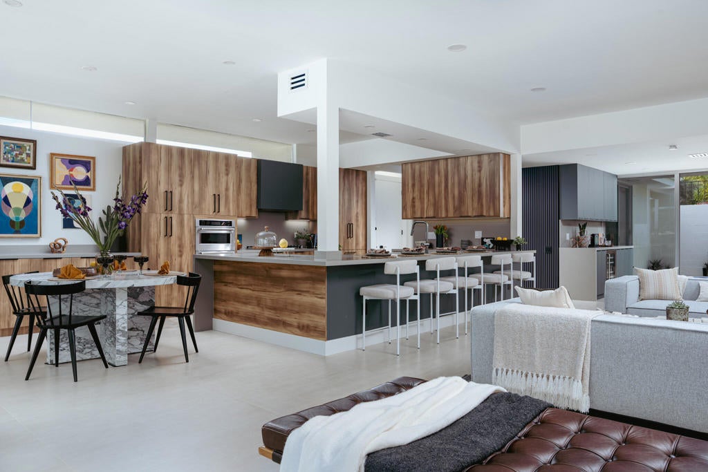 This modernist dream home, in the most desirable floorplan at the coveted Seven Lakes Country Club, has been perfectly reimagined in 2025 for today's desert lifestyle. Spread out over 2200 sq ft in this Richard A. Harrison designed 3bed/3bath. Inside its shadow-blocked walls, this spacious unit's airy layout is highlighted by large format tile floors that extend onto your multiple outdoor spaces. The huge kitchen has been opened to the spacious living and dining areas, allowing you to entertain in style. Finished with custom cabinetry, your high end appliances include a paneled Fisher & Paykel refrigerator and 5 burner gas range, dual wall ovens and a large breakfast bar with waterfall counters. The interior has been extended to create a bar with a wine fridge, to serve cocktails in your private walled courtyard. There you'll take in the view of John Lautner's iconic Bob Hope estate on Southridge, or make dinner on your newer built-in Viking grill. The North end of the home offers walls of glass sliders which open out onto a green leisure terrace with sweeping views of the double fairway and the majestic San Jacinto mountains. All three spacious bedrooms offer sleek custom closets, as well as walk in rain showers in both primary suites. Warm wood tones on all the new cabinetry and doors throughout the home bring respite from the bright desert sun. Out your door, the tranquil pool is just steps away. Past the 24-hour guarded gate, 'The Gem of the Desert' offers a unique elevated lifestyle with its Ted Robinson-designed 18-hole executive golf course, 15 pools and spas and lively William Cody designed clubhouse waiting to welcome you to its formal dining room, casual cocktail lounge and a terrace overlooking the famous Seven Lakes fountain. Welcome home!