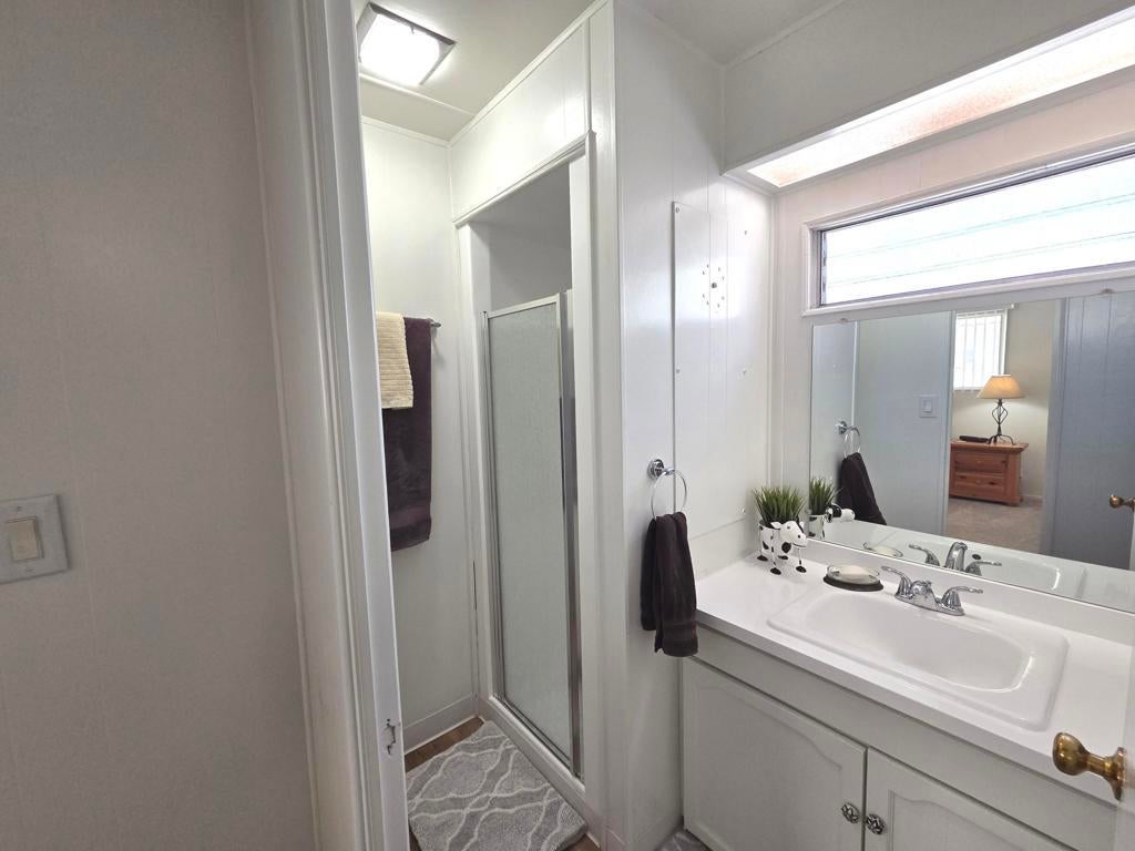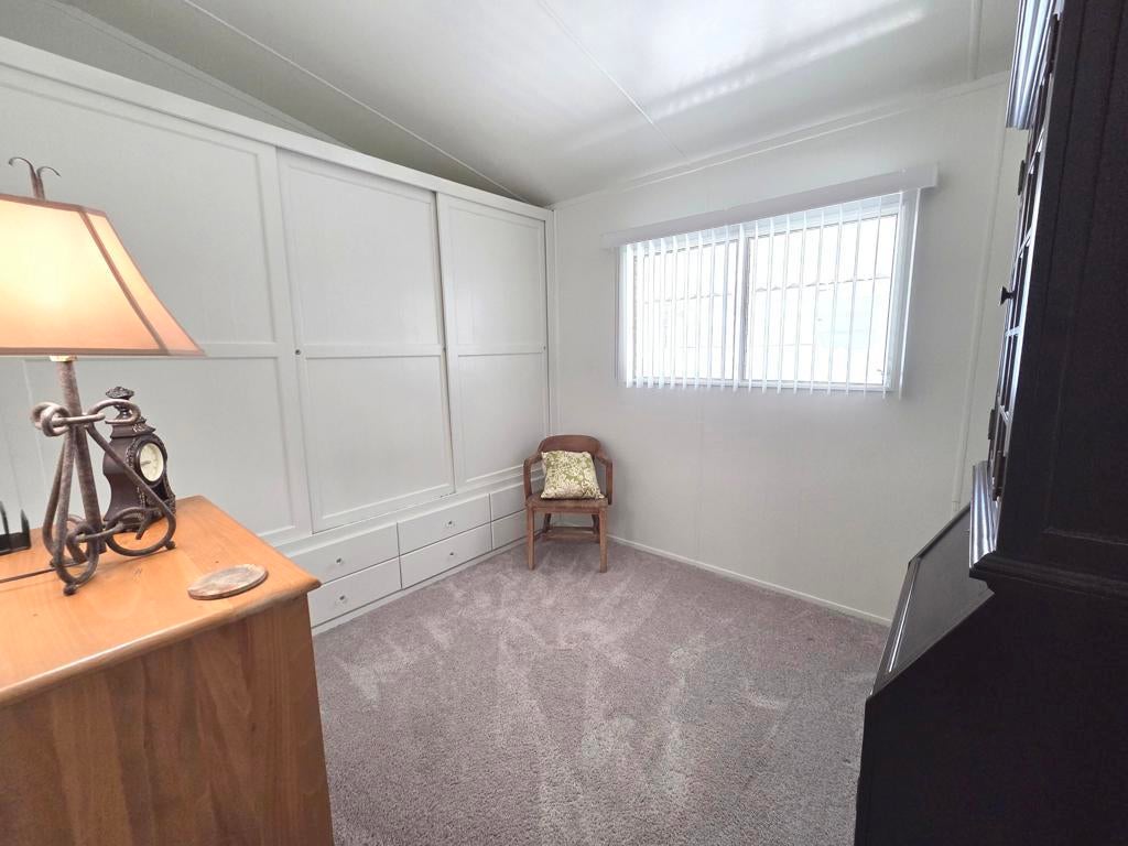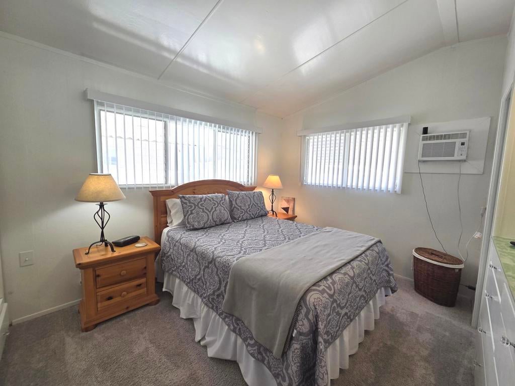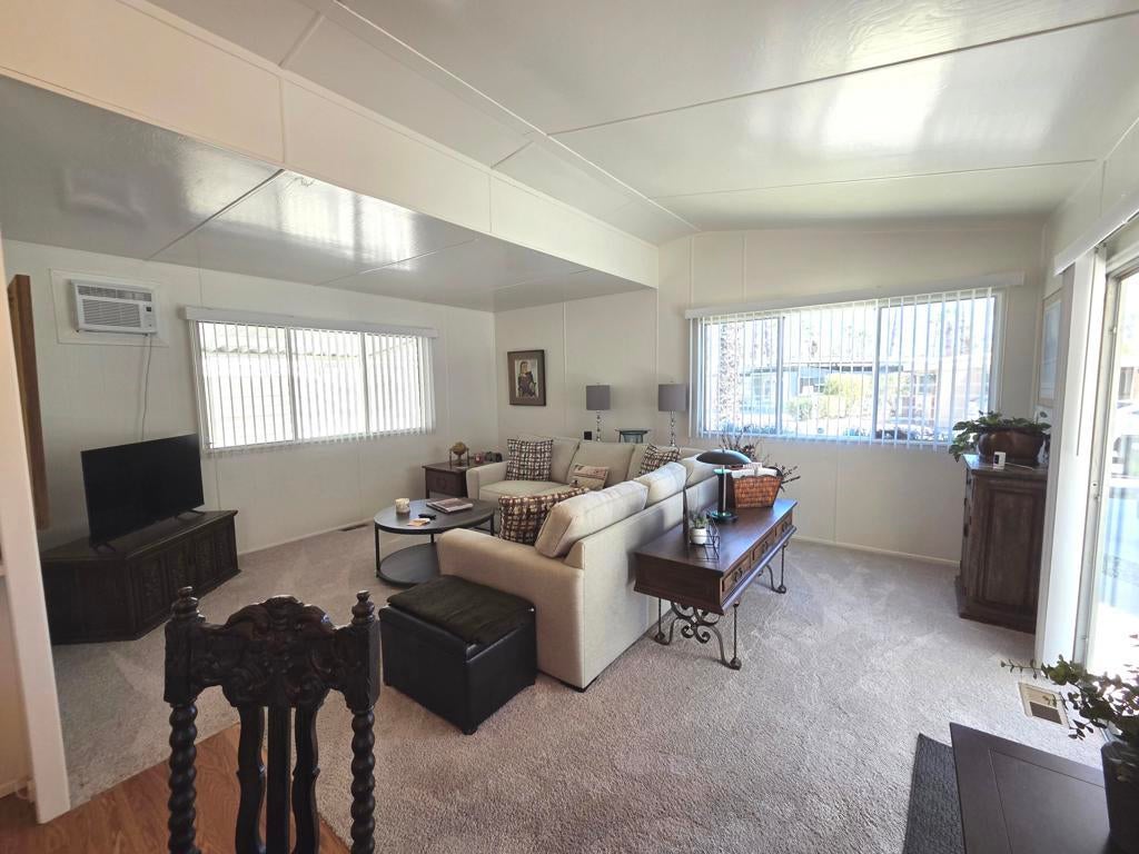 Located in the Royal Palms 55+ community, 179 Butterfield, a 1963 Mayflower 960 sq. ft., two bedroom mobile home with two 3/4 baths, is a stunningly beautiful desert retreat that has been elegantly appointed and meticulously maintained. Entry to the residence is through a lovely west-facing deck with steps that open into the tasteful, bright, carpeted living room; immediately to the left is the dining area with lovely built-ins, a modern chandelier and striking laminate flooring that extends into the adjacent kitchen. Equipped with a four-burner cooktop and an original (working) oven, the kitchen is light, airy and well-organized. Down a short hallway is a bright and roomy guest bedroom with amazing built-ins. Opposite is the guest bathroom with a shower stall and updated vanity. At the east end of the home is the spacious, well-appointed primary bedroom with ensuite bath with tub. A notable feature of this lovely home is the striking high-ceilings that exist throughout the structure. Tandem parking is under a carport awning on the east side of the home; there is a shed on the premises as well. Climate control in the home is through central AC / heat with new Nest thermostat, and a swamp cooler as well; ductwork under the home was renewed in 2022. Royal Palms has two community laundry facilities within the park, each of which within easy reach. 179 Butterfield is sold fully furnished though there is a short list of seller exclusions. Approval by park management at the Royal Palms is required for purchase; monthly space rent for this home will be $892.00 per month for the new owner, though that figure must be verified by any buyer.