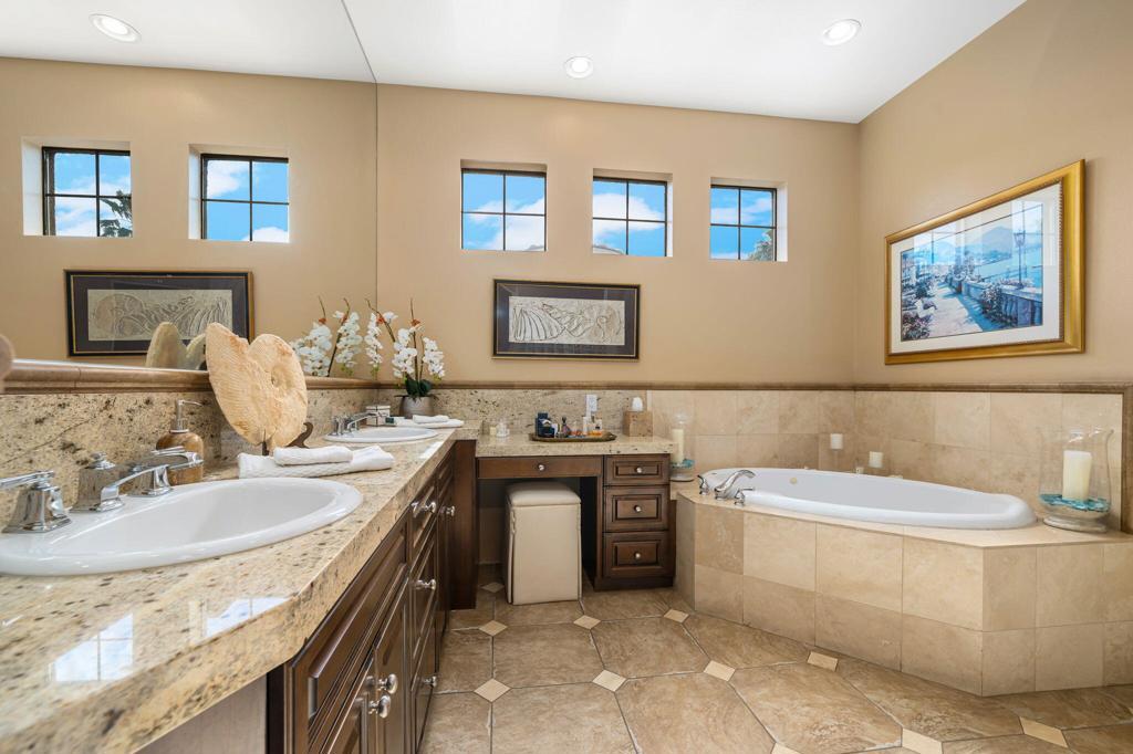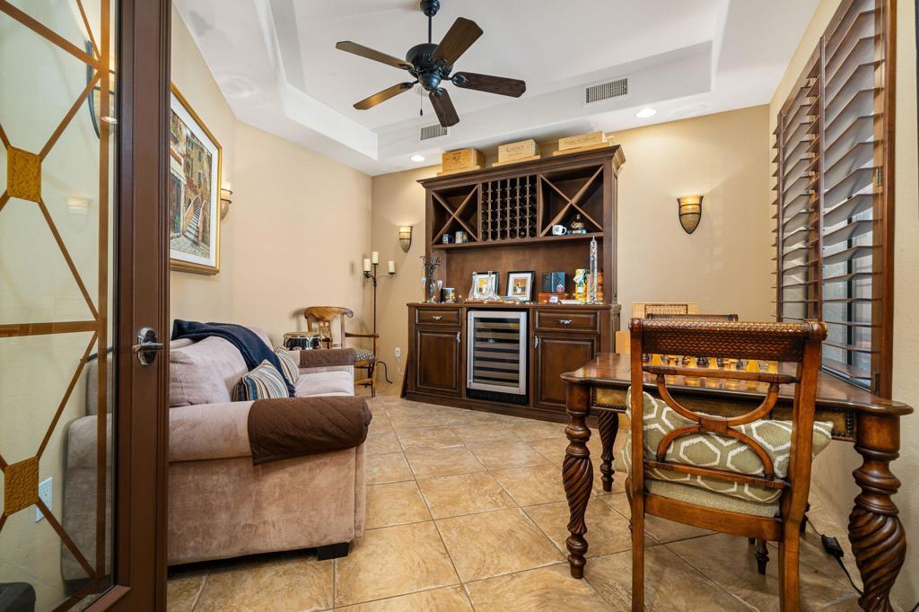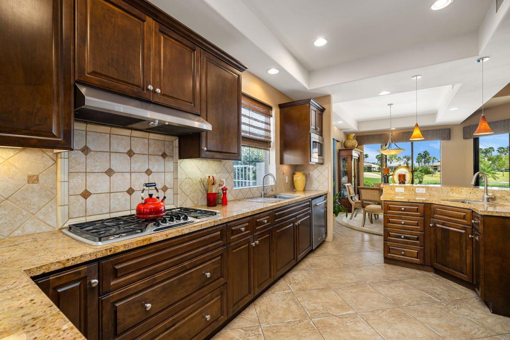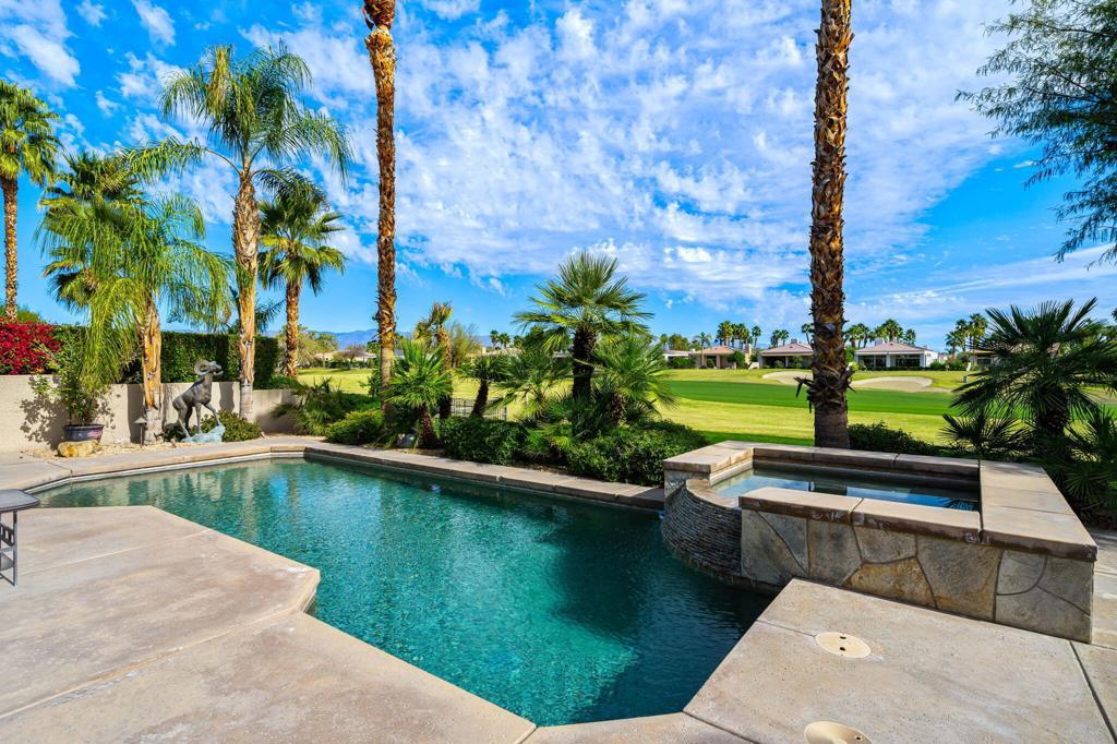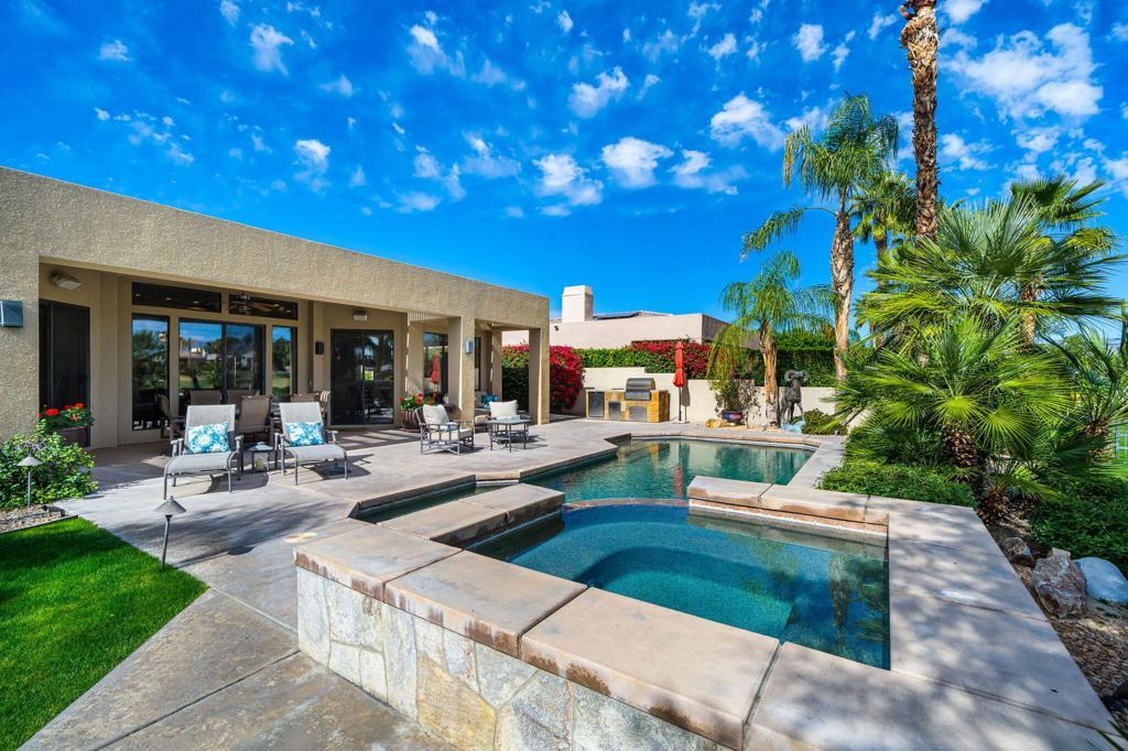 Set within the private Haciendas enclave of Mission Hills Country Club, this rare residence one of only 21--offers refined desert living with exceptional privacy. A welcoming front courtyard leads to a separate guest casita complete with a mini‑kitchen, fireplace, and en‑suite bath.The main home features an open great room with custom built‑ins, accent lighting, and a fireplace. A sleek wet bar enhances the space, while the chef's kitchen offers stainless steel appliances, built‑in refrigerator, double ovens, granite counters, and a walk‑in pantry. The adjacent dining room is perfect for hosting. Designer touches, stepped ceilings, surround sound, and abundant natural light elevate every room. Expansive windows capture views of the Pete Dye Challenge Course's 13th fairway. The generous back patio provides multiple seating and dining areas overlooking the pebble‑tec saltwater pool and spa, with room to add additional outdoor features. The primary suite includes dual walk‑in closets, a fireplace and a spa‑like bath. Two additional guest suites--each with its own bathroom--offer ideal accommodations for visitors.Located in the guard‑gated community of Mission Hills, this home blends comfort, sophistication, and exceptional resort‑style living.