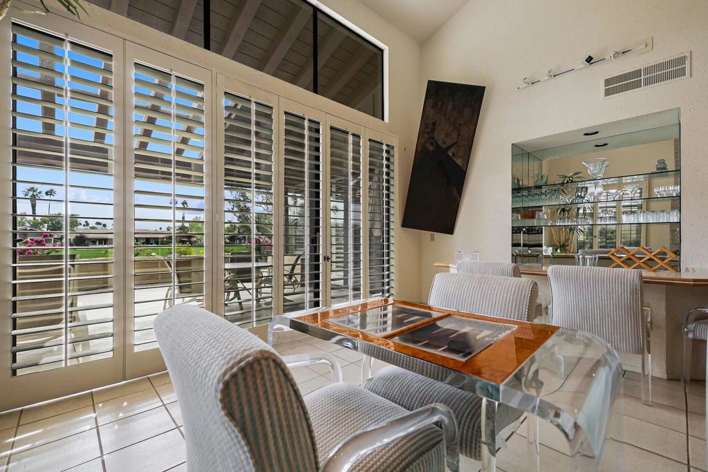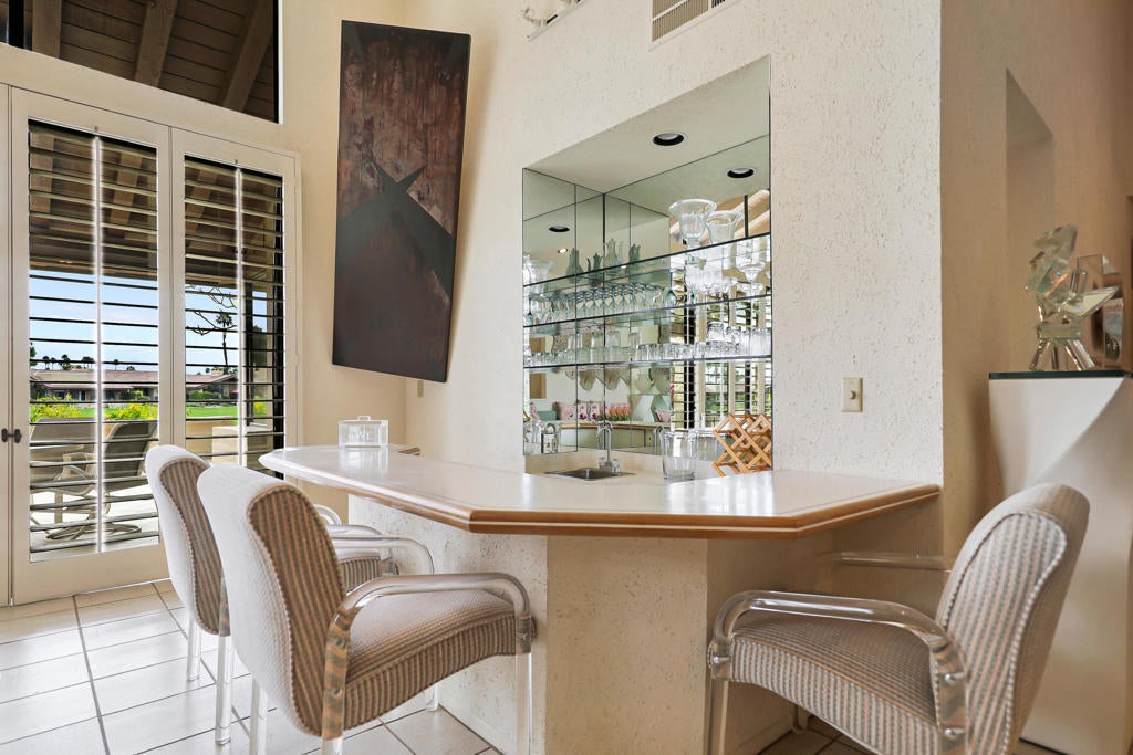 It's all about location. Sunny South facing exposure and situated on a desirable interior lot within The Lakes Country Club, this property offers a prime setting and a floor plan ready for the next chapter. While the home retains its original finishes, it presents an outstanding opportunity to renovate and create significant upside. Step into a home full of personality featuring a classic sunken bar that anchors the living space and brings back the golden era of desert entertaining. With generous square footage and a flexible layout, this property offers endless potential -- whether you embrace its vintage charm or reimagine the space with a modern touch. Offering over 2700 SF with 3 Bedrooms and 3.5 baths. A sunny morning room off of the kitchen opens up to an enlarged patio with sunny southern views of mountains and golf course. Custom white wood shutters adorn the living room and kitchen. Tile runs through the common areas with carpets in the bedrooms. Classic desert design is abundant in all of the cohesive furnishings that will transfer with the purchase. A rare opportunity to secure a prime location and create something truly special.