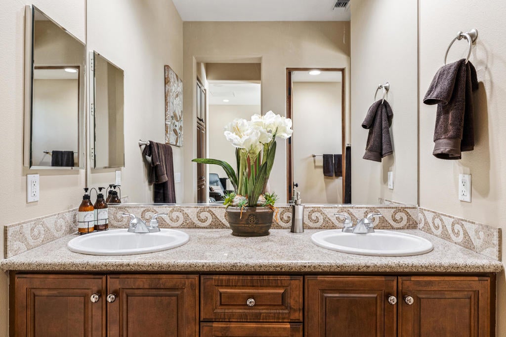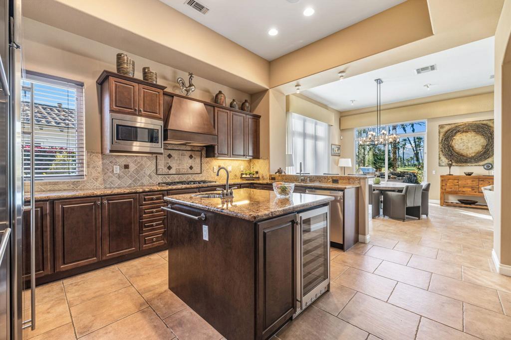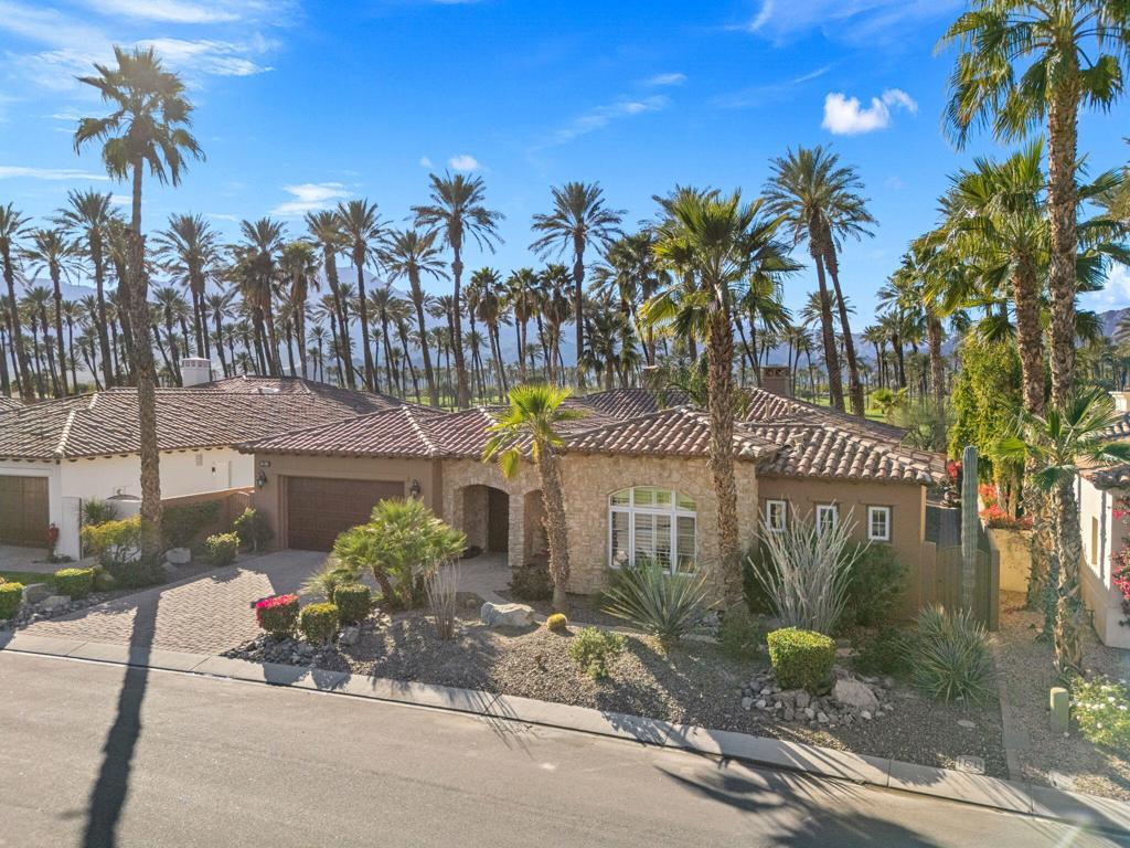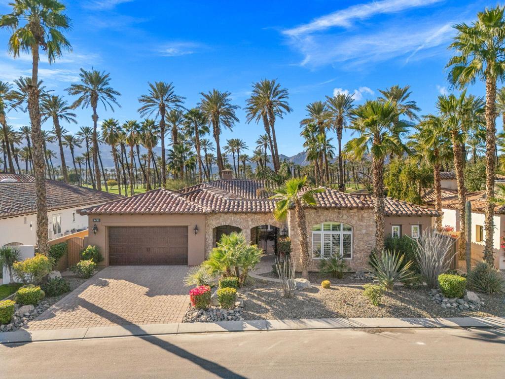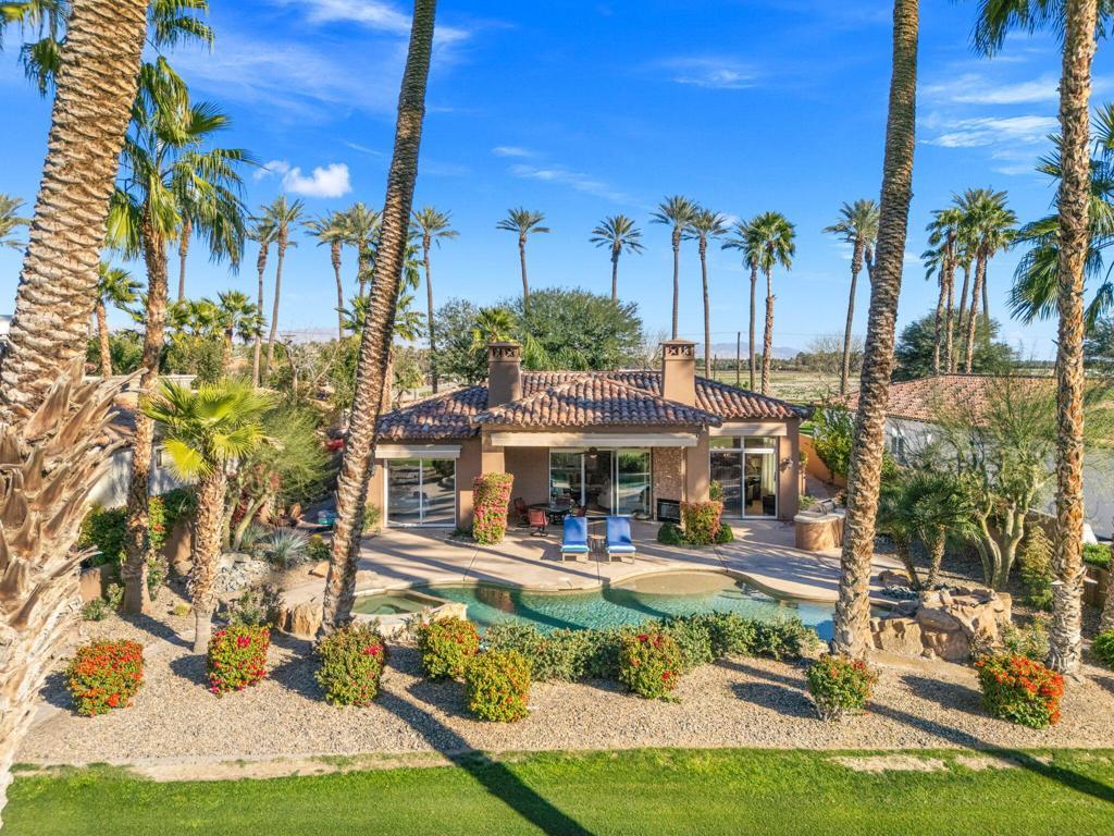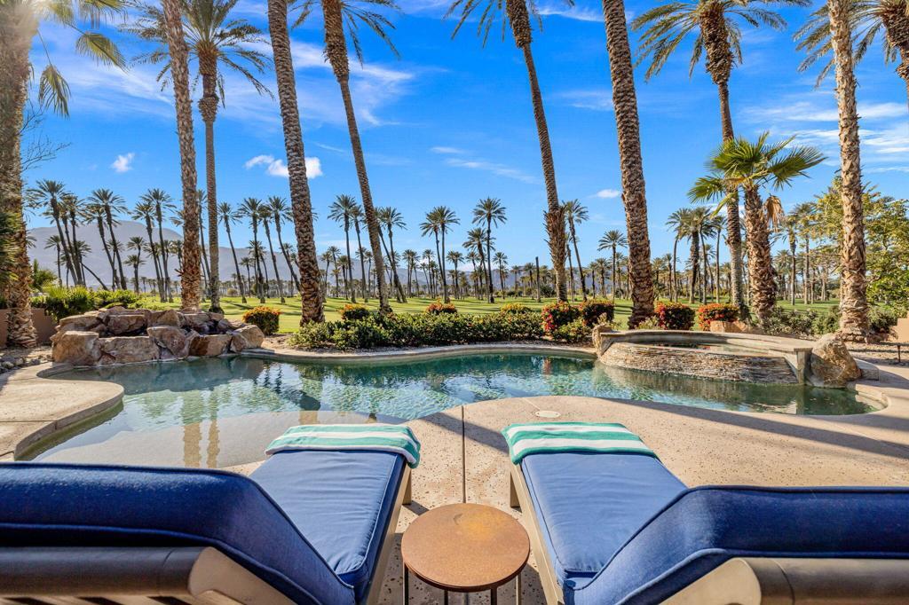 Panoramic Santa Rosa Mountain and golf course views set the stage for this refined desert retreat. Thoughtfully positioned along the perimeter of the course for added privacy, this upgraded residence blends sophisticated interior design with resort-style outdoor living.Overlooking manicured fairways and dramatic views of the Santa Rosas, the three-bedroom home -- including a detached casita ideal for guests, a private office, or extended stays -- offers a seamless balance of comfort and elegance. Designed to embrace indoor-outdoor living, the private backyard features a custom saltwater pool and spa, built-in BBQ, patio fireplace, and remote-controlled awnings that extend the living space into the surrounding scenery. Low-maintenance desert landscaping enhances the architecture while keeping the mountain and fairway views the focal point.Inside, custom details elevate every space, including lighted valances, custom shutters, a built-in entertainment center, and central vacuum. A guest bedroom provides flexibility, while the kitchen is thoughtfully appointed with an island sink, wine refrigerator, trash compactor, and upgraded backsplash. The primary bath offers a spa-like retreat with soaking tub. Additional highlights include A/C in the garage, custom steel garage doors, and a striking wrought-iron entry gate.The Palms is a distinctive La Quinta golf course community designed with homes situated along the outer edges of the course, creating an uncommon sense of privacy -- and no tee times. Membership at The Golf Club at The Palms is available but not required, allowing residents to enjoy the lifestyle at their own pace.