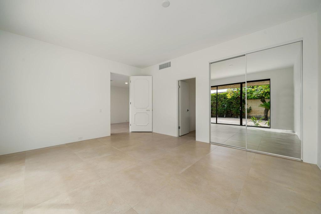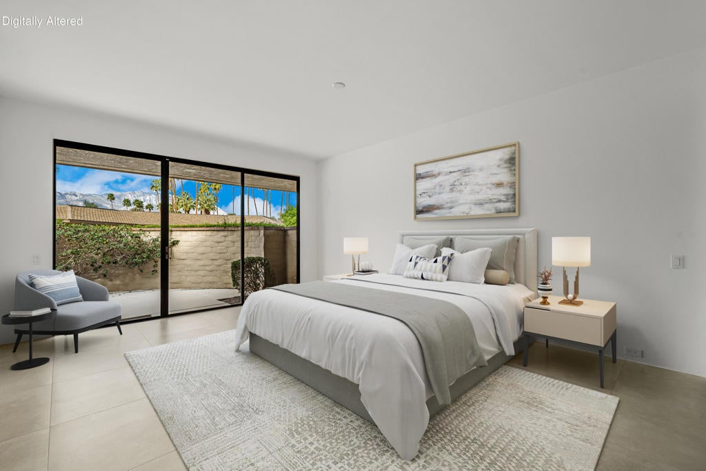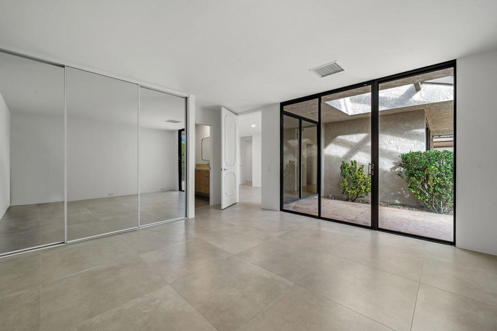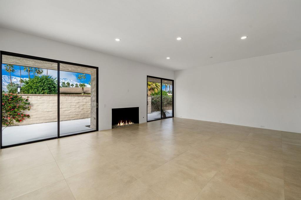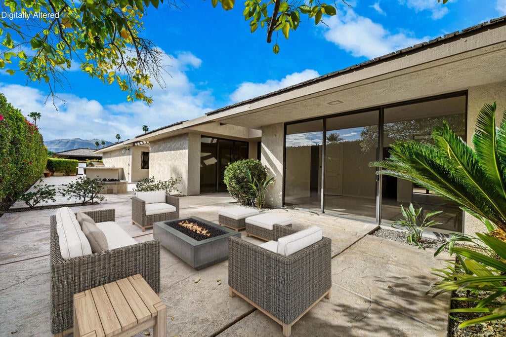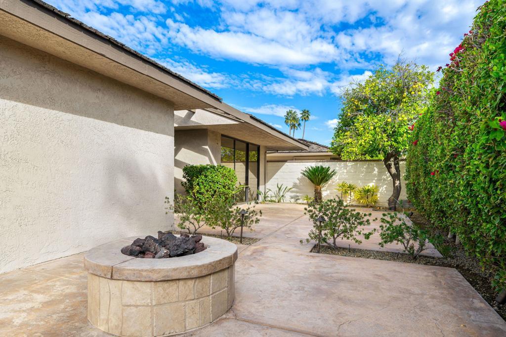 Welcome to this meticulously renovated stunner inside the Iconic Springs Country Club. This 3-bed, 3 1/2 bath home is a highly sought after free-standing St. Andrews model, but w/ a new powder room off the front entry. Located on a generous sized lot w/ a very large turn-around driveway, this is the perfect desert retreat for those seeking high-end finishes, soothing desert hues, and a very quiet location. Enter through the double glass custom gates into a large front courtyard adorned with a newly resurfaced sparkling saltwater pool/spa and stunning west views of the snowcapped mountains and swaying palm trees. The large wrap around patio features fragrant foliage, mature citrus trees and succulents, and has plenty of room for entertaining and relaxing w/ friends and family. Whether you're enjoying stories around the built-in firepit to feasting on your favorite cuisine prepared on the built-in grill & wet bar w/ granite countertops, dining alfresco will always be in style! Once inside the double glass entry doors, you're greeted with luxurious finishes, including 32 x 32 porcelain tile flooring throughout. The large great room/dining area, featuring a clean-line fireplace, soaks in an abundance of natural light, and offers fantastic west views of the snow-capped mountains, overlooking the relaxing pool area. Enter a chef's dream kitchen that includes state-of-the-art appliances; a professional Dacor oven/cooktop and Bosch D/W. The center of the kitchen shows off a full-slab quartz island, perfect for those family gatherings in the kitchen. Enjoy double wine refrigerators, custom Dayton-Rift cabinetry and soft-closing drawers, all topped with carmel and ivory quartz slab. The luxurious Primary suite is adorned with natural light and shares captivating views of the San Jacinto mountains. A triple frosted glass door closet and add'l large walk-in closet mean you'll always have room for those last-minute desert shopping sprees. The 5-star Primary bathroom offers a deep solid-surface soaking tub. All three bedrooms are ensuite and feature Brizo shower hardware that truly elevates your bathing experience. Add specialty shower tile surfaces and Taj Mahal quartz countertops & Dayton-Rift cabinetry, and you have a true spa experience. The garage floor has a new epoxy finish and large storage room. A new security system, new water softener system and solar panels make this home a rarity!