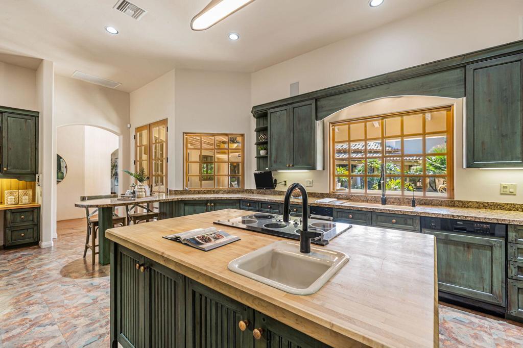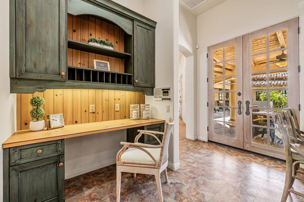 Discover this classic Santa Barbara style new hacienda home in the desert! Quality, charm and elegant design elements are evident in every room. Located at the end of a quiet street in the exceptional community of Ironwood Country Club this very private home has a spacious living room with high tongue and grooved beamed ceilings, custom cabinetry, a fireplace a mirrored bar, and four ceiling fans. Large custom windows bring in light and offer views of the lush desert landscaping. The gracious formal dining room is perfect for entertaining. The large charming kitchen has a breakfast bar, built-in desk, large workspace island, granite and wood countertops, a pantry, GE Monogram, and Kitchen Aid appliances. Six sets of French doors open from the beautiful wide hallway and master bedroom to the courtyard patio and pool. There are a total of four light filled bedrooms all ensuite, two full baths, two 3/4 baths and two additional 1/2 baths. The primary bedroom has high ceilings, and an attached office/ sitting area with fireplace. A long and inviting covered walkway and courtyard curves around the back yard, a stunning highlight of this home with professional landscaping as backdrop for the spa, waterfall and pool. Stairs lead to a high deck patio offering 360 degree views of the valley and mountains, and a delightful place to enjoy sunrises and moonrises This property is a true oasis of privacy and tranquility. Ironwood Country Club offers two Championship exceptional 18-hole courses and one of the most active golf programs in the Coachella Valley for social and competitive play. Other member amenities include 9 Tennis Courts, 10 Pickleball Courts, 2 Pop Tennis Courts, 2 Bocce Ball Courts,State-of-the-Art Wellness Center,Complimentary Group Exercise Classes,Spa Services, Dining and Club Social Events & Activities. The Club offers a variety of memberships by application and sponsorship. Membership is not required to own a home in Ironwood