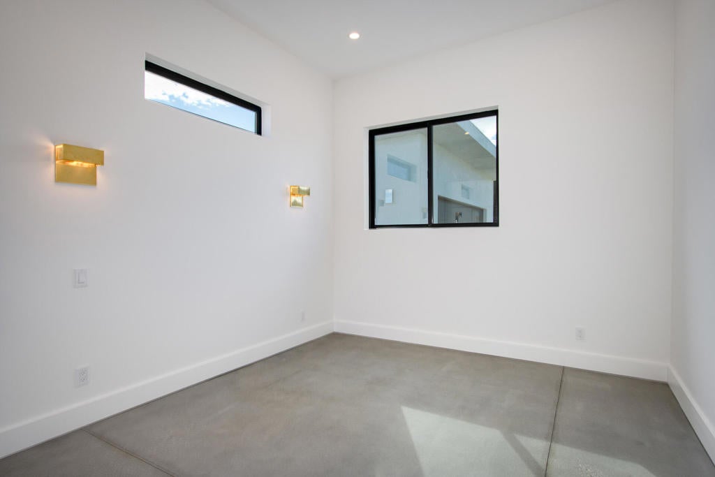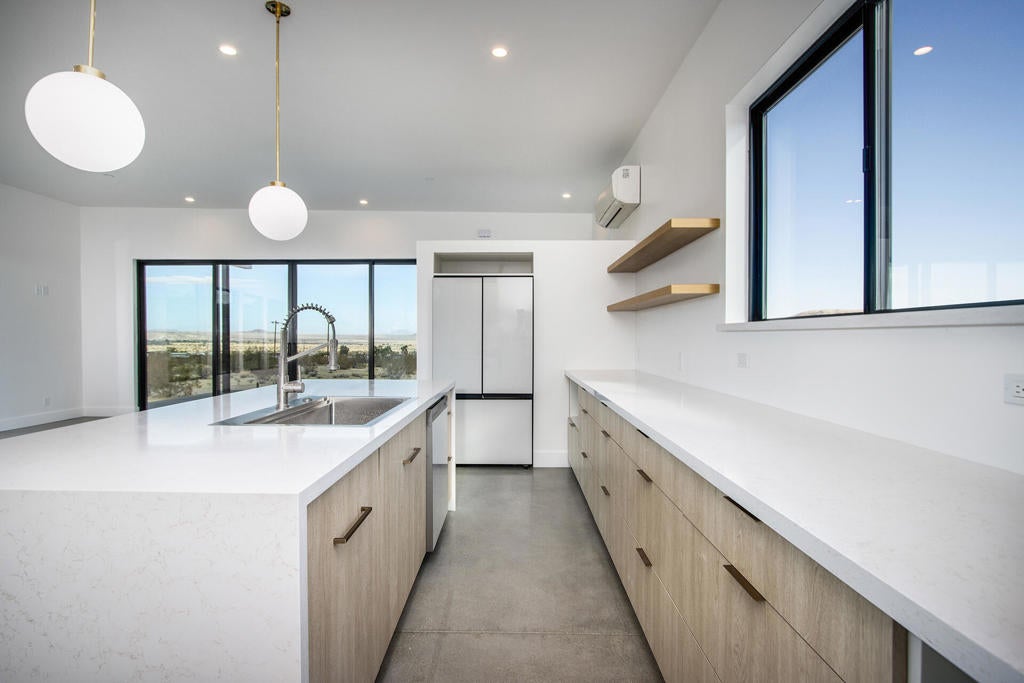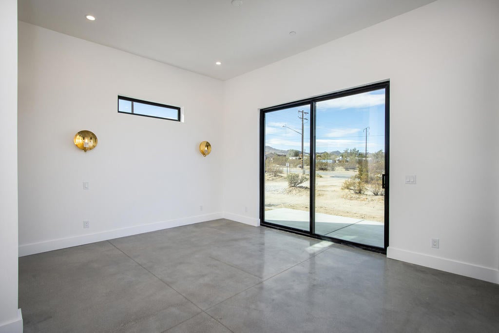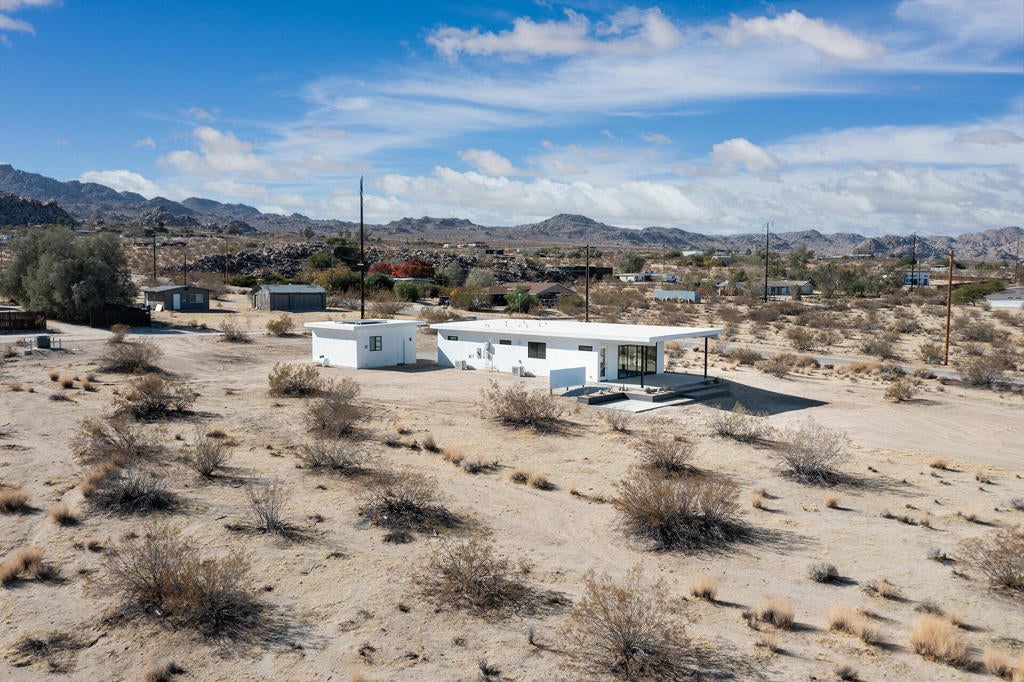 Immaculate new construction perched on a gentle slope in the highly coveted Panorama Heights neighborhood of Joshua Tree. 2 bed 2 bath with high ceilings & expansive windows that bring in beautiful natural light. 1.01 ample acres with desert fauna that offers peace, serenity, & ample space. Property features a finished detached garage with ADU potential & Paid Solar & backup battery! Upgraded sliding glass doors open to an oversized covered patio. Inside you'll find a beautiful island style kitchen with stainless steel new appliances, pendant globe lighting, breakfast bar, long counters, shelves, with generous cupboards & cabinets. Main bedroom enjoys a wide closet with a loft shelf. Main bath adorned with upgraded cladding, tile floors, glass wall & raindrop shower with a contemporary freestanding bathtub. Separate laundry area with new washer/dryer. Hallway bathroom with raindrop shower head, hexagon mosaic tile, bathtub, & sleek floating vanity with vessel sink. Property also features upgraded concrete work & block wall. Located just a half mile to a newly open trendy coffee & cocktail lounge. Perfectly located to tour Indian Cove for hiking, & the Joshua Tree National Monument where about 3 million tourists visit annually. 2 miles to Copper Mtn College. Organic cafes, restaurants, & the JT Saloon in the nearby Joshua Tree Village. 40 miles to Palm Springs. 133 miles to LA. Must see for a primary residence, rental, and investment!