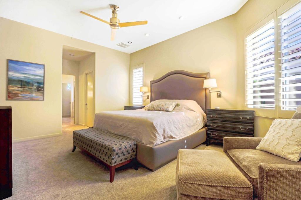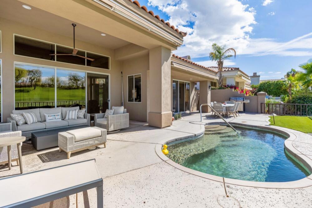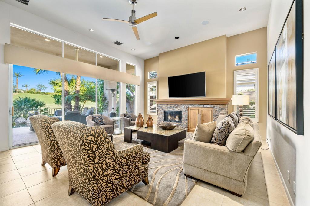 Rental Available May 15 - October 15, 2026 at $3,200 /month + utilities. Welcome to your desert oasis at Indian Ridge Country Club in Palm Desert. This stunning 3-bedroom, 3.5-bathroom home offers luxury living with custom solar shades, soaring 9ft+ ceilings, and breathtaking panoramic views of the Arnold Palmer Grove-3 Golf Course and surrounding mountains. The west-facing patio is perfect for entertaining, featuring a pebble-tech heated spool, fire pit, and BBQ area. Inside, the gourmet kitchen shines with stainless steel appliances and a spacious island, ideal for preparing and enjoying meals. The master suite is a true retreat with dual walk-in closets, a soaking tub, and a separate shower. Two ensuite guest bedrooms provide privacy and comfort for family or friends. A landlord's club membership is available with approval to enjoy exclusive community amenities, including a fitness center, pools, tennis courts, pickleball courts, and exceptional dining. Located in the heart of the Palm Springs area, you're just minutes from El Paseo shopping and dining and a short drive to the airport. Don't miss this exceptional opportunity to experience luxury desert living!