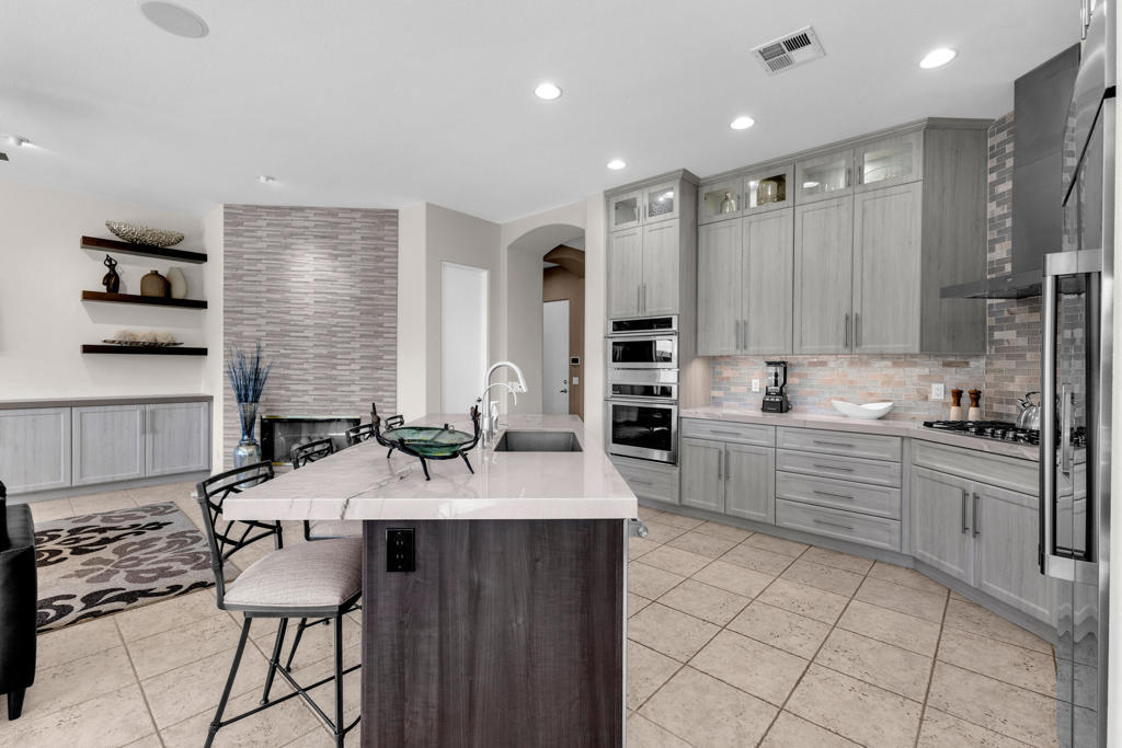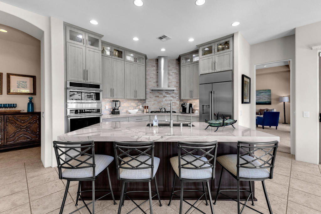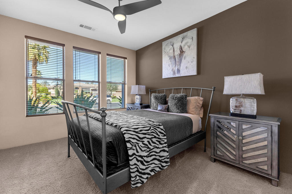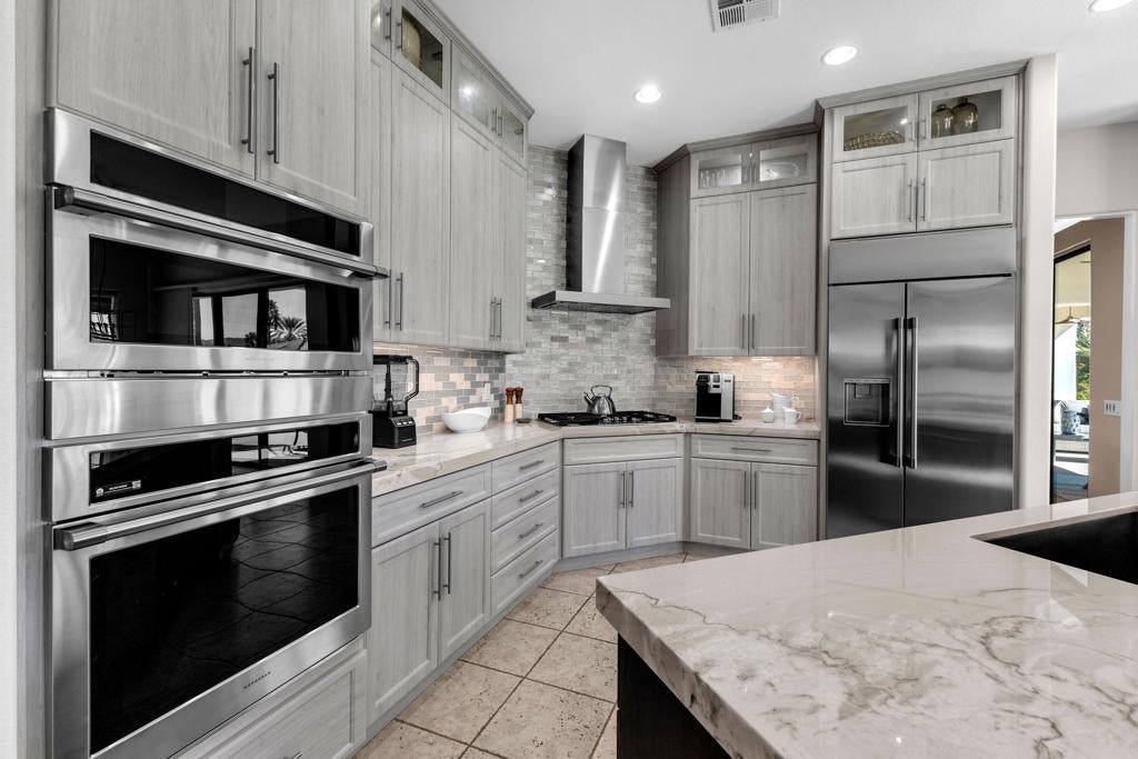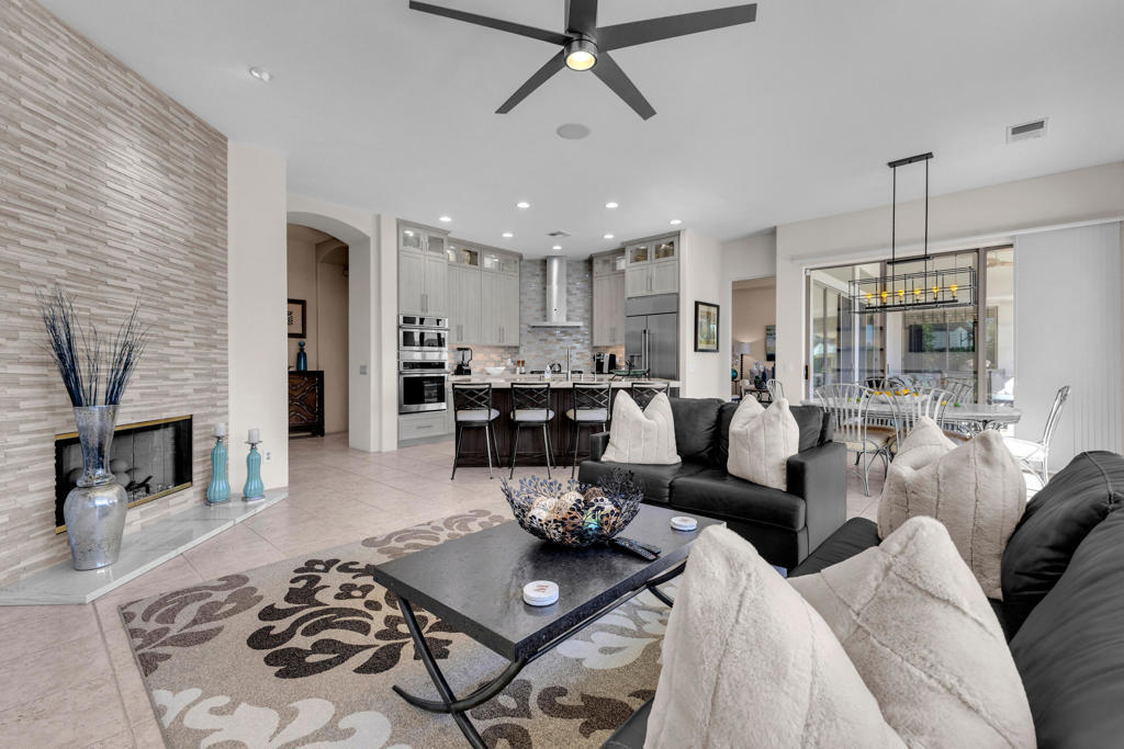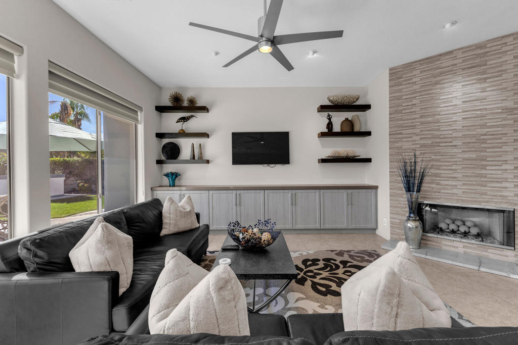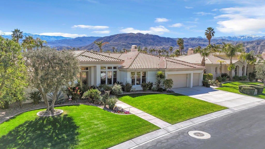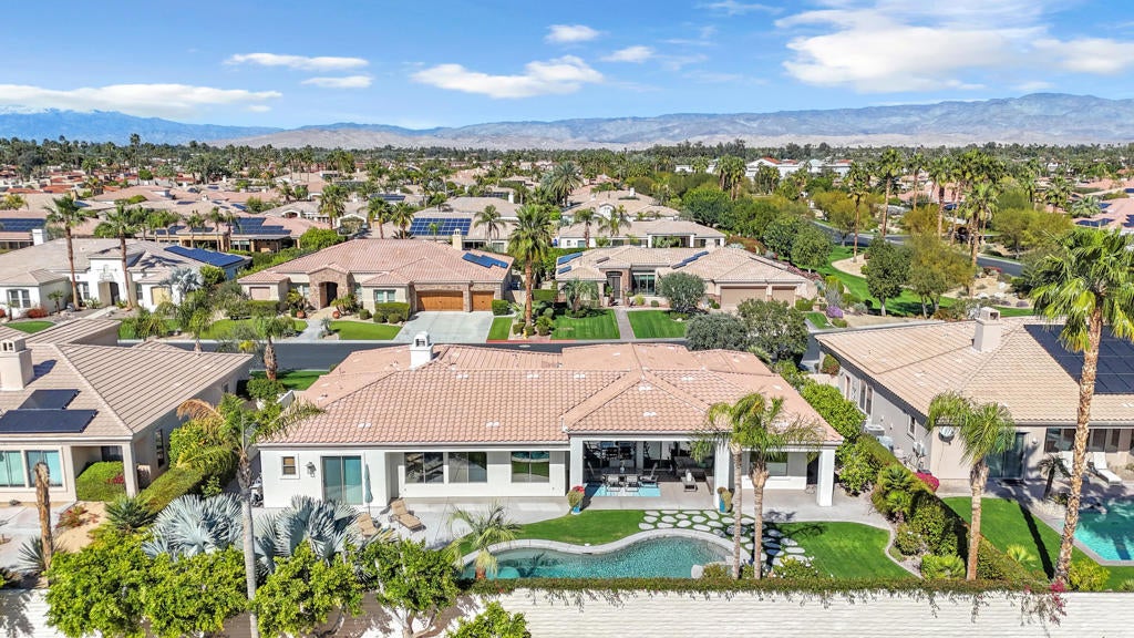 Offered furnished with a new price! Experience gated La Terraza living in this stunning estate with a south-facing backyard and panoramic views of the Santa Rosa and San Jacinto mountains. Enter through custom glass doors into a grand foyer and soaring ceilings that flow through this impeccably maintained home. The interior offers four spacious en-suite bedrooms plus a powder room, separate formal living and dining rooms, and a gourmet chef's kitchen with a huge island and breakfast bar, marble-look quartzite counters, custom subway tile backsplash, light gray soft close cabinetry, custom stainless range hood and top-of-the-line Monogram appliances including a Sub-Zero refrigerator. Relax in the living room by the custom stacked-stone fireplace with built-ins, and enjoy custom paint, lighting, blinds and ceiling fans throughout. The expansive primary suite features a private retreat, custom entertainment center and shelving, his-and-hers closets, and a luxurious bath with a large Roman tub, travertine shower and dual vanities. Outside is a true desert oasis with a sparkling saltwater pool and spa with waterfall, outdoor kitchen, immaculate landscaping and fruit trees. Pride of ownership, clean, move-in ready and a must-see to fully appreciate the views and finishes. Close to golf, shopping and restaurants.