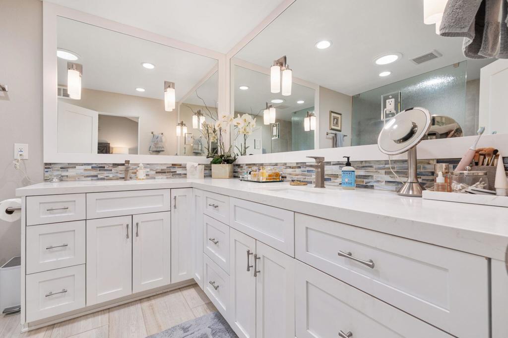 This fully renovated Sideyard property has been completely re-imagined into the perfect desert getaway. During the renovation, the East wall of the property was extended into the Sideyard affording spacious, well-designed living areas with professional, custom finishes throughout. Designer tile flooring & paint, ceiling fans, recessed lighting, energy efficient windows & sliders, motorized shades in living areas, and recessed, top lit, hall display. Gorgeous, raised ceiling, open kitchen with custom cabinetry & counters, matching stainless appliances, gas cook top, and insta-hot at the sink. Atrium has been converted and the laundry room has been expanded. Wonderful cabinetry, tile, lighting & hardware in remodeled baths too. Primary bedroom includes an added walk-in closet and private sitting area. Professionally landscaped private Sideyard provides a beautiful entry and is the perfect setting for entertaining family & friends. Finished 2-car garage with adjacent golf cart garage features Swisstrax flooring, small work bench, additional storage, and a refrigerator. Golf cart included! 27 holes of golf, sports center with tennis, fitness, pickleball and bocce courts, and 37 pools and spas around the community for your enjoyment. Offered designer furnished per inventory.
