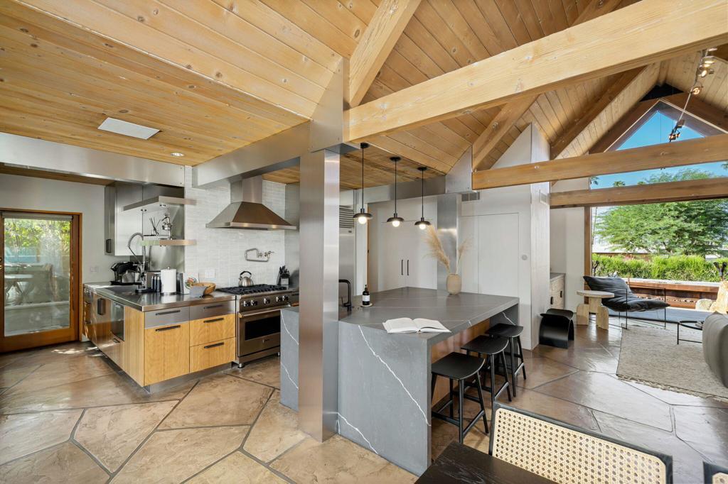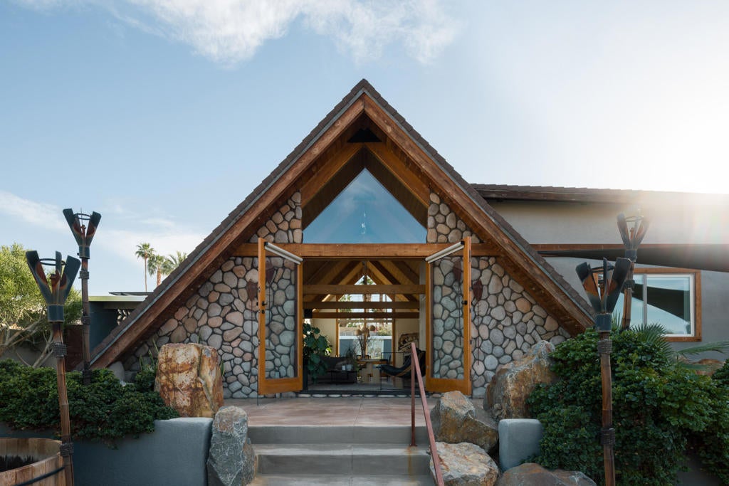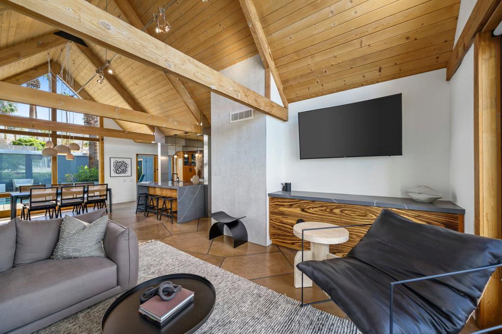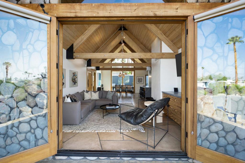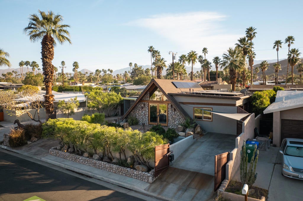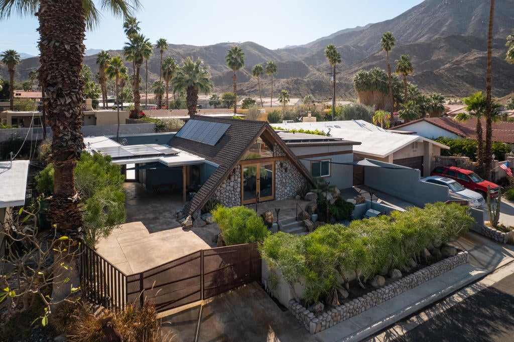 Experience one of the desert's rarest Mid-Century Modern architectural gems! This striking modern A-Frame retreat blends iconic design with cutting-edge sustainability. Featuring 2 bedrooms plus an attached casita, the home showcases dramatic wood beam ceilings, floor-to-ceiling glass, and an airy open-concept layout that frames breathtaking mountain views from both north and south exposures. The gourmet kitchen is equipped with premium appliances, making it both functional and stunning.Outdoors, the property is designed for unforgettable entertaining and total privacy. The pool and lounge area serve as the centerpiece, complemented by a private sunken gathering space behind the gated drive, complete with tiki torches and a sculptural Corten steel gas fireplace. A newly added wooden spa on the front patio creates an additional sanctuary for relaxation under the desert sky.This residence is not just visually extraordinary, it's also an advanced Net-Zero home with owned solar (43 panels), a large backup battery system, EV charger, and energy-efficient heat pumps that both heat and chill the saltwater pool. With negative electricity usage and a whole-home water filtration system it delivers luxury with sustainability and healthy living at its core.Located within walking distance to premier dining, shopping, and everyday conveniences, this furnished architectural showpiece offers a rare opportunity to own one of the area's few true A-Frame homes. An inspired blend of design, innovation, and lifestyle.