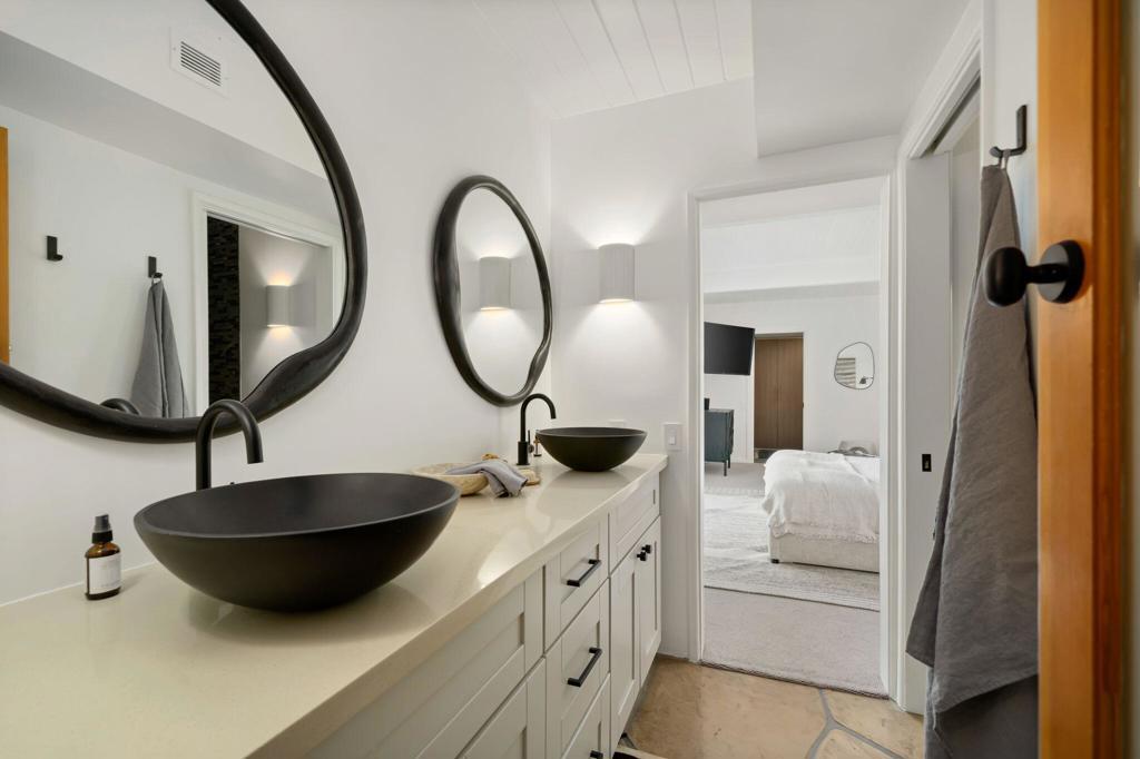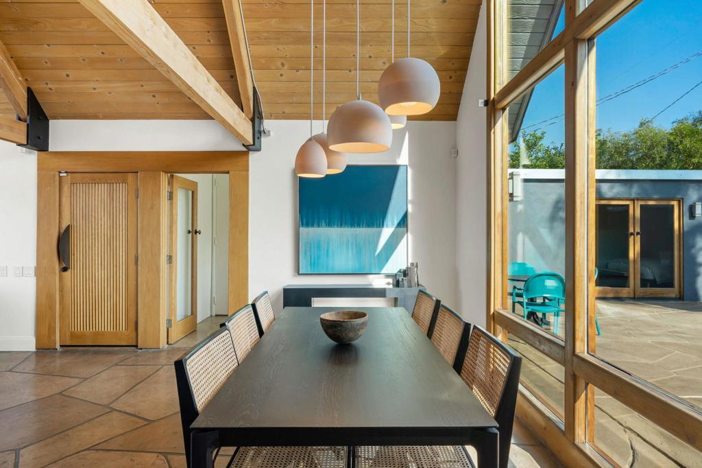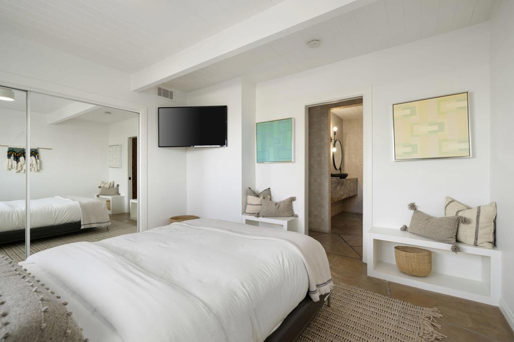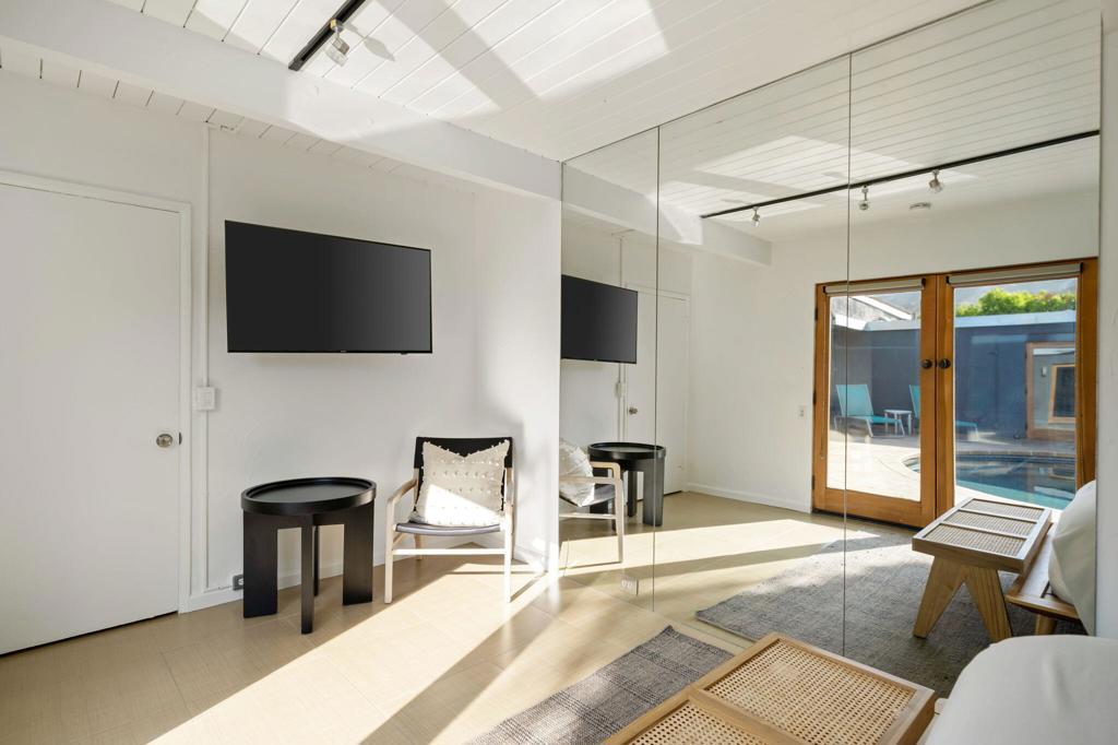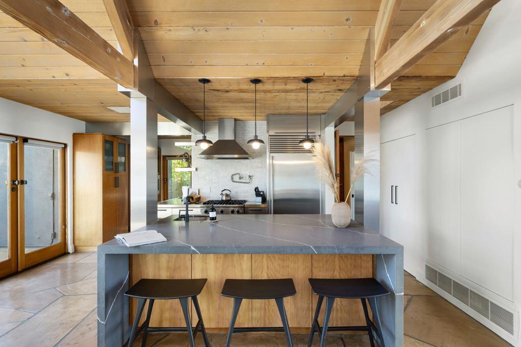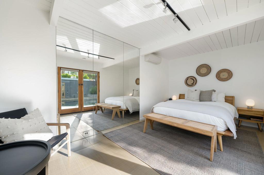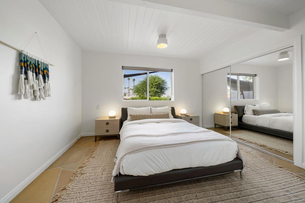Experience one of the desert's rarest Mid-Century Modern architectural gems! This striking modern A-Frame retreat blends iconic design with cutting-edge sustainability. Featuring 2 bedrooms plus an attached casita, the home showcases dramatic wood beam ceilings, floor-to-ceiling glass, and an airy open-concept layout that frames breathtaking mountain views from both north and south exposures. The gourmet kitchen is equipped with premium appliances, making it both functional and stunning.Outdoors, the property is designed for unforgettable entertaining and total privacy. The pool and lounge area serve as the centerpiece, complemented by a private sunken gathering space behind the gated drive, complete with tiki torches and a sculptural Corten steel gas fireplace. A newly added wooden spa on the front patio creates an additional sanctuary for relaxation under the desert sky.This residence is not just visually extraordinary, it's also an advanced Net-Zero home with owned solar (43 panels), a large backup battery system, EV charger, and energy-efficient heat pumps that both heat and chill the saltwater pool. With negative electricity usage and a whole-home water filtration system it delivers luxury with sustainability and healthy living at its core.Located within walking distance to premier dining, shopping, and everyday conveniences, this furnished architectural showpiece offers a rare opportunity to own one of the area's few true A-Frame homes. An inspired blend of design, innovation, and lifestyle.
