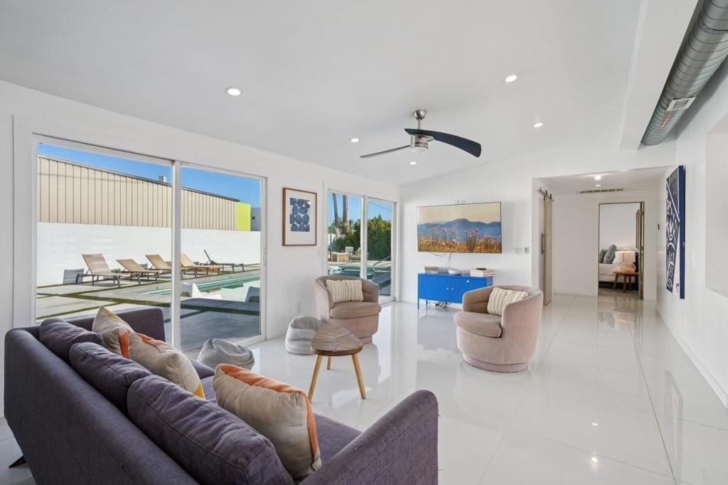 Fully remodeled and TURN-KEY, this vibrant mid-century home is move-in ready and waiting for you to start living the Palm Springs dream! Tucked away at the end of a quiet cul-de-sac and just minutes from the excitement of Downtown Palm Springs, this ultra-chic, fully updated 3 bedroom, 2 bath, 1,750 SF home is the ultimate desert retreat--and an incredible SHORT TERM RENTAL opportunity! Set on a massive west-facing lot with stunning San Jacinto Mountain views, this property is designed to impress inside and out. The backyard is a true oasis, complete with a sparkling heated saltwater pool and spa, built-in BBQ, ample poolside seating, and a private fire pit--perfect for unforgettable gatherings under the desert sky.Step inside to sleek, modern design blended with rich textures and nods to the home's original mid-century roots, now refreshed with all-new amenities for today's lifestyle. The chef's kitchen is a showstopper, featuring high-end stainless steel appliances, a spacious eat-at island/bar, and an open flow into the great room--ideal for entertaining. Each bedroom is stylishly designed and filled with natural light, creating warm and inviting spaces throughout the home. The expansive primary suite is a true retreat, featuring direct access to the pool, a sleek wall-mounted fireplace for a cozy ambiance, and a show-stopping en-suite bath. The bathroom is finished with modern, high-end details, including a seamless walk-in shower with floor-to-ceiling tile, penny round tile floor, a wall-mounted toilet, and polished chrome fixtures--delivering both luxury and sophistication. With peak season rental rates around $450 per night, this property isn't just a home, it's a lucrative investment opportunity and a dream vacation destination all in one. Whether you're looking for a high-performing short-term rental, a desert getaway, or a stylish year-round residence, this Palm Springs stunner checks every box!