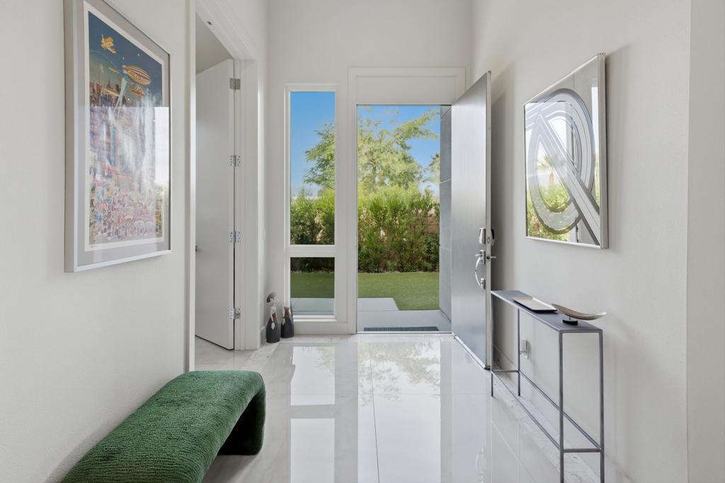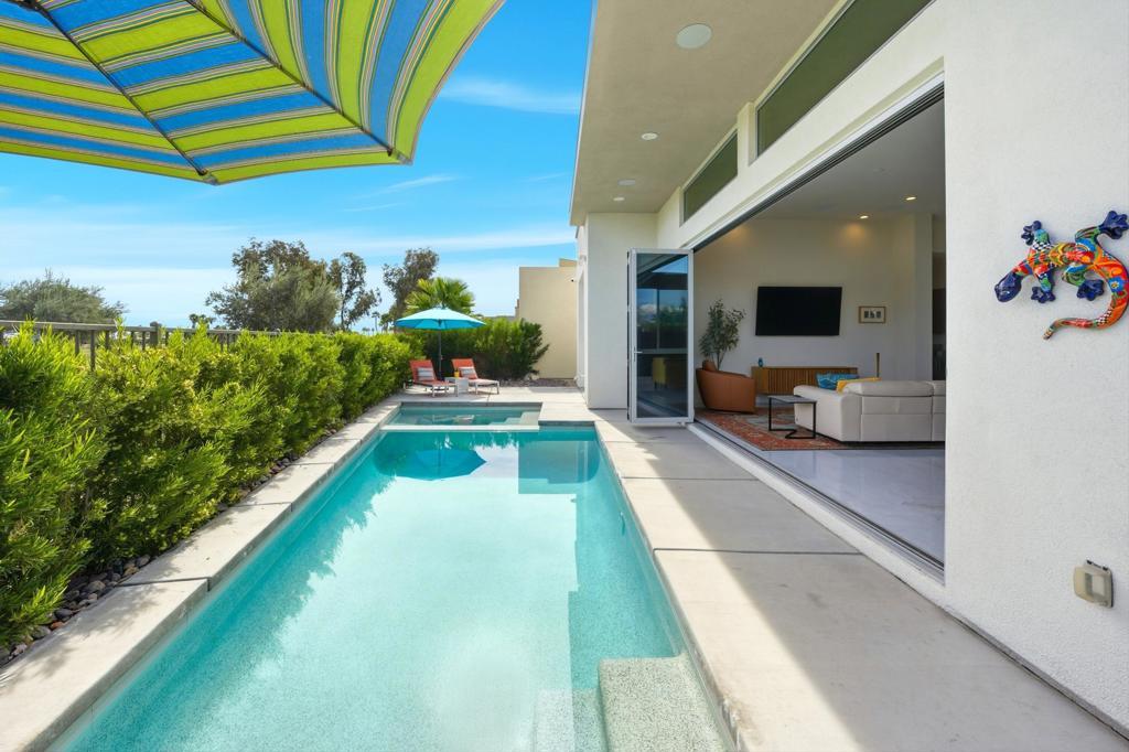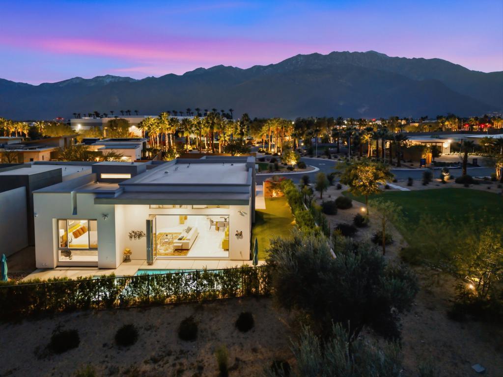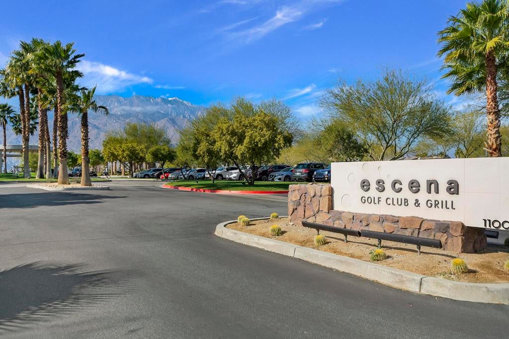 This stunning, elegant modern home with panoramic mountain views is in the gated community of Escena. Built in 2020, the 2,561 sq. ft. residence offers luxurious living space on a corner lot situated on the 2nd fairway of the esteemed Escena golf course in Palm Springs. Featuring 3 bedrooms and 3 bathrooms, this highly upgraded home showcases an open-concept design with dramatic 12-foot ceilings and expansive living spaces filled with natural light. Elegant La Faenza Italian porcelain tile flooring flows throughout, creating a sleek, modern aesthetic. The chef's kitchen showcases premium KitchenAid commercial-grade stainless steel appliances, an oversized center island, quartz countertops, marble tile backsplash, upgraded fixtures and under-cabinet lighting. The heart of the home opens beautifully to the outdoors with a retractable wall of La Cantina bifold stacking doors creating a seamless transition to the patio and pool area - perfect for true indoor-outdoor living. The primary suite features a spa-inspired bath with an expansive walk-in rain shower, custom Carrara marble tile walls and heated floors. The suite is completed with dual vanities, a large walk-in closet designed by California Closets and automated blackout blinds. A second guest bedroom offers privacy and comfort with its own ensuite bath, dual vanity, custom shower, and blackout blinds. The third bedroom is versatile - ideal as an office or guest space - highlighted by a custom 9-foot solid double door entry. Step outside to your private resort-style backyard complete with a pool and spillover spa, enhanced by a Pentair pool and spa automation system for effortless control, a generous 720 sq ft of pet-friendly artificial turf, providing low-maintenance beauty and play space. Both the front and back yards have been newly landscaped, and the front door & custom front gate includes an internet-enabled lock for modern security and convenience. Additional features include Control 4 home automation system, water filtration & softening system, separate laundry room with built-in cabinetry and utility sink, and a 2-car garage with an insulated door & level 2 EV car charger. Set directly on the golf course within one of Palm Springs' most desirable gated communities, this home delivers contemporary elegance, smart technology, and true resort-style living.