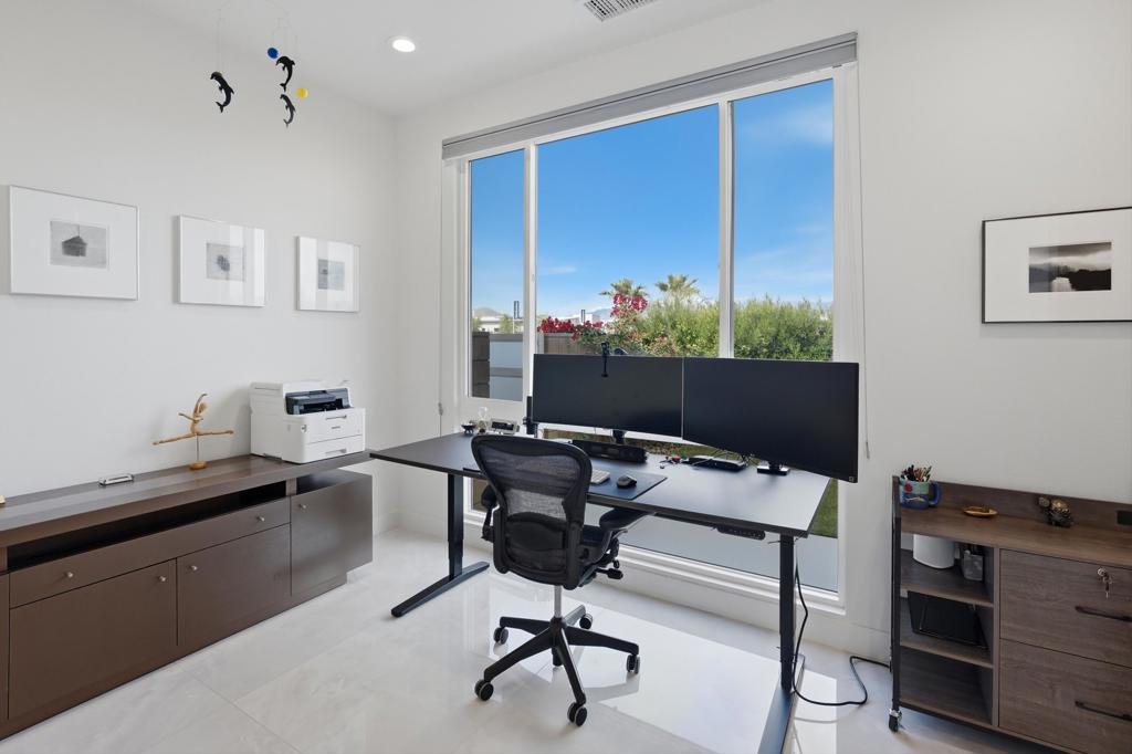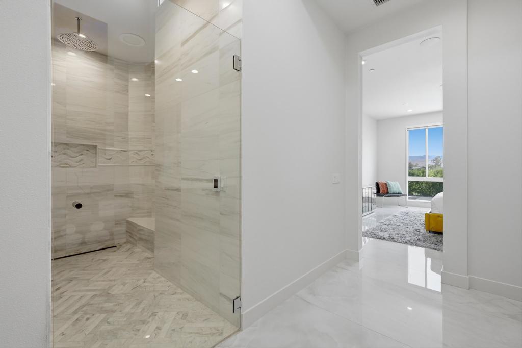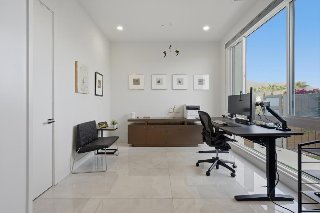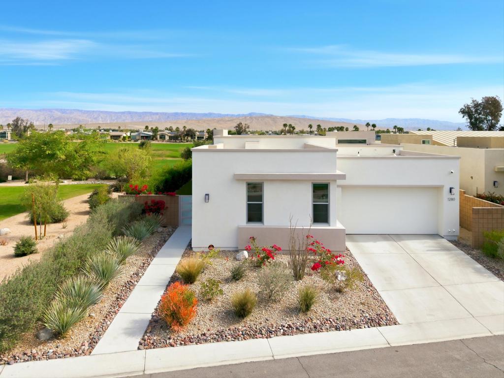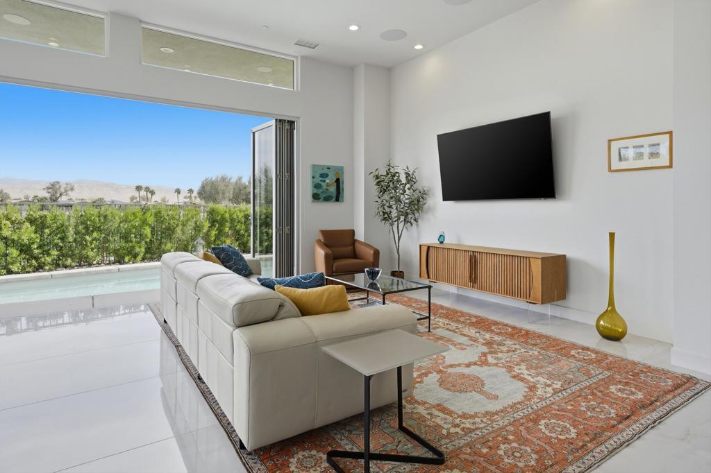 This stunning, elegant modern home with panoramic mountain views is in the gated community of Escena. Built in 2020, the 2,561 sq. ft. residence offers luxurious living space on a corner lot situated on the 2nd fairway of the esteemed Escena golf course in Palm Springs. Featuring 3 bedrooms and 3 bathrooms, this highly upgraded home showcases an open-concept design with dramatic 12-foot ceilings and expansive living spaces filled with natural light. Elegant La Faenza Italian porcelain tile flooring flows throughout, creating a sleek, modern aesthetic. The chef's kitchen showcases premium KitchenAid commercial-grade stainless steel appliances, an oversized center island, quartz countertops, marble tile backsplash, upgraded fixtures and under-cabinet lighting. The heart of the home opens beautifully to the outdoors with a retractable wall of La Cantina bifold stacking doors creating a seamless transition to the patio and pool area - perfect for true indoor-outdoor living. The primary suite features a spa-inspired bath with an expansive walk-in rain shower, custom Carrara marble tile walls and heated floors. The suite is completed with dual vanities, a large walk-in closet designed by California Closets and automated blackout blinds. A second guest bedroom offers privacy and comfort with its own ensuite bath, dual vanity, custom shower, and blackout blinds. The third bedroom is versatile - ideal as an office or guest space - highlighted by a custom 9-foot solid double door entry. Step outside to your private resort-style backyard complete with a pool and spillover spa, enhanced by a Pentair pool and spa automation system for effortless control, a generous 720 sq ft of pet-friendly artificial turf, providing low-maintenance beauty and play space. Both the front and back yards have been newly landscaped, and the front door & custom front gate includes an internet-enabled lock for modern security and convenience. Additional features include Control 4 home automation system, water filtration & softening system, separate laundry room with built-in cabinetry and utility sink, and a 2-car garage with an insulated door & level 2 EV car charger. Set directly on the golf course within one of Palm Springs' most desirable gated communities, this home delivers contemporary elegance, smart technology, and true resort-style living.