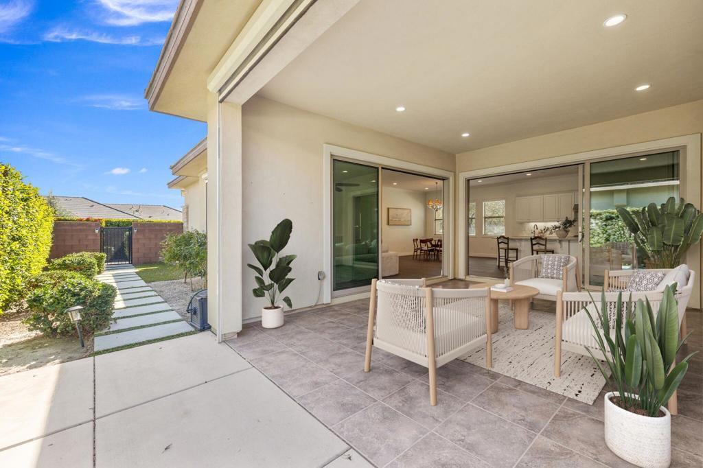 Positioned on a prime corner homesite within the ALL-AGES section of Trilogy at The Polo Club, this thoughtfully upgraded ONE-level residence captures the essence of elevated desert living. Framed by sweeping south- and west-facing views of the Santa Rosa Mountains and bordered by two expansive greenbelts, the setting offers a rare combination of openness and privacy.Spanning approximately 1,902 square feet, the Solare floor plan is designed for effortless everyday living and seamless entertaining. NEWLY PAINTED THROUGHOUT. The heart of the home is a stunning, light-filled great room anchored by a chef-inspired kitchen featuring striking quartz surfaces, soft-toned cabinetry, and stainless steel appliances. Expansive rolling glass doors dissolve the boundary between indoors and out, opening to a generous covered patio complete with an electric screen--perfect for gatherings, quiet evenings, or simply soaking in the mountain backdrop.A versatile Smart Space adds both function and flexibility, offering extensive storage, abundant natural light, and dual workstations ideal for remote work, creative pursuits, or organized living. The primary suite serves as a private sanctuary with a spacious walk-in closet and a beautifully upgraded walk-in shower. A separate den or office overlooks the rear patio and greenbelt, creating a tranquil setting for productivity or relaxation.Outdoor enjoyment extends to the welcoming front patio, enhanced with turf and desert-friendly landscaping--an inviting place to unwind and take in colorful desert sunsets.Additional highlights include SheaXero SOLAR, designed to offset annual electricity costs for approximately the next decade. Located just moments from the Polo Club clubhouse, the home provides convenient access to exceptional amenities. A membership is available, and the seller is offering a credit of up to $20,000 toward the membership initiation fee.Membership unlocks access to the 25,000-square-foot clubhouse, featuring a state-of-the-art fitness center, tennis and pickleball courts, resort and lap pools, an indoor golf simulator, and a vibrant calendar of social events. Residents also enjoy on-site dining at June Hill's Table, all set against the breathtaking Santa Rosa Mountain backdrop.This is an exceptional opportunity to experience sophisticated, resort-inspired living in one of Indio's premier communities.