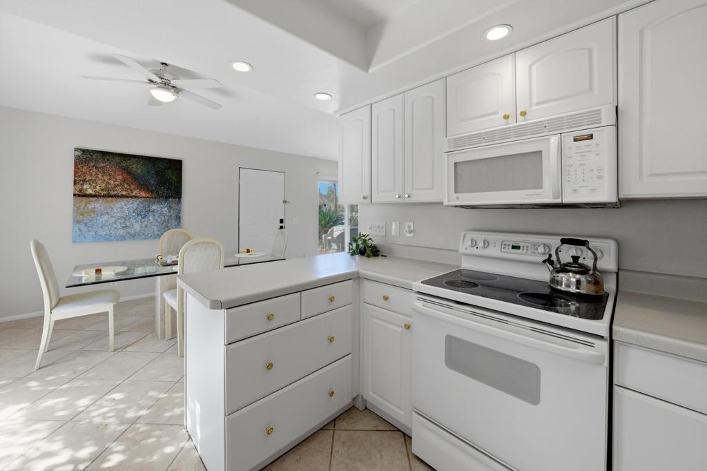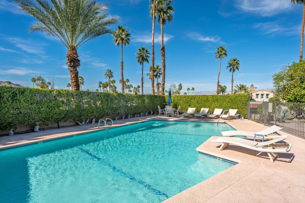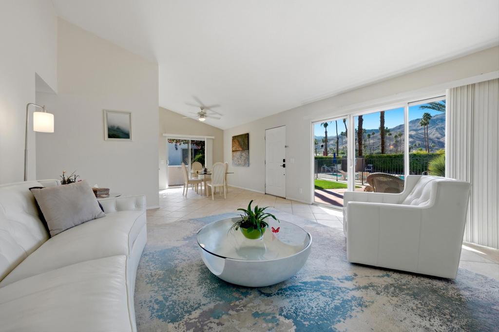 Price reduced by $5K! Discover exceptional charm, comfort, and location in this beautifully situated single-level home just moments from world-famous El Paseo. Offering breathtaking mountain views from the living room's expansive sliders, the front door, and the inviting front patio, this home captures the very best of desert living -- from morning coffee sunrises to glowing sunset skies.Perfectly positioned right next to the sparkling community pool, it feels like having your own private pool without the maintenance. Simply step outside and enjoy resort-style living whenever you choose. Inside, you'll find two spacious bedrooms, vaulted ceilings that create an airy open feel, tile flooring throughout for easy desert living, and convenient indoor laundry for added comfort and practicality.The light-filled living space frames the mountains beautifully, making the views part of your everyday experience. The private-feeling backyard offers a peaceful retreat with a lush grassy area ideal for relaxing or entertaining. The community also features a sparkling pool and abundant fruit trees, adding to the serene atmosphere. Located just off Frontage Road for easy access, you're within walking distance to El Paseo's upscale shopping, fine dining, galleries, and entertainment, and only minutes to hiking trails, golf courses, and all the outdoor activities Palm Desert is known for. With assigned parking, guest spaces, and low HOA dues, this is an incredible opportunity for full-time living, a seasonal getaway, or an investment property. A rare South Palm Desert gem offering views, walkability, and effortless desert lifestyle. Make an appointment to see it today!