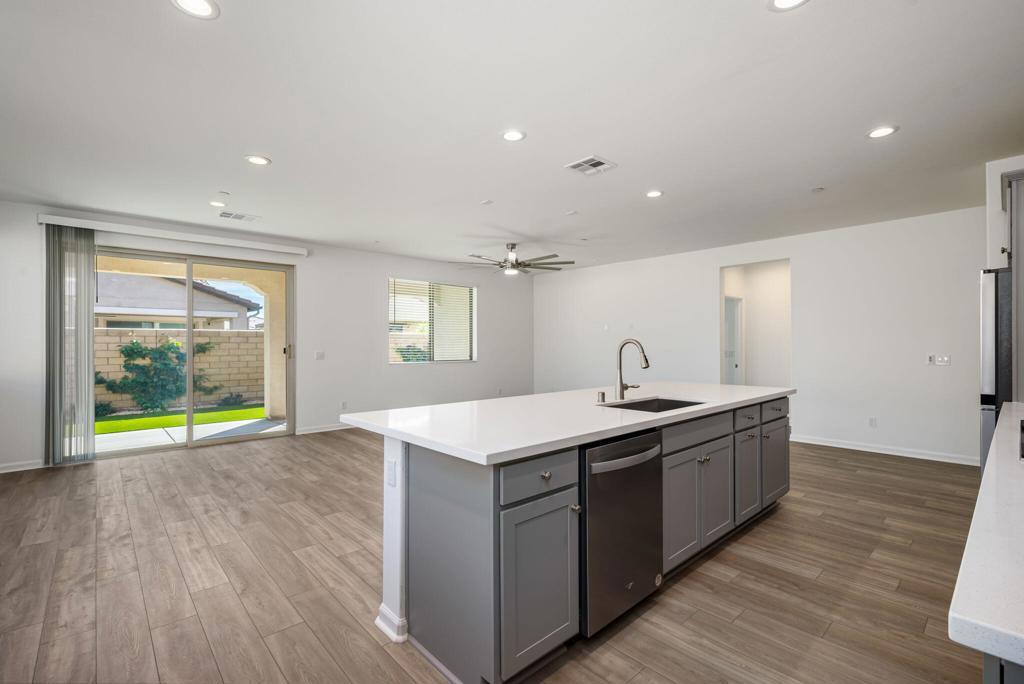 Welcome to refined desert living in this beautifully crafted newer construction residence, located in the attractive Domani Palm Desert, perfectly positioned within a sought-after 55+ community. Thoughtfully designed for both comfort and style, this impressive home offers 3 generously sized bedrooms and 2 contemporary baths, along with the added value of a solar system and cost-efficient IID electric. Step inside to an airy open-concept floor plan highlighted by abundant natural light, recessed lighting, and a designer kitchen featuring stainless steel appliances, quartz countertops, a gas cooktop, expansive pantry, sleek gray cabinetry, and an oversized center island with seating--ideal for effortless entertaining and everyday living. The elegant primary suite serves as a private retreat with a spa-inspired en-suite bath, dual vanities, a glass-enclosed shower, and an expansive walk-in closet, while the secondary bedrooms offer flexibility for guests, hobbies, or a home office. Outdoors, enjoy your own private backyard sanctuary with a covered patio, low-maintenance landscaping, and a built-in BBQ area--perfect for relaxing or hosting gatherings. Located in a peaceful, amenity-rich active adult community near shopping, dining, and recreation, this exceptional home blends modern luxury with the lifestyle today's 55+ buyers are seeking.