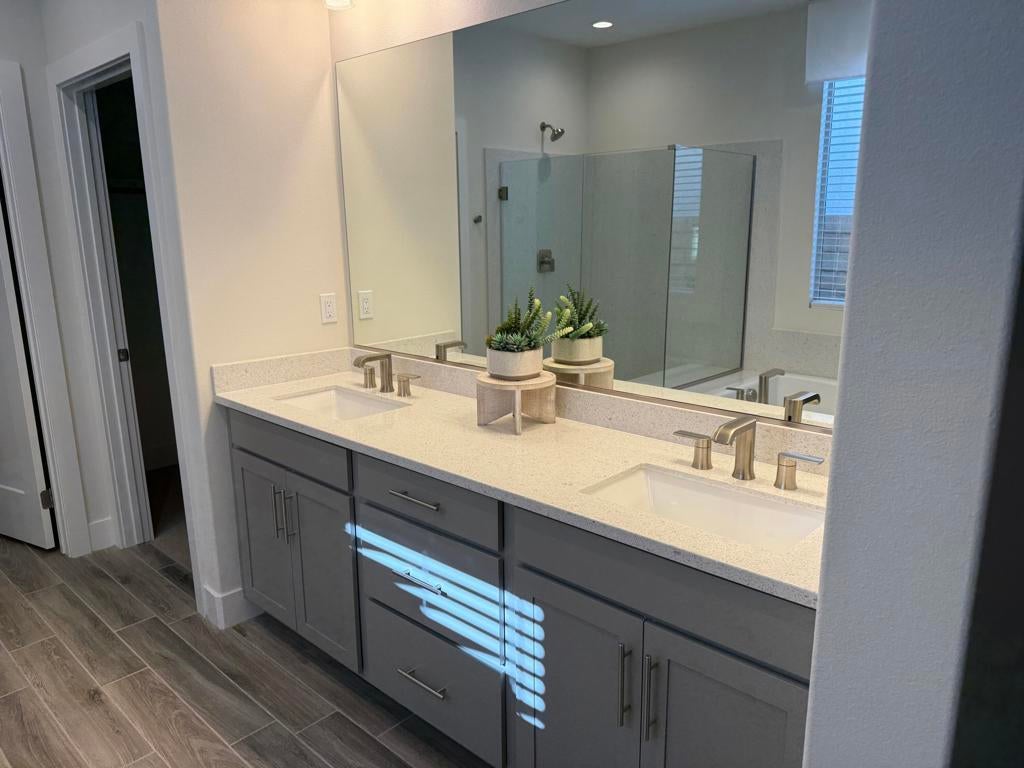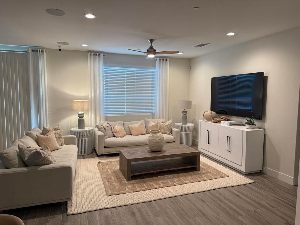 Experience elevated desert luxury in this impeccably crafted newer-construction home in the coveted 55+ community of Domani Palm Desert, where modern sophistication meets effortless resort-style living. This refined residence showcases an airy open-concept design flooded with natural light, featuring recessed lighting, surround sound, and a showpiece chef's kitchen appointed with stainless steel appliances, built-in ovens, quartz countertops, a gas cooktop with custom hood, tile backsplash, sleek gray cabinetry, an expansive pantry, and an oversized island perfect for lively gatherings. Offering 2 spacious bedrooms, 2 chic contemporary baths, and a versatile den/office that easily functions as a third bedroom, the home is further enhanced by a money-saving solar system and IID electric. The luxurious primary suite creates a serene retreat with its spa-inspired bath, dual vanities, glass-enclosed shower, soaking tub, and generous walk-in closet, while the secondary bedroom provides ideal flexibility for guests or hobbies. Step outside to your private backyard oasis with a covered patio, low-maintenance landscaping, and a built-in BBQ--an inviting setting for relaxation or entertaining under the desert sky. Set within a tranquil, amenity-rich active adult enclave offering a community pool, clubhouse, and proximity to premier shopping, dining, and recreation, this exceptional home delivers the modern desert lifestyle today's discerning 55+ buyers desire.