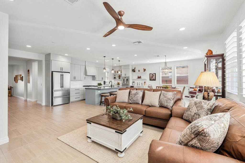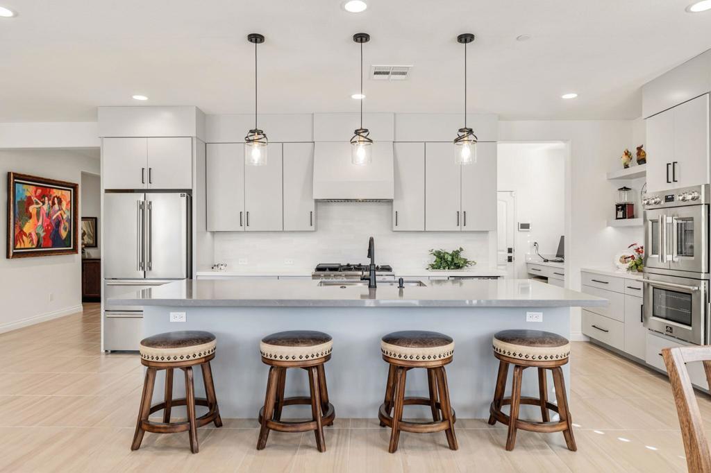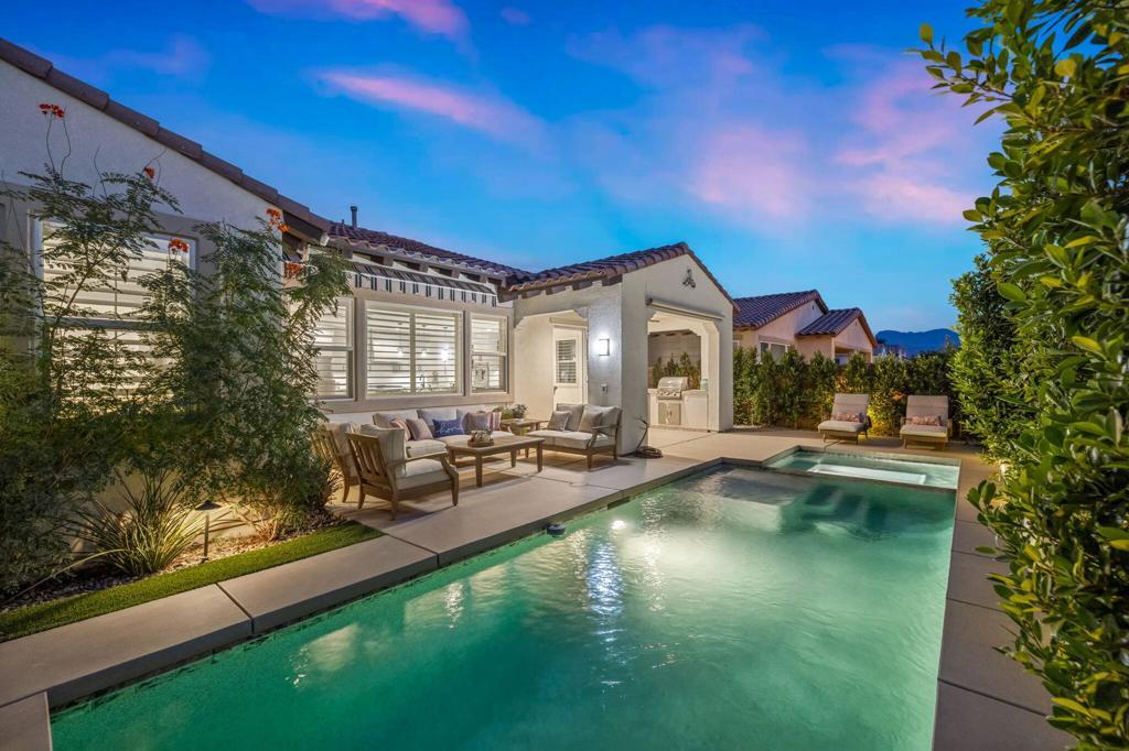 Nestled behind the gates of Floresta, this home stands as one of the most exquisite and fully upgraded residences in the entire community. This 3-bedroom, 2.5-bath masterpiece spans 2,302 sq. ft. of refined luxury, where every inch has been meticulously reimagined with designer precision, cutting-edge upgrades, and a seamless blend of sophistication and comfort.Step inside to discover an open-concept floor plan with soaring ceilings, warm natural light, and elegant finishes throughout. The great room centers around a beautifully tiled feature wall and flows effortlessly into a chef's kitchen that redefines modern elegance. Recently remodeled from top to bottom, it features premium stainless steel appliances--including double ovens, a 6-burner gas cooktop, built-in drawer microwave, and wine refrigerator--anchored by a massive quartz island ideal for entertaining. Custom cabinetry, designer lighting, and detailed tile work elevate the space into a true showpiece.The outdoor living area feels like a private resort. Enjoy a newly upgraded pebble-finish pool and spa, built-in BBQ with refrigerator, two covered patios with electric awnings, and low-maintenance landscaping framed by stunning mountain views and vivid sunsets. Every detail was thoughtfully curated for relaxation and style.The primary suite is a true retreat, featuring a spa-inspired bathroom with a soaking tub, glass-enclosed shower, dual vanities, and an oversized walk-in closet. The two additional bedrooms share a beautifully remodeled Jack and Jill bath, offering guests or family members both comfort and privacy.Additional highlights include a finished 2-car garage with custom cabinetry & epoxy flooring, a separate golf cart garage, tankless water heater, upgraded lighting and flooring throughout, and whole-home smart features.Located within the highly rated Desert Sands Unified School District and just moments from world-class golf, dining, and shopping, this property is ideal as a full-time residence, luxury vacation home, or high-end investment.This is more than just one of the best homes in Floresta--it's the benchmark for modern desert living.