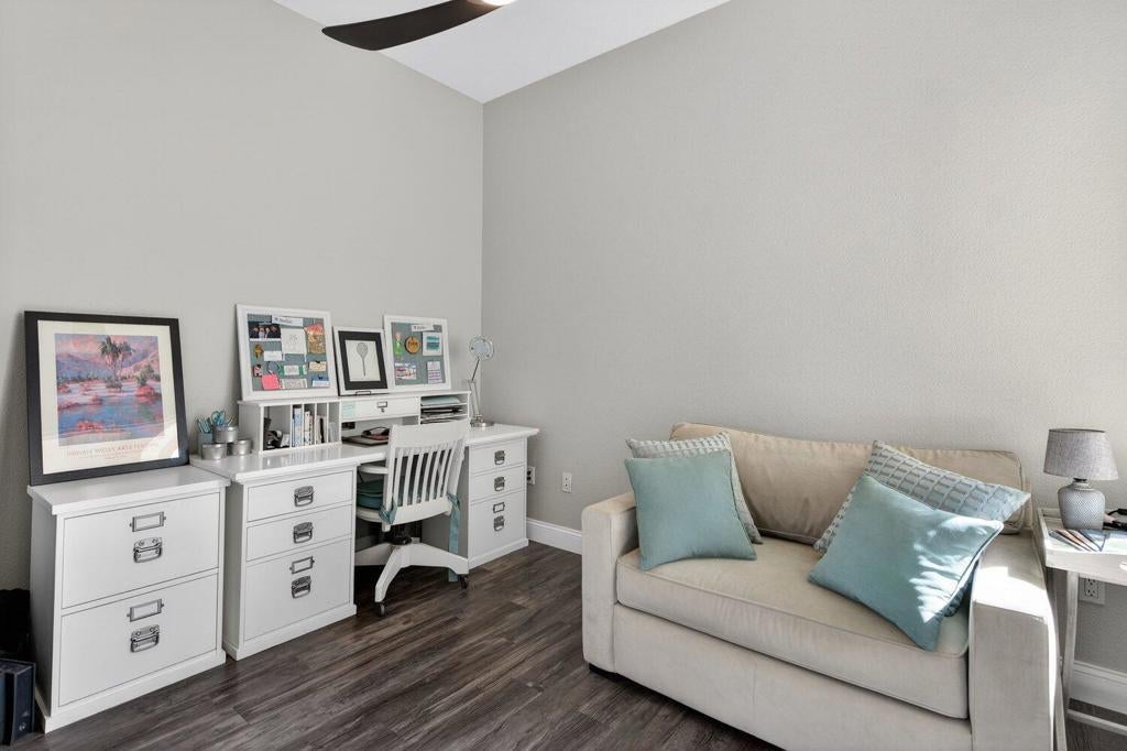 This beautifully updated 1,707 sq. ft. Merion Plan in Heritage Palms Country Club is truly a must-see! Thoughtfully remodeled and meticulously maintained, this home offers the perfect blend of comfort, style, and easy desert living. Step inside to a bright, open, extended great room filled with natural light and anchored by a cozy electric fireplace--perfect for those cool desert evenings. The remodeled chef's kitchen (2023) is the heart of the home, featuring quartz countertops, a custom backsplash, and stainless steel LG appliances. A spacious double-door pantry adds convenience, while the counter seating creates the ideal space for friends and family to gather as you prepare your favorite meals. This popular floor plan offers two bedrooms plus a versatile den. The spacious primary suite showcases elegant beveled ceilings, a large walk-in closet with custom built-ins, and a beautifully remodeled en-suite bath complete with quartz countertops, dual sinks, a shower/tub combination, and a linen closet. Guests will appreciate their own private retreat with built-in closet storage and easy access to the updated guest bath featuring a walk-in shower and quartz countertops. The den, highlighted by double entry doors, provides flexible space for a third bedroom, home office, craft room, or cozy reading retreat. The laundry room includes a utility sink and direct access to the garage, which features epoxy flooring and additional space for a golf cart. Additional upgrades include newer dual-pane windows, laminate flooring, plantation shutters in master bedroom, ceiling fans, a new water heater installed in 2024. Step outside to a beautifully landscaped backyard with artificial turf for low-maintenance enjoyment, along with a fully landscaped front yard. Ideally located close to the clubhouse, this home offers both privacy and convenience. As a resident of Heritage Palms Country Club, you'll enjoy resort-style amenities including an 18-hole championship golf course, fitness center, indoor and outdoor pools, tennis and pickleball courts, an active clubhouse, and a vibrant social calendar. Resort living starts here--don't miss the opportunity to make this exceptional home your own! 🏡🌴