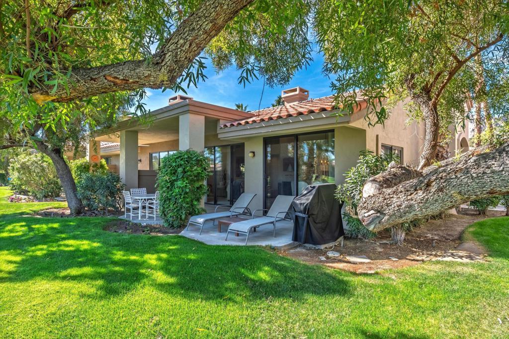 Perfectly positioned on the 7th fairway of the Arnold Palmer Private Course, this beautifully cared-for Champion 3 residence offers sweeping lake and golf course vistas from one of the community's most desirable end-unit locations. Set on a premium lot with the cart path across the water, the home enjoys exceptional privacy while capturing morning sunshine and comfortable shaded afternoons from the east-facing rear patio.This property spans approximately 1,627 square feet and features three bedrooms and two bathrooms. Inside, vaulted ceilings create an open, airy feel throughout the living spaces, complemented by a fireplace, wet bar, formal dining area, and built-in surround sound wiring -- an inviting layout for both relaxing and entertaining. Large windows and thoughtfully placed mirrored accents enhance the natural light and maximize the golf course views.The primary suite offers generous closet space, dual vanities, and direct access to a private courtyard with western exposure -- an ideal setting for quiet mornings or evening sunsets. A covered rear patio overlooks the lake and fairway, delivering the quintessential desert resort experience.Additional highlights include newer water heaters & AC/Heating as well as updated appliances. The property is conveniently located near community pools and spas for easy access to recreation.The HOA provides extensive coverage, including exterior maintenance, roof, paint, landscaping of all yard areas, irrigation water and equipment, trash service, cable and internet, earthquake insurance, and 24-hour guarded security -- allowing for true low-maintenance ownership within one of La Quinta's premier golf communities.