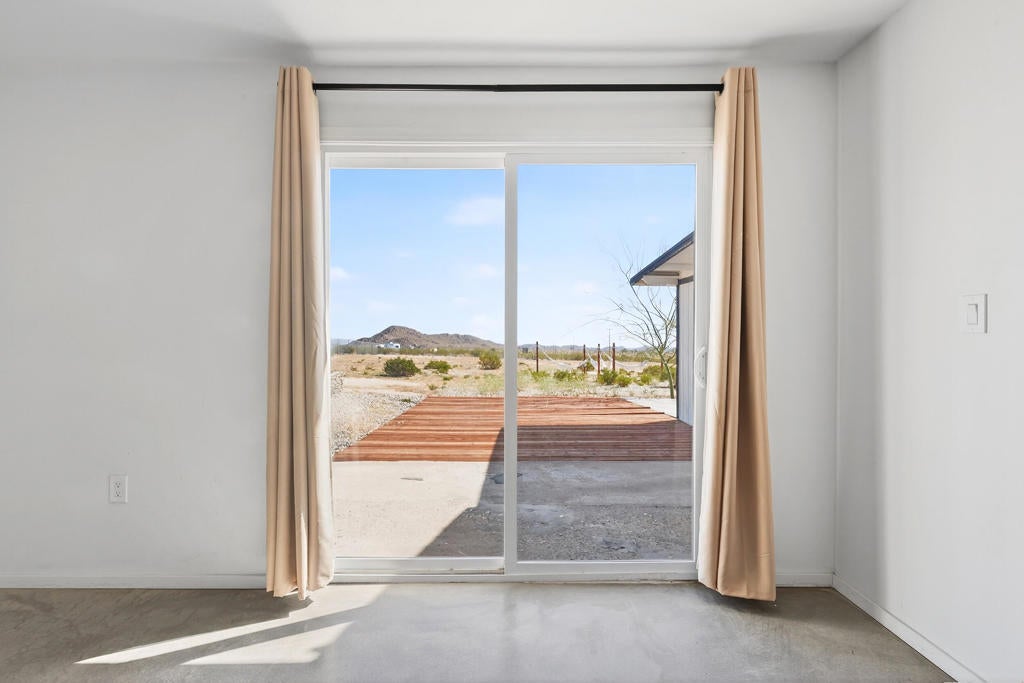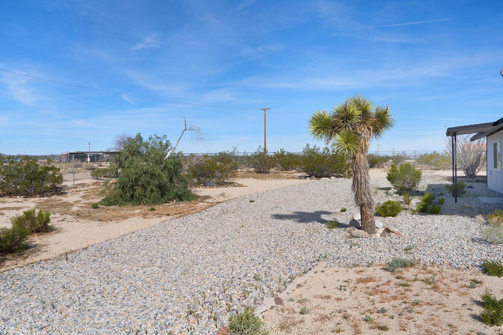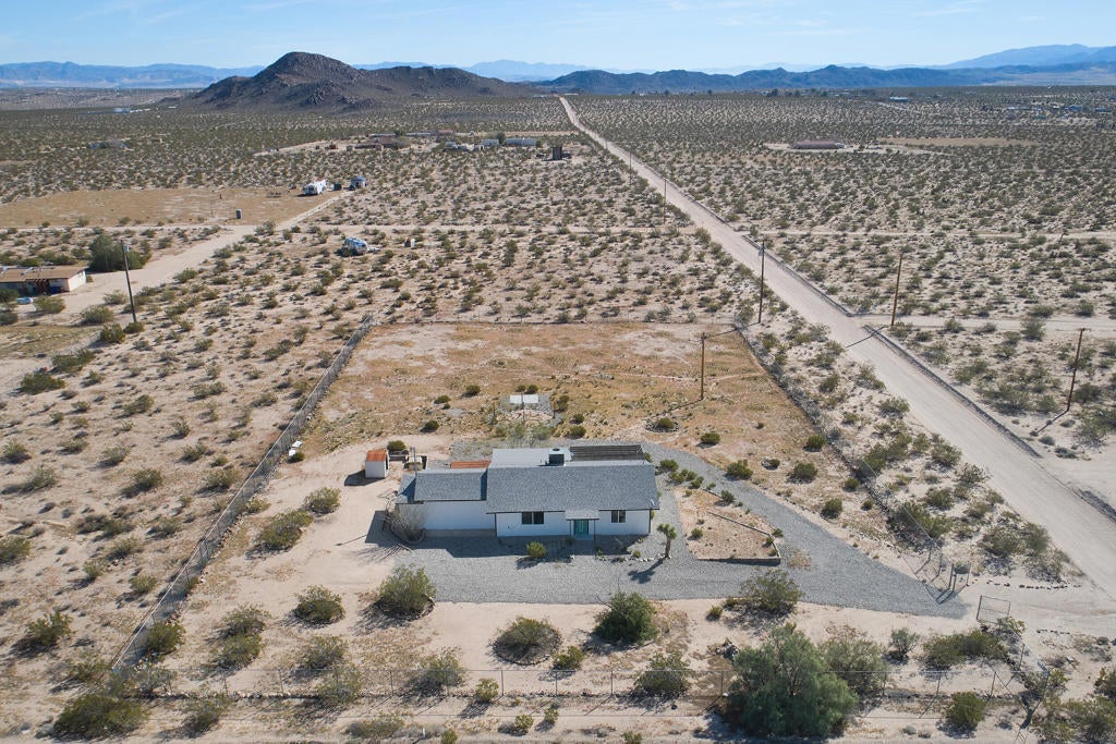 Turn-key remodeled 3 bed 2 bath turn-key designer home in beautiful Joshua Tree directly off a paved road with almost 2 acres of land! Home is surrounded by desert open space views and inspiring mountains. Open the gate to a pebble stone driveway leading to ample parking for many guests. Covered entryway leads to the Narrow Vertical Lite front door. Open concept living room with pristine white walls, finished concrete floors, recessed lighting, and central heat/ac. Spacious dining area with gallery wall accent. Stylish remodeled kitchen with new stainless steel refrigerator, glass-top stove, butcher block counter and breakfast bar, black dual-basin sink and fixtures. White tile backsplash and pendant lighting, complemented by expansive cabinets and generous storage. Master bedroom with separate closets and glass sliders to patio. Private master bath with two vanities. Large glass wall shower with raindrop shower head, marble tile and river rock. Two additional sizable bedrooms. Main bathroom that blends classic contrast with contemporary style. Black fixtures, white walls, white vanity countertop, black-framed mirror, and a tiled shower-tub combination. Bright sunroom with glass sliders bringing the outside in with uplifting vistas of nearby Mt Nebo. Covered patio with slab and string lighting. Expanded patio space with decking and more concrete, perfect for entertaining and dining alfresco. Landscape rock and gravel trails to the quad hammock to relax under the milky way. Over half of the 1.93 acres is fenced with plenty of room for creating the ranch of your dreams. Surrounded by desert ambiance with views of Mt Bartlett, Copper Mtn, Bunker Mtn, and the little San Bernardino Mtns. Inspiring vistas of snow capped peaks on Mt San Gorgonio. Peace and serenity abound. Joshua Tree is seeing more million dollar homes than ever before. Designer remodels and new built modern architecture can be seen throughout the area. Just 12 miles to the Joshua Tree National Monument where about 3 million tourists visit annually. Organic restaurants, bars, shops and the the farmers market at the JT Village. More amenities in Yucca Valley. 1 hour to Palm Springs. 2 and a half hours to Los Angeles. Perfect for full time residence, STR, rental, and investment. Don't Wait! - Call Now!