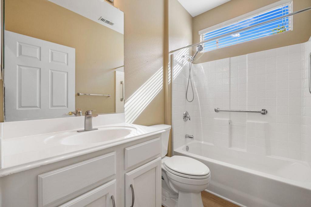 This beautifully refreshed Newport Model in Sun City Palm Desert offers an inviting atmosphere with a soft, neutral interior palette and durable wood-style laminate flooring throughout the main living areas, with carpeting reserved for the bedrooms.The remodeled kitchen showcases crisp white cabinetry, solid surface countertops, and a full suite of stainless steel appliances, creating a bright and functional cooking space. The generously sized primary suite features a charming bay window alcove--perfect for a reading nook, small office setup, or sitting area. The en suite bath includes dual sinks, a walk-in shower, a white vanity, and a spacious walk-in closet. A well-positioned guest bath conveniently doubles as a powder room for visitors.Additional highlights include custom window coverings, ceiling fans throughout, and the builder-option extended garage offering extra space for a golf cart, workshop area, or added storage. A brand-new tankless water heater has also been recently installed.Ideally located within a section of the community that enjoys its own private neighborhood pool, this home offers both comfort and convenience. HOA dues include internet service, cable TV, and access to the nearby community pool. The property is just moments from the residents-only south gate for quick entry and exit, and close to the convenient golf cart and pedestrian access gate leading to Stater Bros., dining, banking, and additional shopping options.