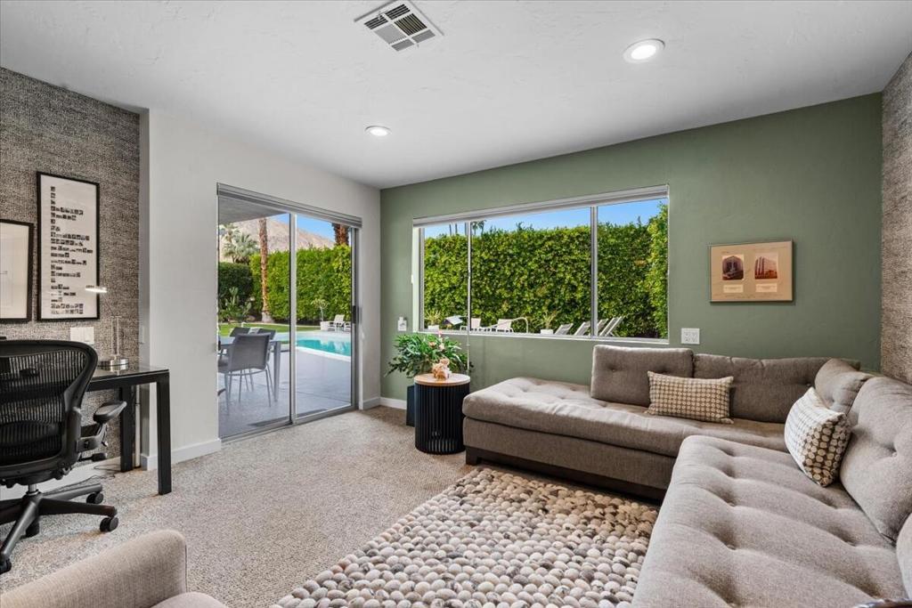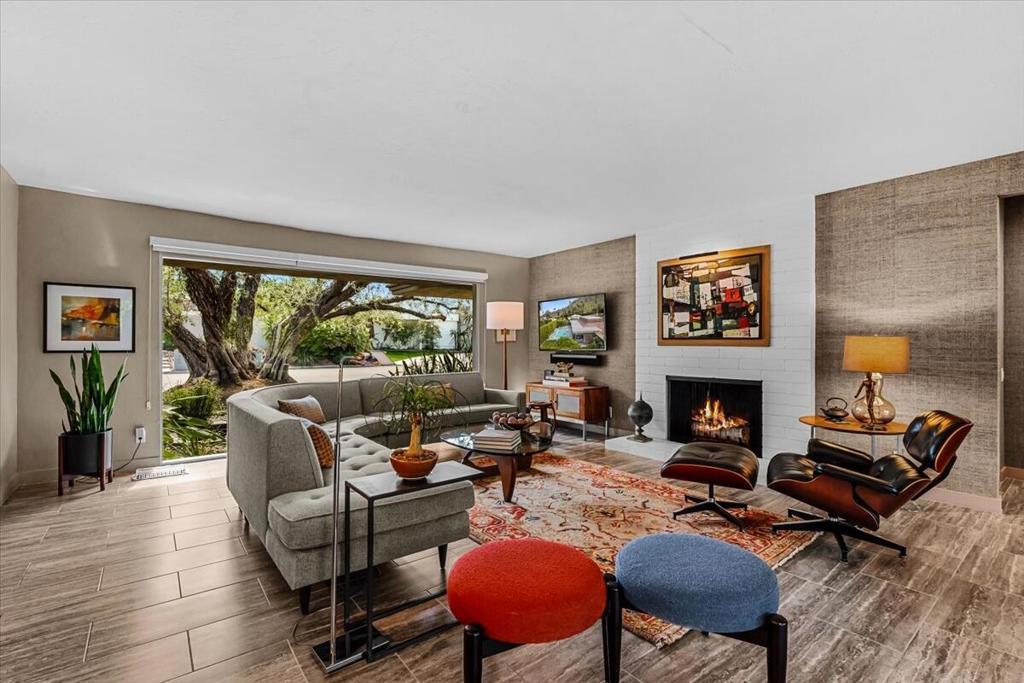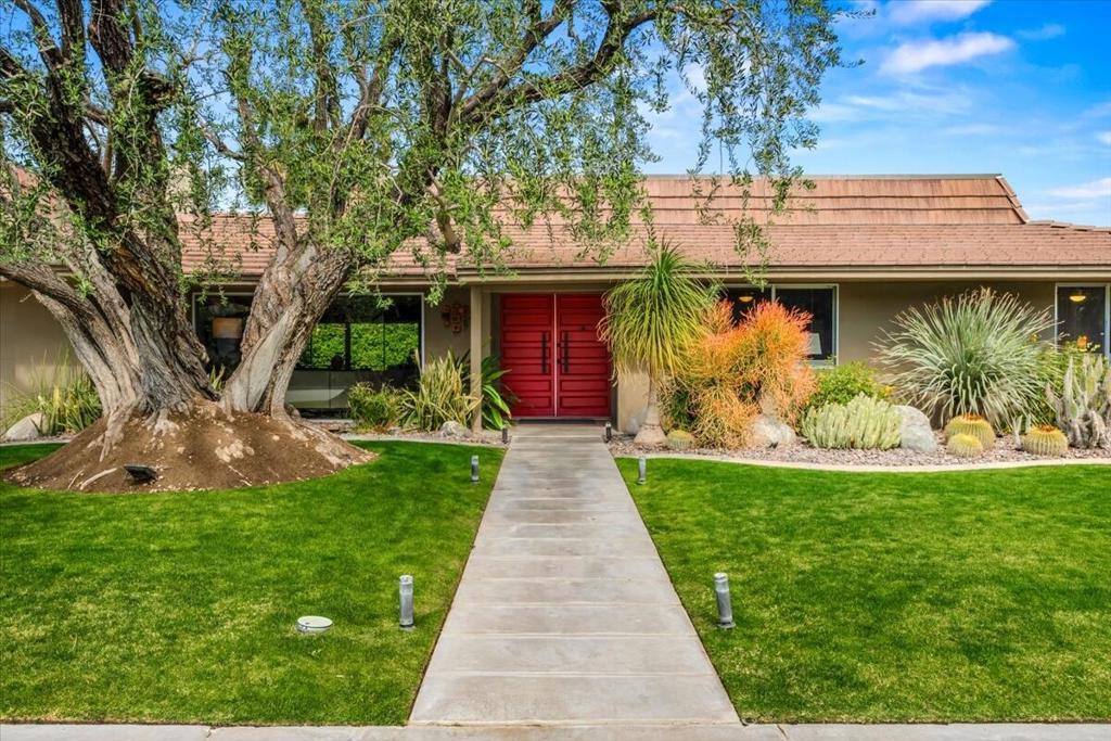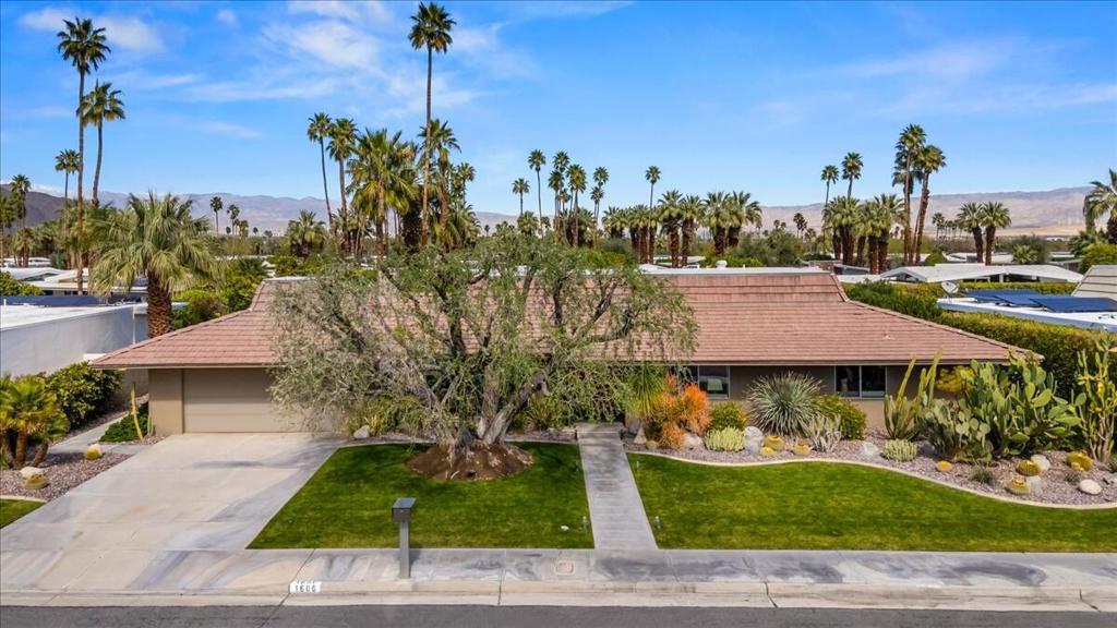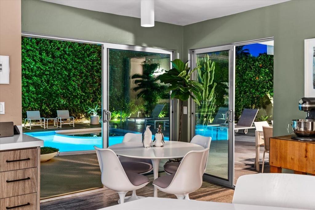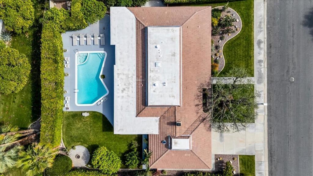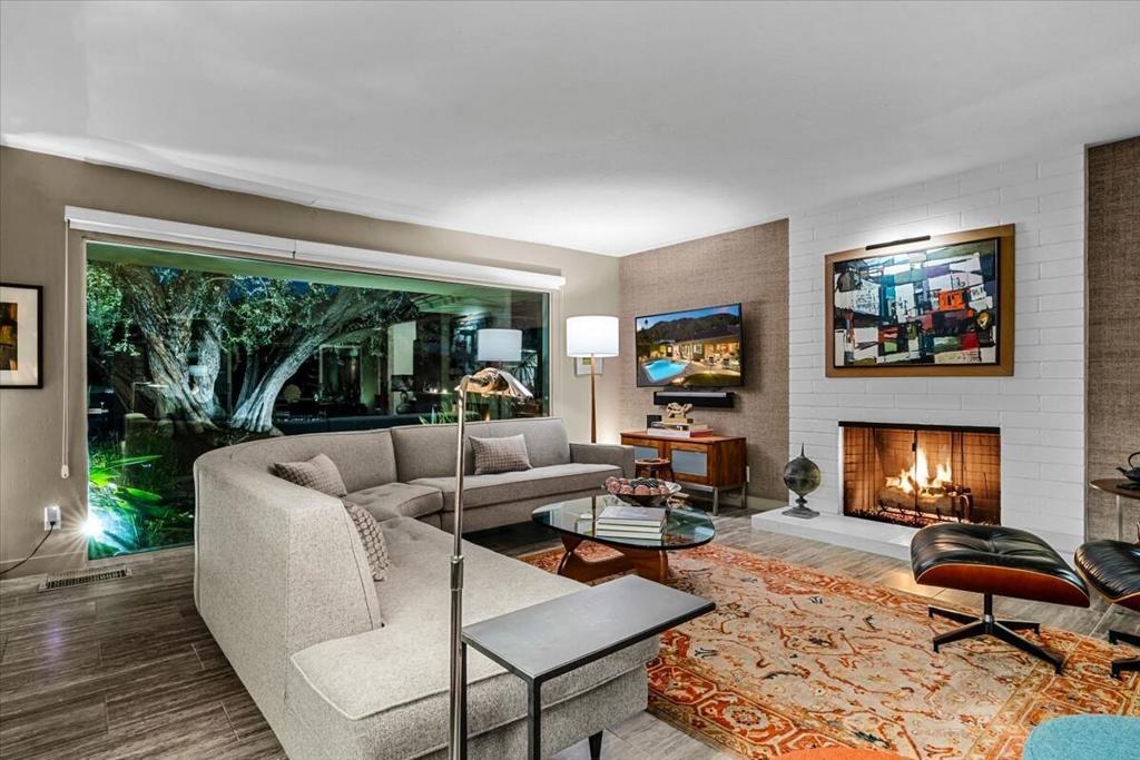 This spectacular Indian Canyons gem was designed by architect Harold L. Lacy and was featured in the 2023 Modernism Tour. Surrounded by western, eastern and southern views, this home boasts dramatic architectural elements inside and out. The extremely private resort backyard with San Jacinto mountain views, includes a pool, spa, lush landscaping, firepit, and multiple entertaining and lounging areas including an expansive covered patio! Multiple sets of sliders lead to this wonderful backyard for the quintessential Palm Springs indoor/outdoor flow! The living room with fireplace has elegant wall coverings and a voluminous picture window with views of a pond and mature Olive tree. The formal dining room has direct access to the rear sanctuary. The Chef's kitchen features a large island, ample storage, eat-in kitchen, stainless steel appliances and direct access to the backyard! The primary retreat with views and direct access to the yard, has a sizable sitting area that would make a great media room or home office! All of the bathrooms have been beautifully updated (2020)! Some additional upgrades include a newer roof (2019), newer HVAC with 5 ton AC air cleaner (2019) pool renovation including gunite, heater, variable speed pump (2019), newer electrical panel (2019), garden irrigation (2020-2021), landscape lighting (2020-2021), pool deck drain system (2026) and much more!