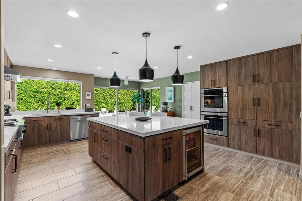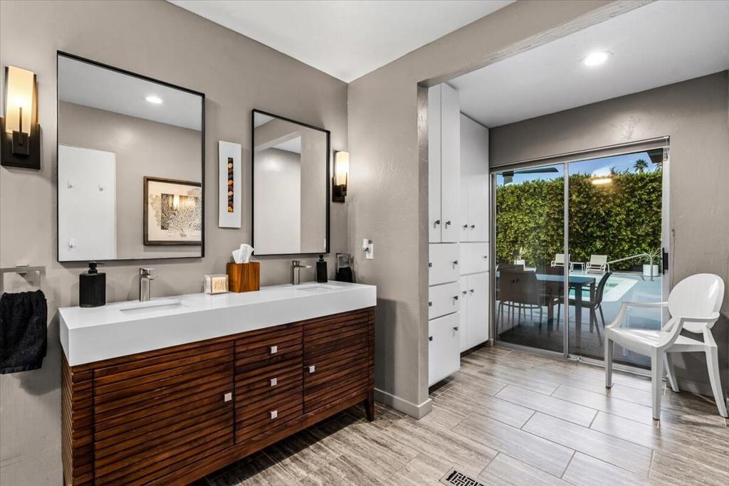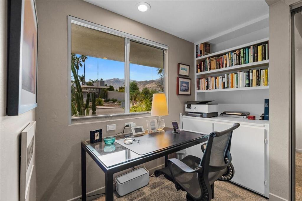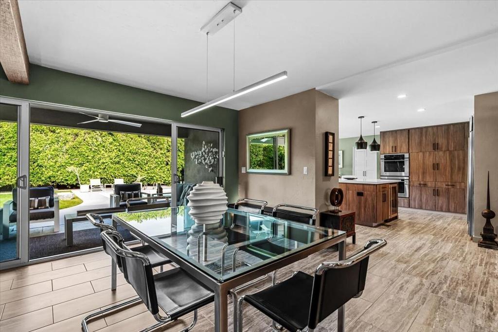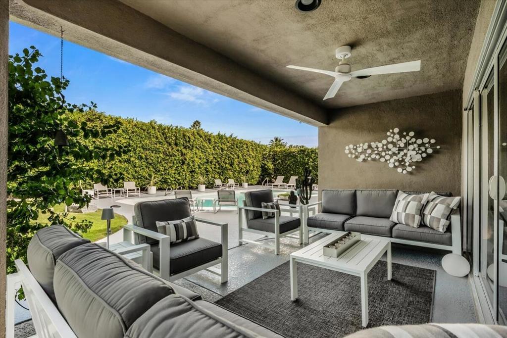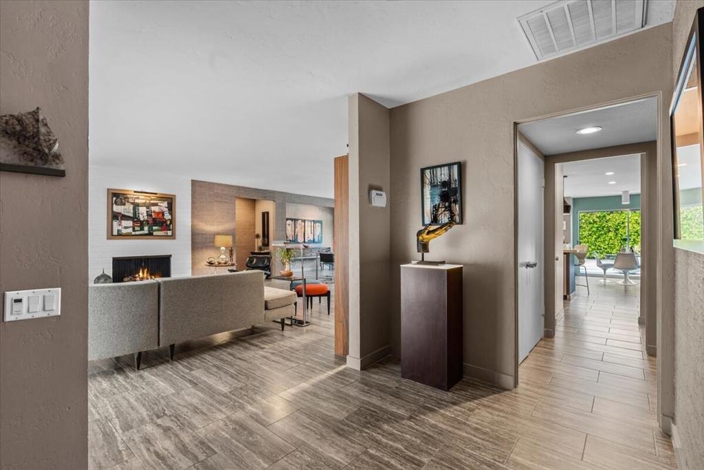 This spectacular Indian Canyons gem was designed by architect Harold L. Lacy and was featured in the 2023 Modernism Tour. Surrounded by western, eastern and southern views, this home boasts dramatic architectural elements inside and out. The extremely private resort backyard with San Jacinto mountain views, includes a pool, spa, lush landscaping, firepit, and multiple entertaining and lounging areas including an expansive covered patio! Multiple sets of sliders lead to this wonderful backyard for the quintessential Palm Springs indoor/outdoor flow! The living room with fireplace has elegant wall coverings and a voluminous picture window with views of a pond and mature Olive tree. The formal dining room has direct access to the rear sanctuary. The Chef's kitchen features a large island, ample storage, eat-in kitchen, stainless steel appliances and direct access to the backyard! The primary retreat with views and direct access to the yard, has a sizable sitting area that would make a great media room or home office! All of the bathrooms have been beautifully updated (2020)! Some additional upgrades include a newer roof (2019), newer HVAC with 5 ton AC air cleaner (2019) pool renovation including gunite, heater, variable speed pump (2019), newer electrical panel (2019), garden irrigation (2020-2021), landscape lighting (2020-2021), pool deck drain system (2026) and much more!