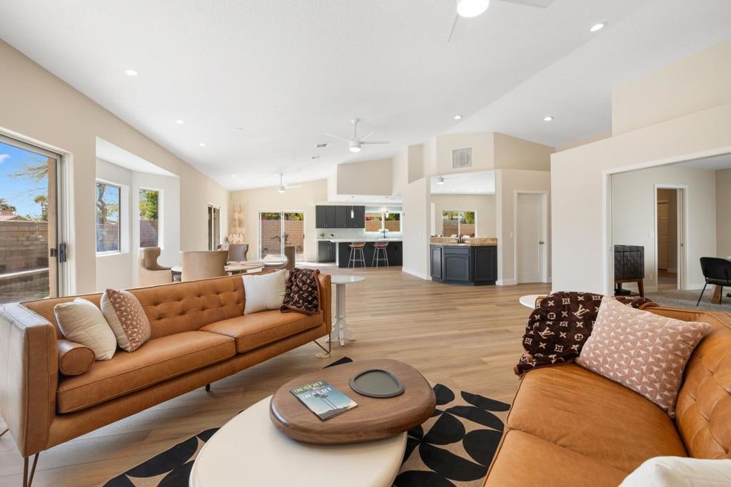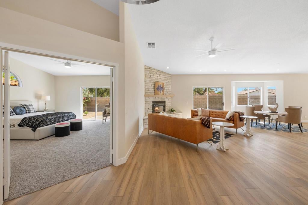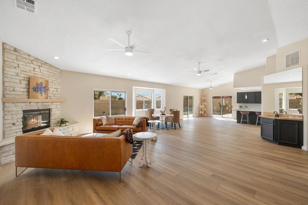 Behind the gates of Starlight Dunes, a newly refreshed desert retreat awaits. Thoughtfully updated and move-in ready, this single level residence offers 4 bedrooms, 3 baths, and approximately 2,525 square feet of refined comfort in the heart of North La Quinta. New flooring flows seamlessly throughout the home, complemented by fresh interior and exterior paint, new carpet, and refreshed landscaping with updated irrigation. At the center of the home, the kitchen has been completely transformed with brand-new kitchen cabinetry, stone countertops, new appliances, and a generous island, creating a clean, contemporary space designed for both everyday living and effortless entertaining. The open concept living areas are filled with natural light and enhanced by soaring ceilings and expansive sight-lines. A striking stacked-stone fireplace anchors the family room, creating a warm architectural focal point for gathering and relaxation. The spacious primary suite offers a private retreat of its own, complete with a fireplace that adds comfort and ambiance. Outdoors, a private Pebble-finish pool and spa with water feature create a tranquil setting framed by newly refreshed landscaping. Whether enjoying quiet mornings poolside or hosting beneath the desert sky, the backyard invites year-round desert living. Starlight Dunes, known for its low HOA, IID utility district, and proximity to top-rated schools, shopping, and dining, this residence presents a rare opportunity to own a beautifully updated home in one of North La Quinta's most established communities.