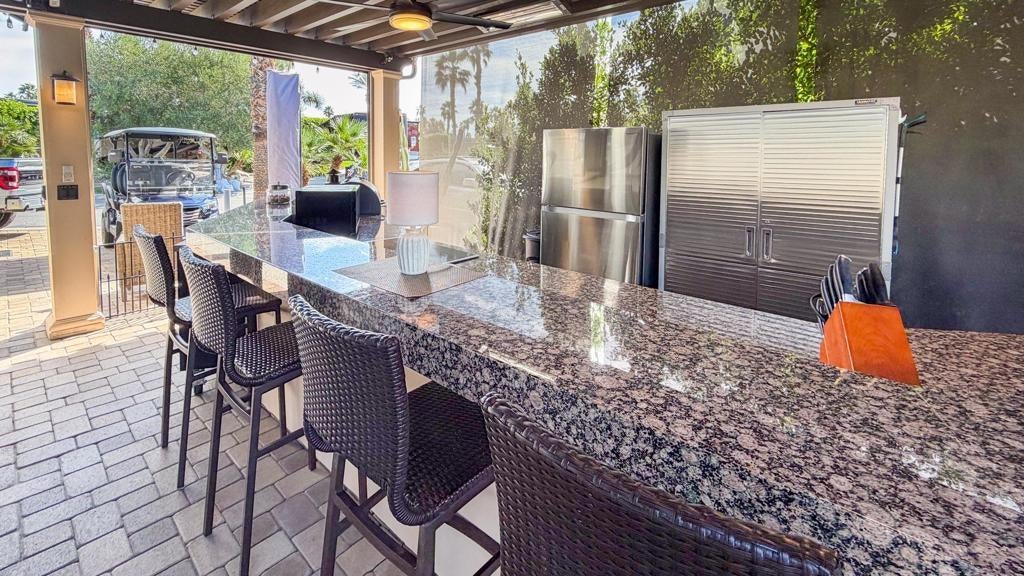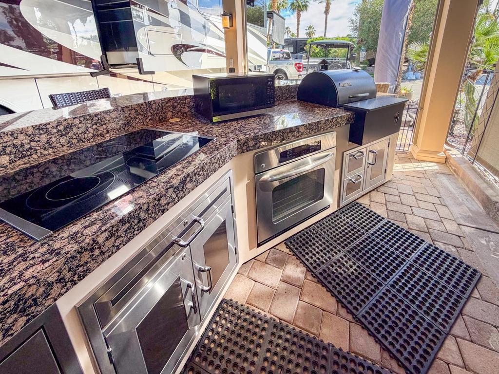 Welcome to Lot 294 at Outdoor Resort Indio, a beautifully upgraded entertainer's lot with stunning mountain, lake, waterfall, bridge, and golf course views.The spacious L-shaped pergola features an insulated solid roof, six radiant heaters, and four ceiling fans, with six electric screens to fully enclose the back and additional screens surrounding the kitchen area. An outdoor entertainment center with a large TV, protective rolling door, and fireplace readiness creates the perfect gathering space.The oversized kitchen showcases granite countertops, a built-in Traeger smoker, four-burner cooktop, oven, dishwasher, under-counter refrigerator, full-size refrigerator, and extensive custom storage. Pavers surround the lot, complemented by a six-year-old concrete RV pad, mid-lot water and sewer hookups, and two sewer connections.Offered furnished, the lot includes a large dining table for eight, a comfortable seating area with fire table, bar stools, storage cabinets, cantilever umbrella, and dog fencing. There is also room for a full-size truck and golf cart.Walking distance to the clubhouse, yet far enough away to maintain your privacy.Outdoor Resort Indio is a Class A RV only resort.