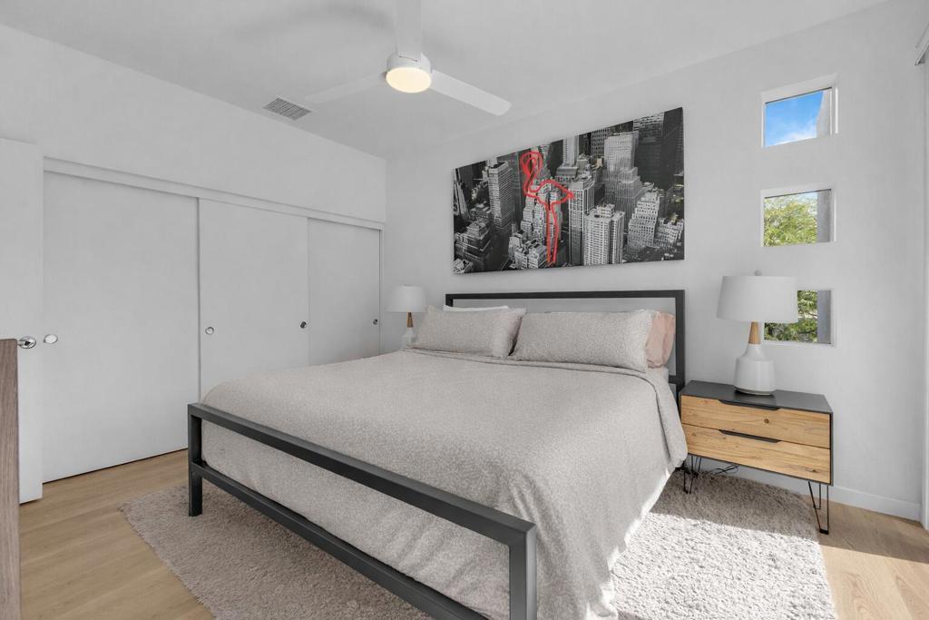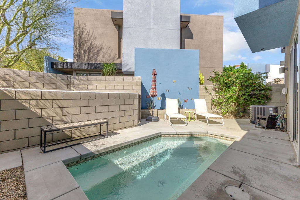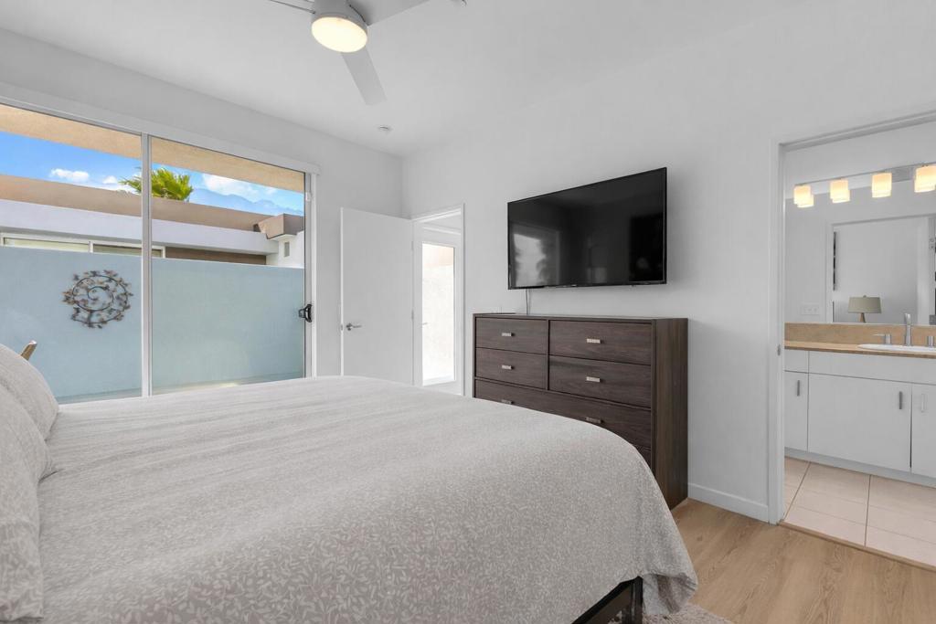 This beautifully maintained Model D floor plan offers modern design and an open-concept layout, nestled in the heart of the highly sought-after Palermo community just 5 minutes from Downtown Palm Springs. This particular unit does not share any adjoining living-space walls on either side, providing an added sense of privacy along with a quieter, more peaceful environment. Enjoy spacious living and dining areas that create an inviting space for both everyday living and entertaining, while the primary suite boasts a private balcony positioned to capture stunning sundeck views of the San Jacinto Mountains. Offered almost entirely furnished (an exclusion list is provided), this home is move-in ready and ideal as a full-time residence, seasonal retreat, or investment opportunity. Residents of Palermo enjoy gated security, a stylish clubhouse with a lounge and billiards table, a fitness center, and two sparkling pools and spas. Low HOA dues cover water, trash, roof, and exterior maintenance. Situated on Fee Land (you own the land), this property offers the perfect blend of resort-style amenities, mountain views, and prime Palm Springs living. A full inspection report was completed in February 2023, and the AC and pool have been serviced since, which provides added peace of mind.