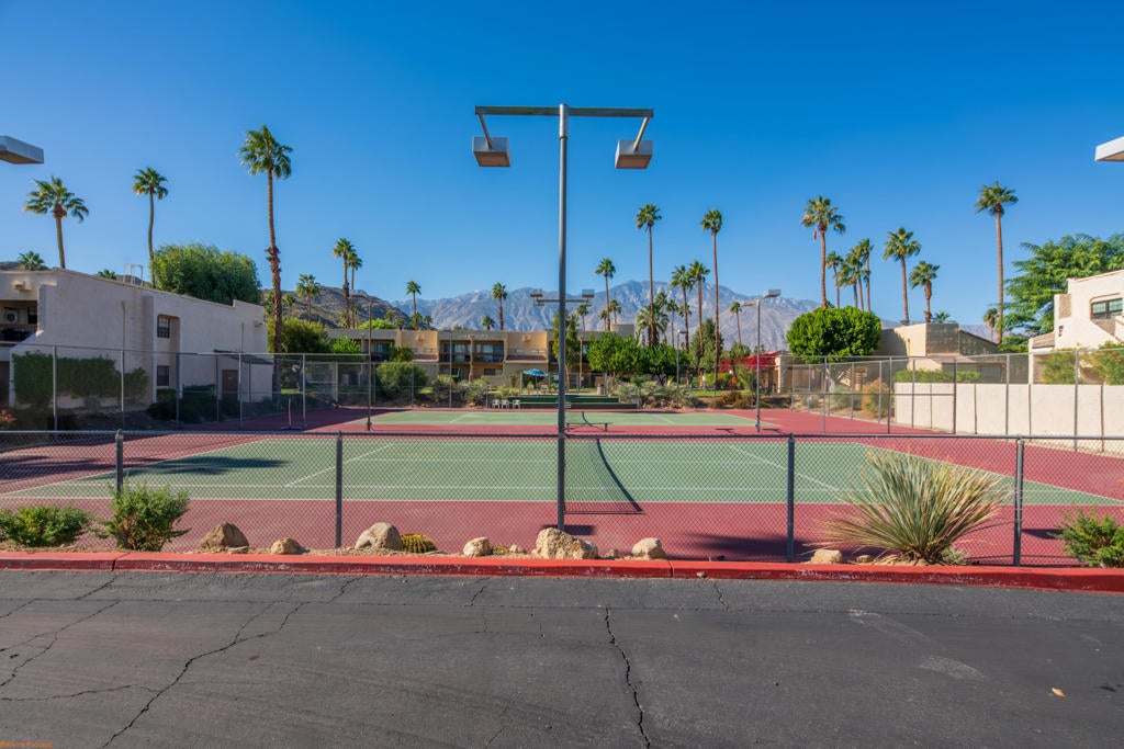 The perfect hideaway for your desert adventures! AVAILABLE FOR LONG-TERM 6-MONTH+ LEASE. This rare, upper-level two-bedroom, 1.25 bath, remodeled unit offers modern upgrades and effortless comfort throughout. Enjoy a brand-new kitchen with leather-finish granite countertops and all-new appliances, plus new vinyl plank flooring, and ceiling fans in every room. Bathrooms have been tastefully updated, and all electrical outlets and switches have been replaced. The freshly painted interior feels clean and inviting, and a new Samsung washer and dryer are included. The timeless floor plan provides a seamless indoor-outdoor flow from the living and dining areas to a private balcony with south-facing panoramic mountain views. The community surrounds you with lush lawns and mature grapefruit, lemon, and lime trees. Cool off in one of three pools, relax in four spas, or enjoy the tennis and pickleball courts. Close to shopping and dining - and just minutes from Downtown Palm Springs - this home is truly a must-see! Monthly rent includes water, basic cable and internet for added convenience. Tenant pays for electricity and gas. First month's rent and $1,850 deposit due prior to move-in. Sorry, no pets.