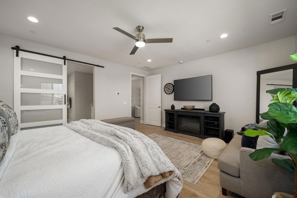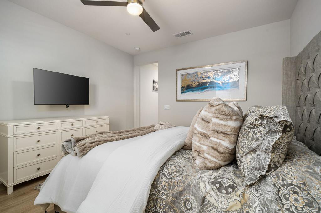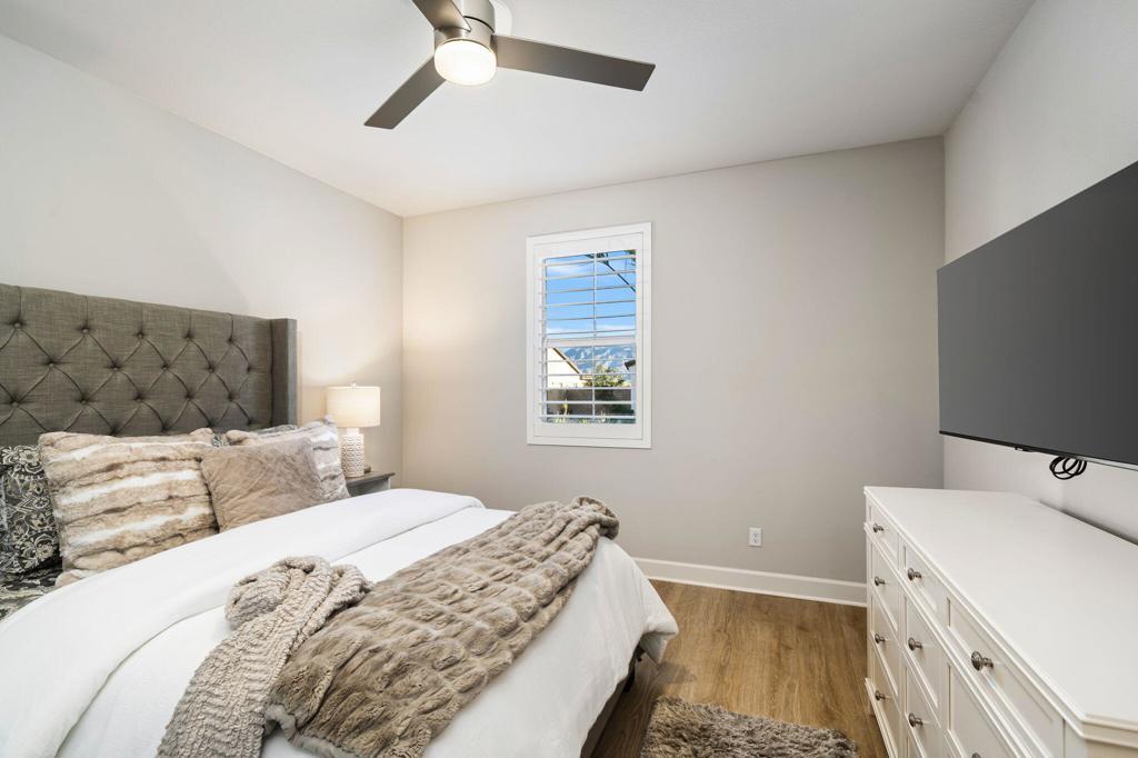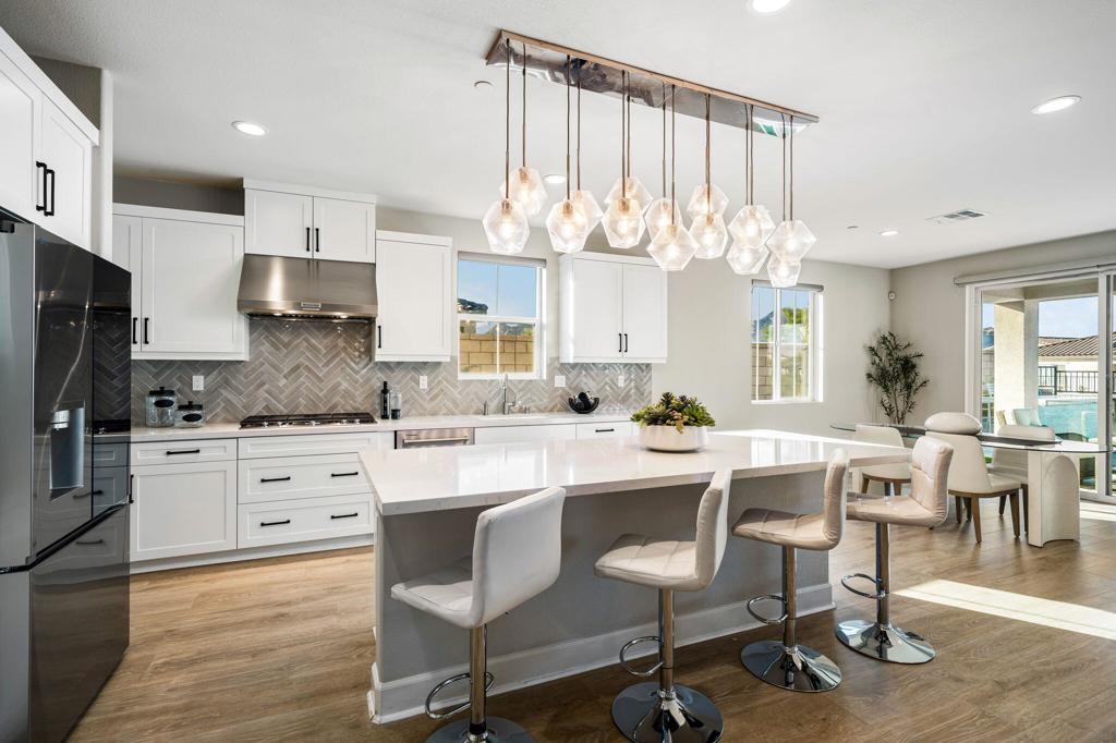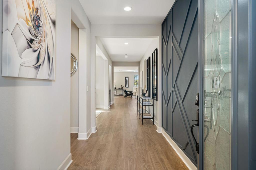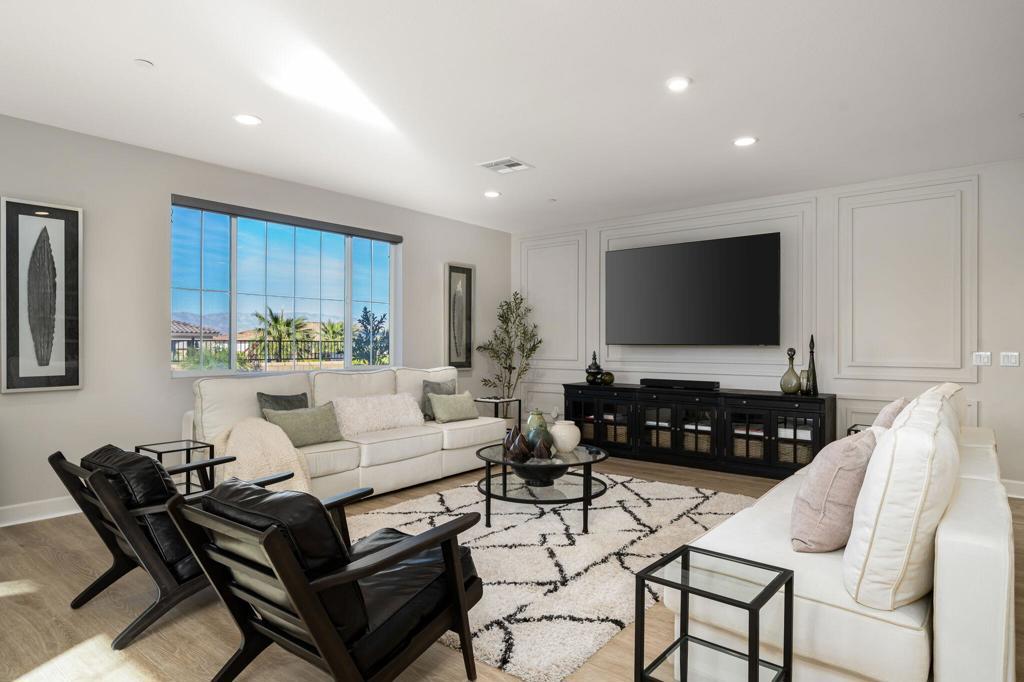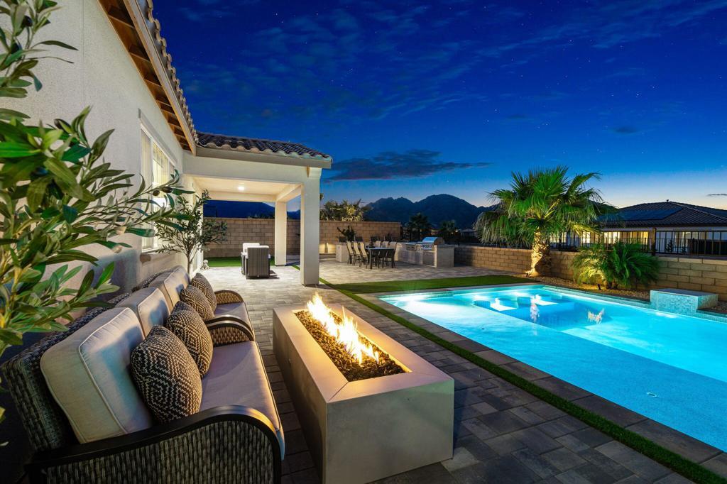 Set against the iconic silhouette of the Santa Rosa and Coral Mountains, this stunning residence in the coveted Cantera at Coral Mountain community delivers a rare blend of elegance, resort-caliber outdoor living, and an unmatched La Quinta address just outside the gates of PGA West and The Quarry. From the moment the twilight-lit palms and paver driveway come into view, it is clear this property was designed for those who expect more.Spanning over 3,000 square feet, the thoughtfully designed floor plan offers three bedrooms plus a versatile bonus room ideal as a fourth bedroom, home office, den, or game room. The grand open-concept interior flows seamlessly from the chef's kitchen through the great room and out to the backyard oasis, with expansive sliding glass doors that dissolve the line between indoor comfort and outdoor living. The kitchen is a true showstopper, anchored by an oversized island with quartz countertops, a herringbone tile backsplash, double wall ovens, stainless French door refrigerator, and a sculptural geometric pendant chandelier that commands attention.The primary suite is a private retreat, featuring a dramatic board-and-batten accent wall and a barn door entry to the spa-like bathroom, adding character and function. Generous second and third bedroom suites provide comfortable separation for guests or multigenerational living.Outside, the backyard rivals any five-star resort. A sparkling pool with an oversized tanning shelf, infinity-edge spa, and sweeping mountain views creates the ultimate desert escape. The entertainer's patio features an outdoor kitchen with stone countertops, covered dining, a fire pit lounge, an artificial turf putting course, and mature palms framing every angle. Solar panels add long-term value and energy efficiency. Low HOA. Schedule your private showing today and experience everything this La Quinta gem has to offer.