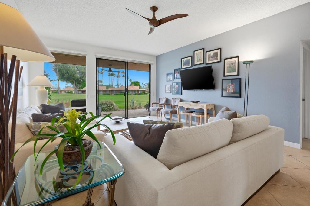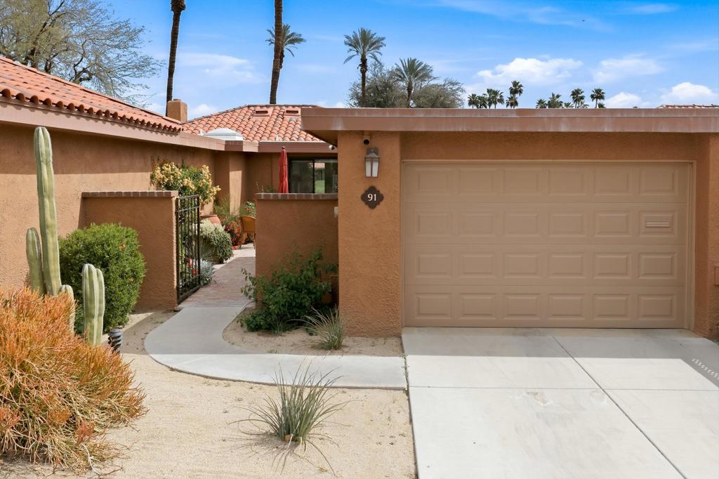 Open House April 18th 11am to 2pm. 91 La Cerra Dr. is located in Sunrise CC on a single sided street adjacent to Thunderbird Terrace. This area benefits from fewer neighbors and traffic then other sections of the club. Tastefully updated with a few well thought modifications to the interior. The kitchen has been opened for easier access and a neat dry bar with wine cooler has been added. Immaculate 2 bedroom 2 bath condo with interior location in Sunrise CC. Eastern Golf course views from the living area and back patio, Mountain views in the large front courtyard. The current owner is a landscape designer and has nurtured a one-of-a-kind garden in the front courtyard. The Primary bedroom has walk in closet plus an extra closet with built ins. Ideal Rancho Mirage location, near The River, The Gardens on El Paseo, Annenberg Estate, Disneys Cotino, dining, shopping and Eisenhower Hospital.
