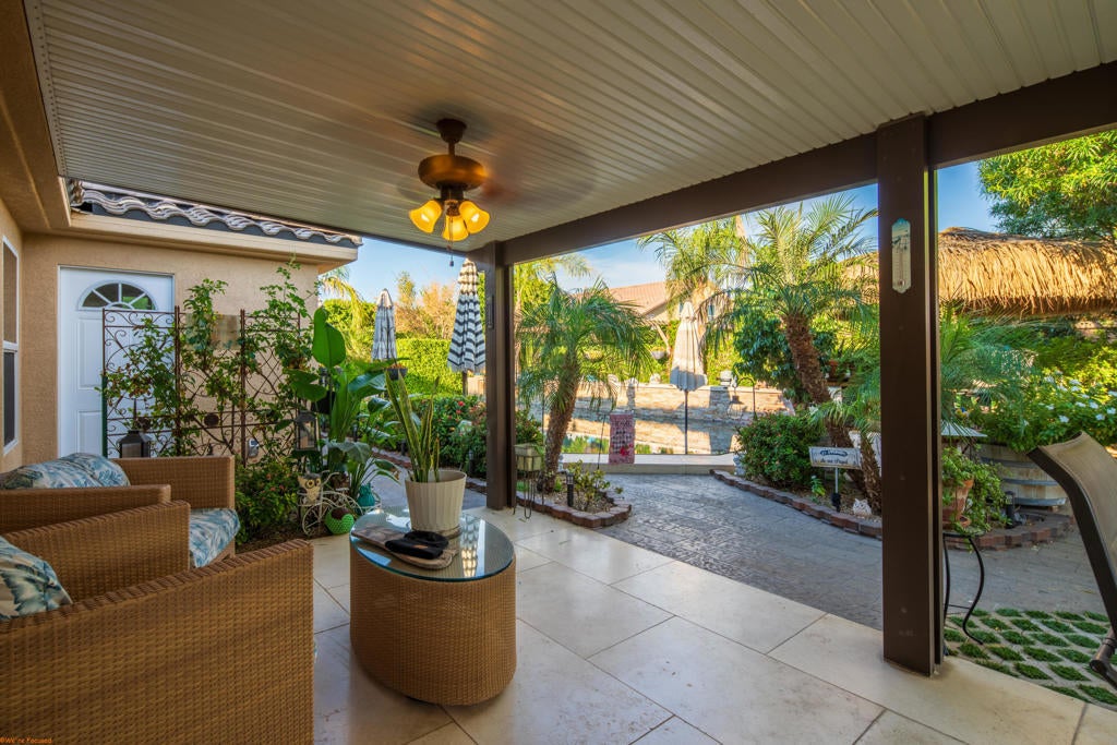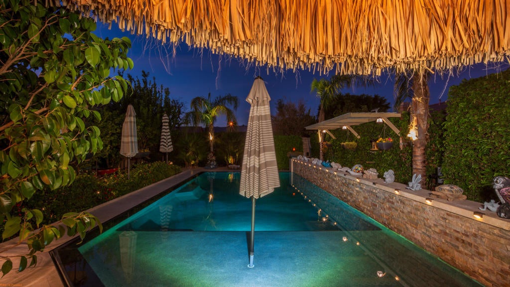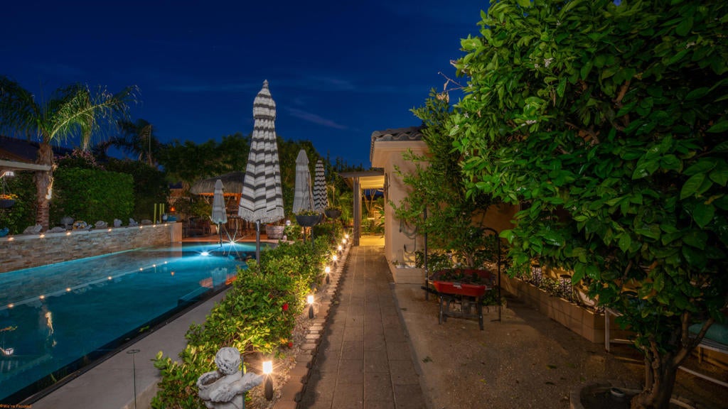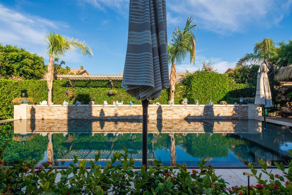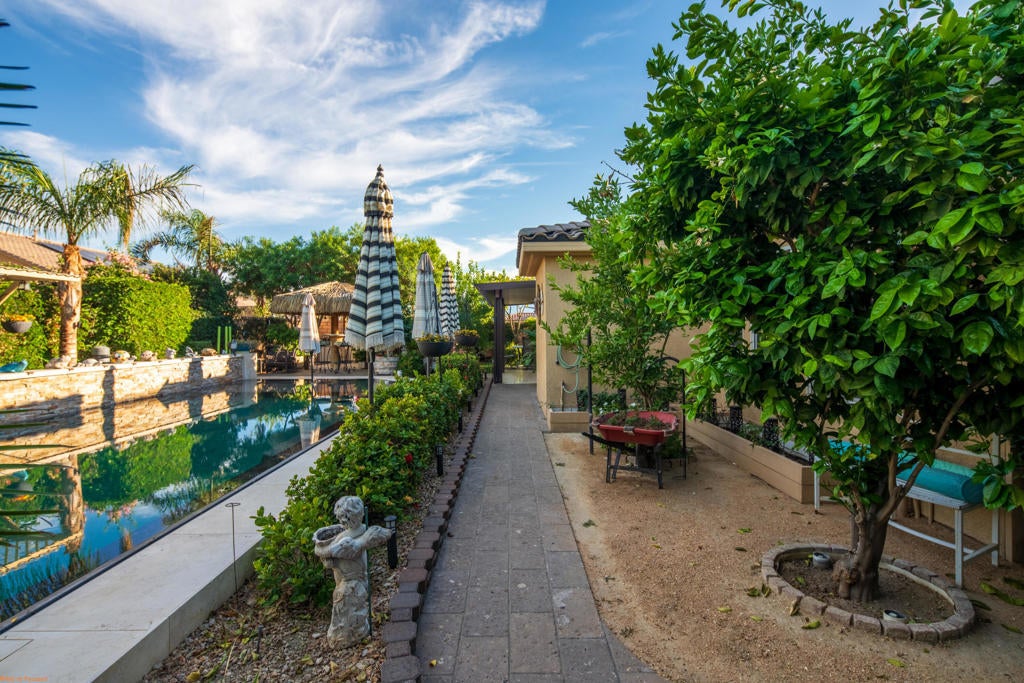 Beautiful and truly one of a kind home located in Indio offering 5 bedrooms and 4 bathrooms with two spacious living areas, perfect for comfortable living and entertaining. The property also offers RV parking and showcases extensive upgrades throughout with exceptional indoor and outdoor features.Inside the home you will find large porcelain flooring, custom finishes, smart switches in the front of the home, a built in sound system in the main living areas and primary bedroom, and a custom entertainment wall that creates a stunning focal point in the living room. The upgraded kitchen features granite countertops, a trash compactor, wine mini fridge, and a unique built in aquarium that can be enjoyed from the dining area and main living space.The primary suite offers a luxurious retreat with heated floors in both the bedroom and bathroom, porcelain tile shower walls, a freestanding soaking tub, and quartz countertops.The backyard is designed for true resort style living and entertaining. Enjoy the infinity edge pool with a chlorine free filtration system, solar heating, massage jets, waterfall feature, and travertine perimeter. The outdoor area also includes a full outdoor bathroom with shower, perfect for guests and pool use. Entertain family and friends with the fully equipped bar and grill area featuring a charcoal BBQ, gas grill, pizza oven, and mini fridge. A beautiful palapa with misting system and lighting provides a comfortable shaded space for outdoor gatherings.Additional features include travertine patios, cantera stone pathways, artificial turf, wood deck areas, garden beds with automatic watering system, and several fruit trees including lemon, orange, tangerine, and tangelo. The property also offers RV access with a paved driveway and electric gate.The garage features porcelain flooring, built in shelving for storage and organization, and a swamp cooler.This unique property combines luxury upgrades, resort style outdoor living, and functional space for a variety of lifestyles. A rare opportunity to own a truly special home in Indio. See attached upgrade list.