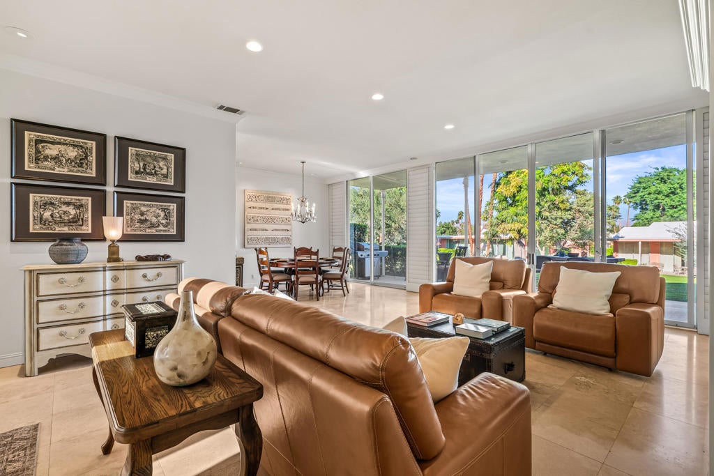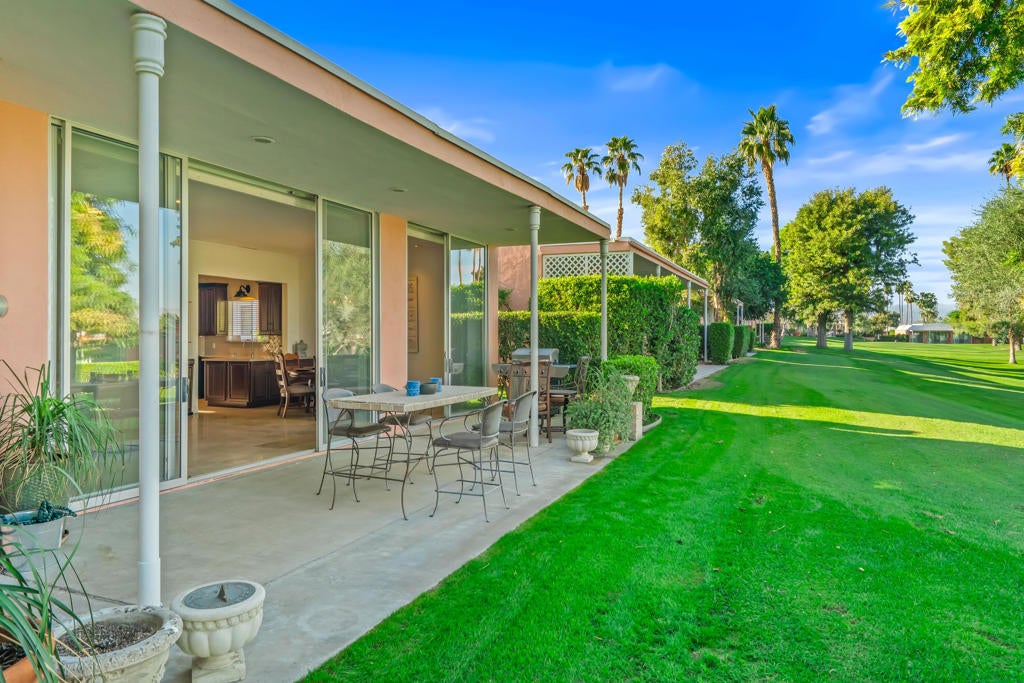 Best entry opportunity at Marrakesh--beautifully remodeled Expanded A-Plan with rare attached casita, move-in ready and thoughtfully priced to help offset the one-time club affiliation fee required for all homeowners.Welcome to Marrakesh Country Club, one of Palm Desert's most architecturally distinctive gated communities. In late 2025 the community was designated a historic district by the Palm Desert City Council, recognizing its cohesive Hollywood Regency design and cultural significance. Created by renowned architect John Elgin Woolf, Marrakesh is celebrated for its iconic pink residences, elegant symmetry, and timeless architectural style. This beautifully remodeled Expanded A-Plan residence offers generous living space, refined finishes, and seamless indoor-outdoor living. Enter through classic white double doors into a dramatic living room with soaring 10-foot ceilings, travertine flooring, and expansive sliders opening to tranquil greenbelt views with mountain glimpses beyond. The updated kitchen features quartz countertops, stainless-steel appliances, custom cabinetry, and a concealed walk-in pantry with a second refrigerator, ideal for effortless entertaining.The primary suite is a true retreat, complete with a private office nook and a spa-inspired bath finished in travertine marble with a walk-in shower. Additional features include a powder room and full laundry room. A rare highlight is the attached private casita with its own entrance, ensuite bath, and oversized closet--one of only ten homes in Marrakesh with this configuration, perfect for guests, creative space, or a private office. Outdoor living includes a front patio framed by mountain views and a rear terrace overlooking the lush greenbelt, offering privacy while safely set back from golf play. Set across 155 acres of beautifully landscaped grounds, Marrakesh features 364 residences, 14 pools, and an opulent clubhouse recently transformed through a $15 million renovation, creating one of the desert's most stylish and socially vibrant club communities Move-in ready and easy to show--an exceptional opportunity to own in Palm Desert's newly designated historic Marrakesh Country Club.