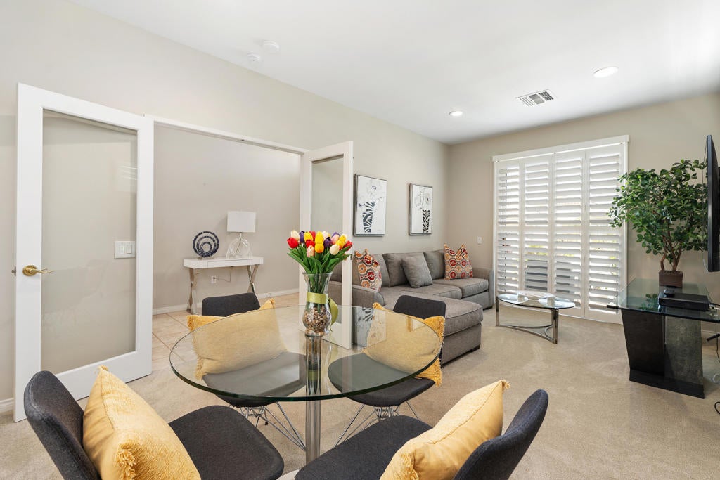 ***PRICE REDUCED TO $607,000***Fabulous POOL home right here in the highly desirable Sun City Palm Desert, a premier 55+ active adult community. This beautifully maintained Cayman model offers approximately 1,632 sq. ft. of comfortable living space featuring 2 bedrooms, 2 bathrooms, and a versatile den ideal for a home office, hobby room, or guest space.The home showcases nice upgrades throughout and a spacious kitchen with ample cabinetry and generous counter space, recently painted cabinets and new hardware, perfect for everyday living and entertaining. The open layout flows comfortably into the living area, where you'll find a cozy fireplace that creates a warm and inviting focal point.The outdoors offers a private backyard retreat with a sparkling pool, perfect for relaxing, entertaining guests, or enjoying the beautiful desert sunshine year-round, the backyard has been recently resurfaced.This home offers privacy and a wonderful opportunity to enjoy the resort-style lifestyle that Sun City Palm Desert is known for. Residents enjoy access to championship golf courses, clubhouses, fitness centers, pools, tennis, pickleball, restaurants, and countless social activities. Over 80 Chartered clubs to chose from, quilting, sewing, art, card games, ceramics, glass arts, and many more!PERFECT for investors that wish to lease it out full time or seasonally, everything you see inside and outside is included, fully furnished!! GOLF CART IS INCLUDED TOO!!Experience the best of active adult living in one of the desert's most sought-after communities.