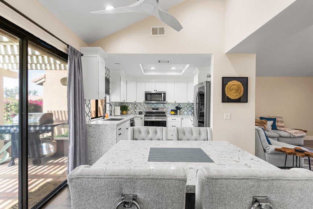 Welcome to refined desert living in the highly desirable Oasis Country Club in Palm Desert. This beautifully upgraded 2 bedroom, 2 bath residence offers the perfect blend of comfort, style, and breathtaking golf course, lake and mountain views. Step inside to soaring ceilings and an open, light filled floor plan designed for effortless living and entertaining. The thoughtfully updated kitchen features quartz countertops, custom cabinetry, ,stainless steel appliances, and designer tile backslash, all perfectly positioned to capture tranquil views of the lush fairways, sparkling lake and majestic mountains. The spacious living area is highlighted by a modern fireplace and dramatic vaulted ceilings, creating a warm yet sophisticated atmosphere. Large sliding doors open seamlessly to the outdoor patio, bringing the beauty of the desert landscape indoors. Enjoy morning coffee or evening sunsets under the expansive pergola covered patio overlooking the golf course and water features, an ideal setting for entertaining or simply relaxing in peaceful surroundings. Located within the guard gated Oasis Country Club, residents enjoy resort style amenities including an 18 hole golf course, clubhouse, dining, tennis, pickleball, fitness center, pools and spas! Schedule your showing today!