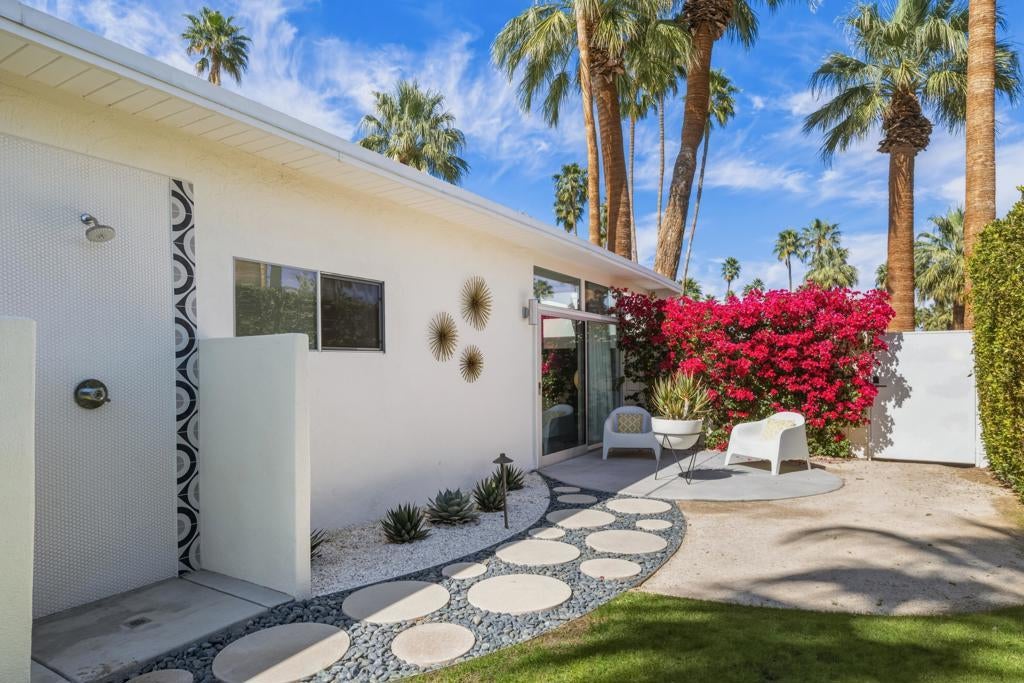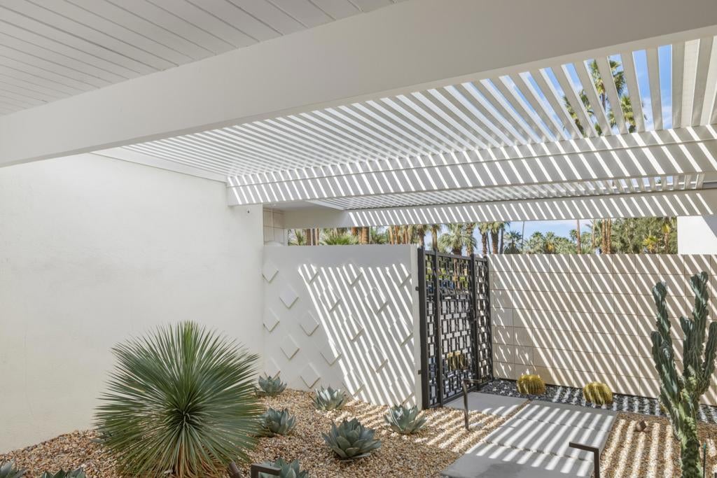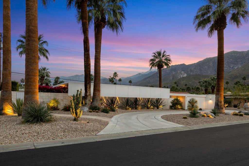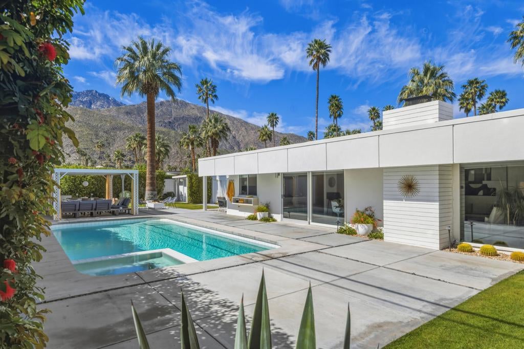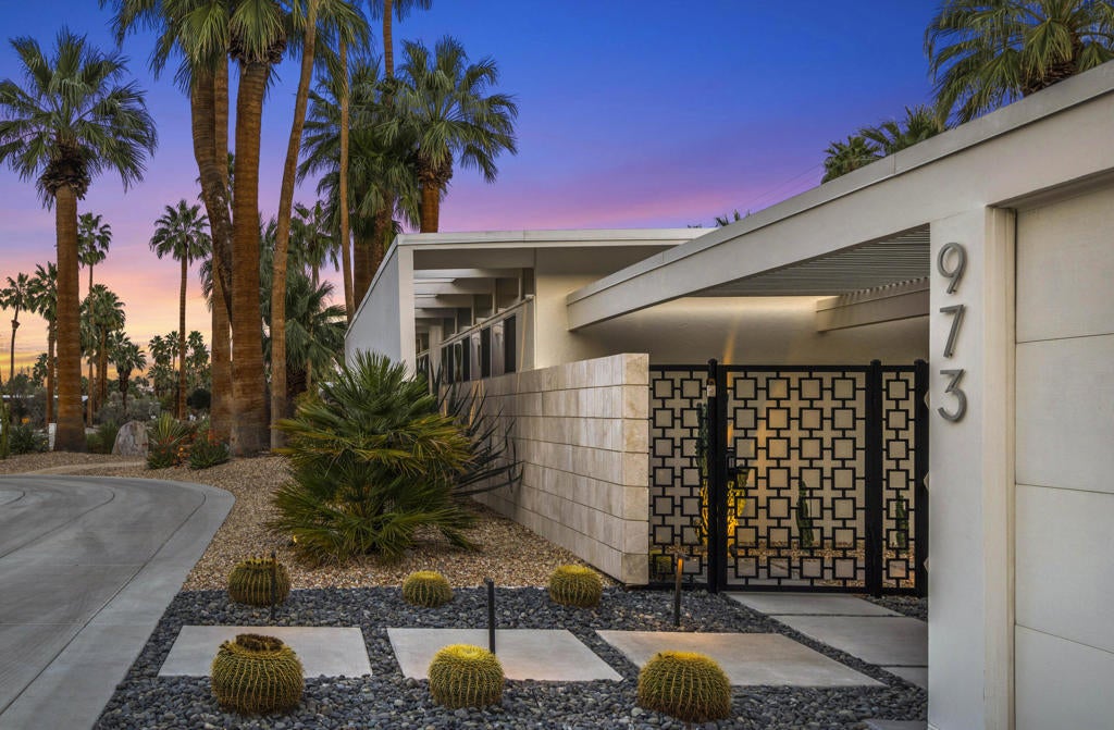 Designed by noted architect William Krisel in 1957, this iconic sun-flap model is located in the coveted enclave of Twin Palms, nationally noted as one of the most significant mid-century architectural neighborhoods in the US. With its striking curb appeal, modern amenities, tasteful finishes, a spacious backyard designed for entertaining and gorgeous views - this house has it all! Krisel designed his homes to improve people's lives, and when you walk into this home you have that immediate joyful impression. The light-filled interior has been meticulously remodeled, showcasing its original clean and elegant architectural lines. The mindful upgrades, done over time, include new plumbing, new cabinetry, refurbished post and beam 9-foot ceilings, a refreshed kitchen, new bathrooms, designer lighting, high-end tile and finishes, Fleetwood sliders and double-pane windows. Palm Springs is famous for its indoor-outdoor lifestyle and this impressive south-facing backyard is where a lot of daily living takes place! Three shade structures provide inviting areas for lounging, dining or sipping your favorite beverage while enjoy the stunning mountain views. The saltwater pool was recently resurfaced and a spa was added. There is even an outdoor shower! This house has been scrupulously maintained and has not been used as a rental, though vacation rentals in this neighborhood are allowed and not yet capped. It is FEE land - which means no tribal lease. 973 E. La Jolla Road is truly a rare Palm Springs move-in ready gem!