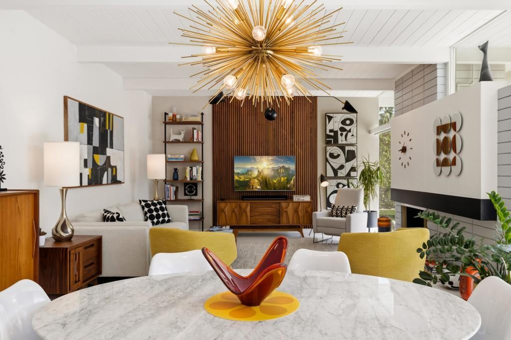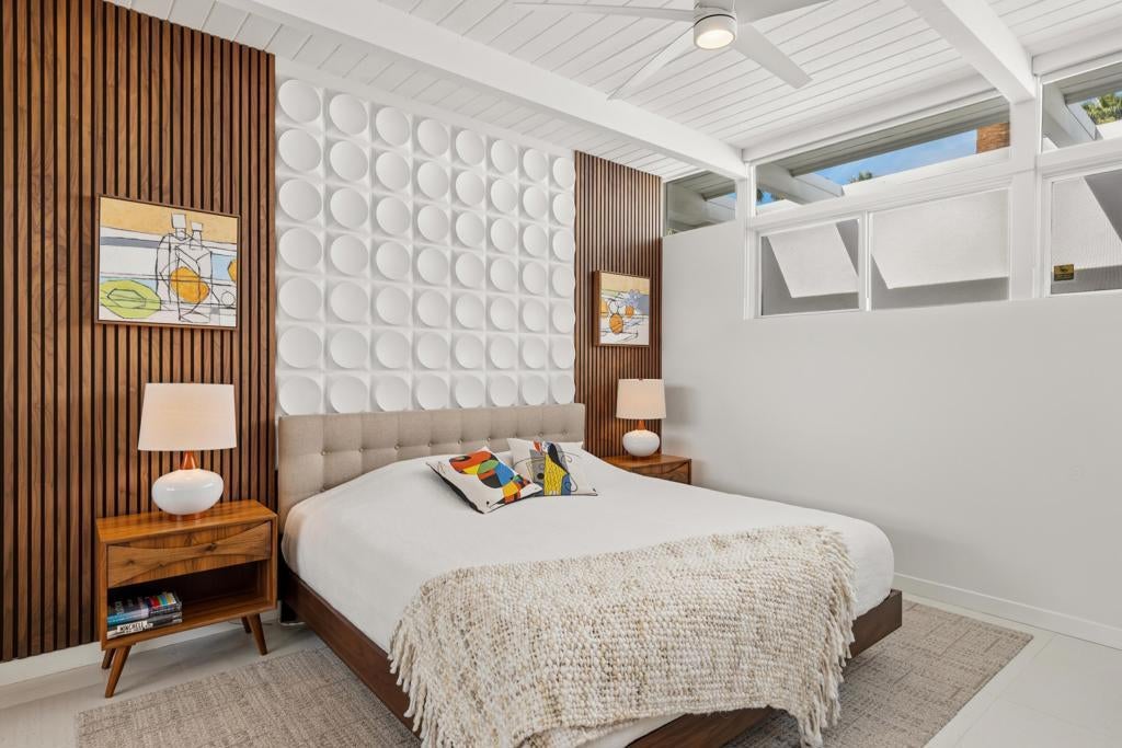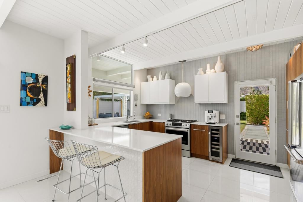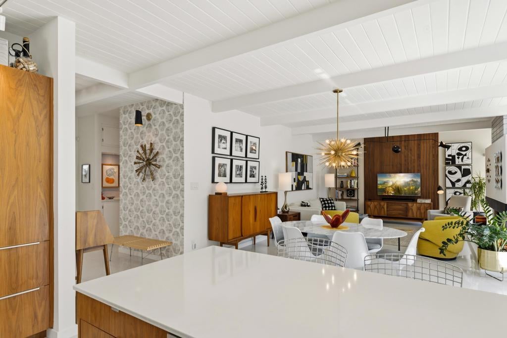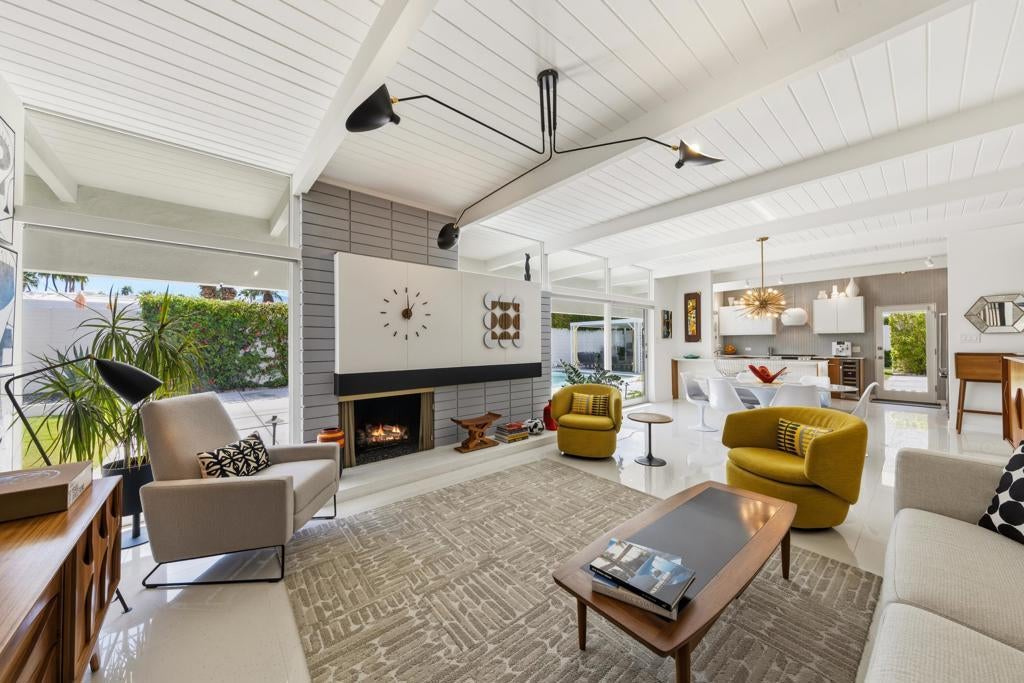 Designed by noted architect William Krisel in 1957, this iconic sun-flap model is located in the coveted enclave of Twin Palms, nationally noted as one of the most significant mid-century architectural neighborhoods in the US. With its striking curb appeal, modern amenities, tasteful finishes, a spacious backyard designed for entertaining and gorgeous views - this house has it all! Krisel designed his homes to improve people's lives, and when you walk into this home you have that immediate joyful impression. The light-filled interior has been meticulously remodeled, showcasing its original clean and elegant architectural lines. The mindful upgrades, done over time, include new plumbing, new cabinetry, refurbished post and beam 9-foot ceilings, a refreshed kitchen, new bathrooms, designer lighting, high-end tile and finishes, Fleetwood sliders and double-pane windows. Palm Springs is famous for its indoor-outdoor lifestyle and this impressive south-facing backyard is where a lot of daily living takes place! Three shade structures provide inviting areas for lounging, dining or sipping your favorite beverage while enjoy the stunning mountain views. The saltwater pool was recently resurfaced and a spa was added. There is even an outdoor shower! This house has been scrupulously maintained and has not been used as a rental, though vacation rentals in this neighborhood are allowed and not yet capped. It is FEE land - which means no tribal lease. 973 E. La Jolla Road is truly a rare Palm Springs move-in ready gem!