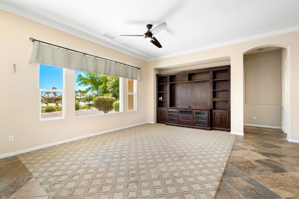 This charming 3-bedroom, 2-bathroom home is beautifully situated on an oversized lot overlooking the #13 tee box of Coral Mountain Golf Course. Featuring 1845 sqft of interior living space, this Monarch floor plan is the perfect home for a full-time resident. You'll love the open concept kitchen with slab granite counters, double ovens, prep island, gas cooktop, ample cabinetry, nook area and convenient workstation. Adjacent to the kitchen is a large great room and dining area with entertainment center niche. Guest bedroom has an adjacent full bath, and the den/office easily serves as a 3rd bedroom. The primary suite grants private access to the rear yard and includes dual vanity, walk-in closet, and spacious glass door tiled shower with bench seat. From your covered rear dining area, you'll enjoy the stunning mountain and lake views along with low maintenance desert scape. The extended garage can accommodates two vehicles and a golf cart. Only minutes from the Santa Rosa Clubhouse, this bright and elegant home offers everything you need! Don't wait...lease this piece of paradise today! Trilogy is a 55+ community that offer a community with activities that residents can enjoy.