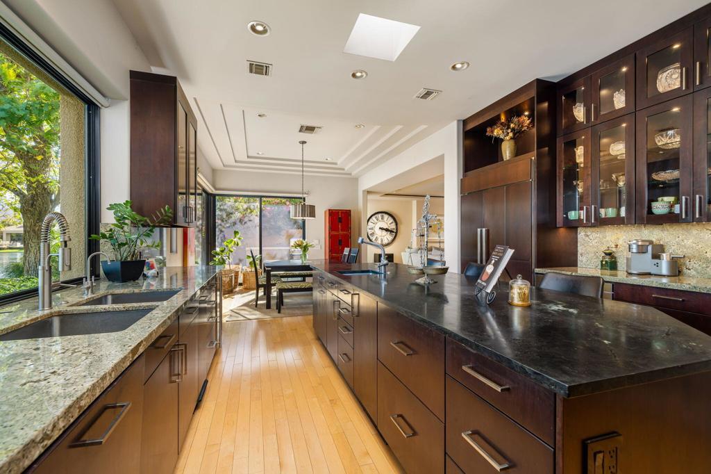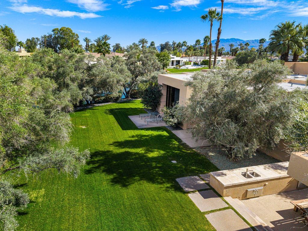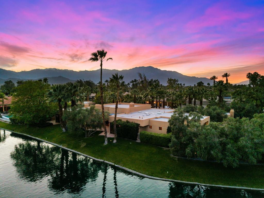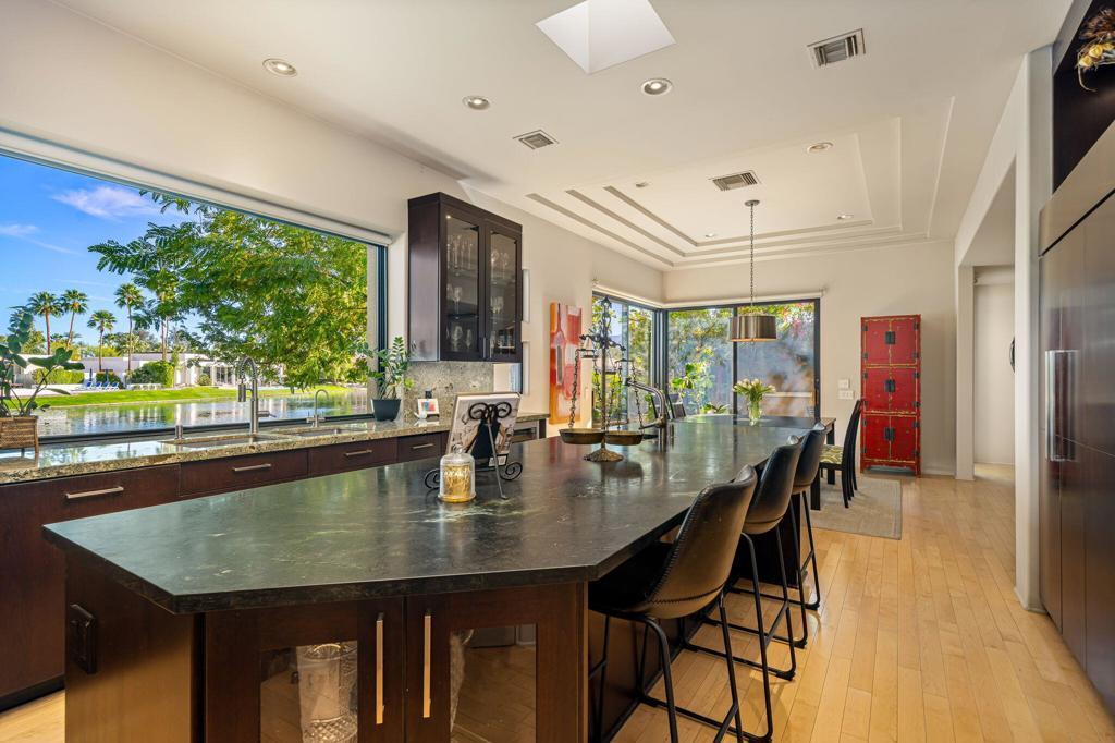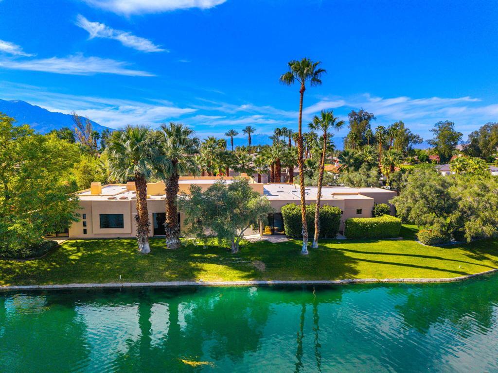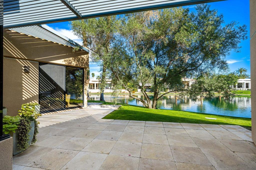 Spectacular Custom Lakeside Compound with Expansive Outdoor Living Spaces, Contemporary Architecture, Renovated Luxury Interiors and up to 5 bedrooms - Home of Tennis Legend Mark Woodforde. Enter through Double Gates to a resort compound on a double lot with custom landscaping including numerous Palm and Olive Trees. Double Glass Entry Doors lead to an open Great Room with walls of glass framing the lake and the pool terrace, clerestory windows, fireplace, entertainer's bar and stunning dining room with custom ceiling and stylish lighting - a dramatic space to gather family or entertain large groups of friends. Open Kitchen, Dining and Family Room also overlook the lake and provide informal gathering space. Gourmet Chef's Kitchen features large social island with seating, granite countertops, upgraded appliances and custom cabinetry with lighting. Informal Dining overlooks the lake terrace and BBQ area and Family/Media Room has a contemporary fireplace and great space for those movie nights. An office/library with fireplace opens to the Great Room. A nearby powder room services both formal and informal spaces. Primary Bedroom Suite features sliders to the pool terrace, marble and travertine filed bath with spa tub, shower and double vanities and an oversized closet with custom built-ins. Guest Room 1 overlooks the lake and could be a second primary with ensuite bath clad in granite and travertine. A dramatic hallway leads to a separate guest wing that includes 2 bedrooms and a large living room and separate terraces. Bedrooms with ensuite marble and travertine clad bathrooms and sliders to individual terraces. Outside is a true resort yard with large pool and spa with waterfalls, Covered outdoor living room with fireplace and TV, Outdoor Kitchen and Dining Area perfect for big family events or parties, expansive grass lawns and multiple stone terraces surrounding the pool side and the lake side. Lutron lighting system and automatic shades. Located in coveted Fairway Estates of Mission Hills Country Club, home of grass, clay and hardcourt tennis,pickleball and 3 18 hole championship golf courses. Privacy, Contemporary Luxury and Space provide the perfect resort compound for family or friends - come home to your desert retreat!