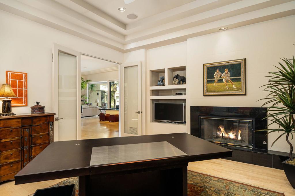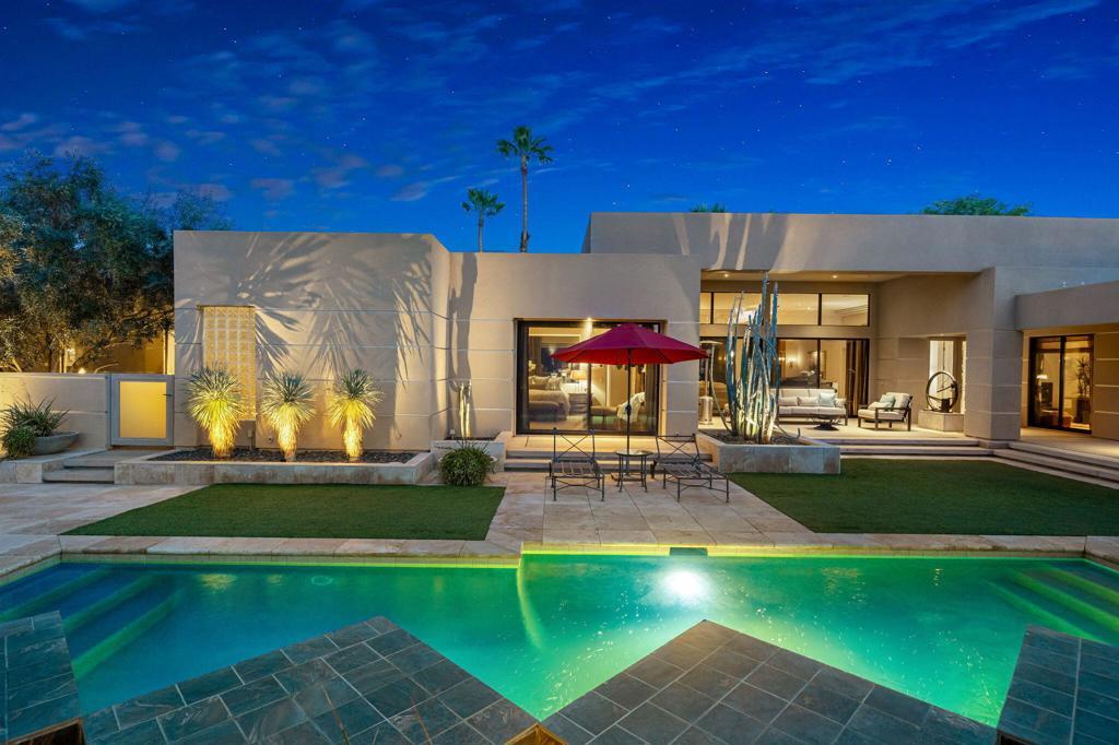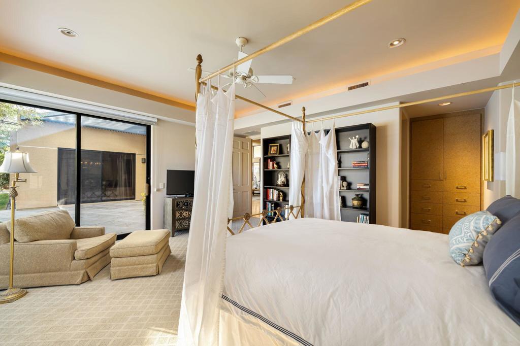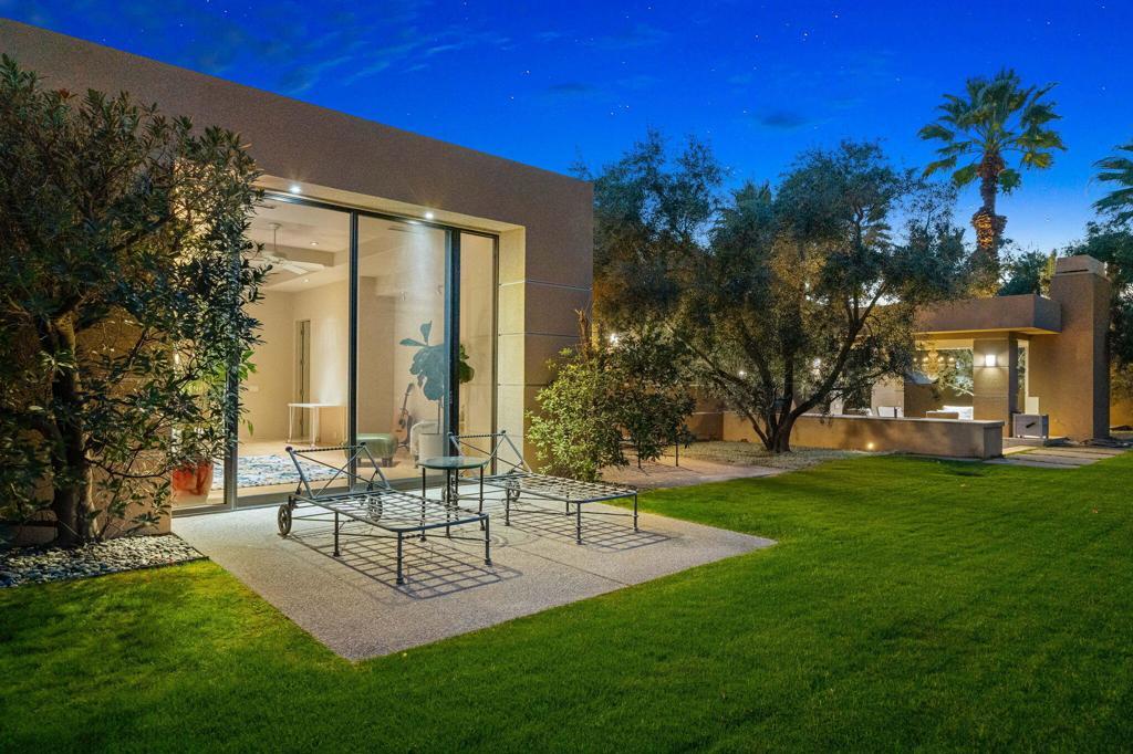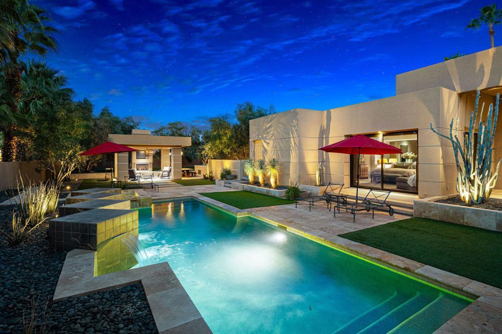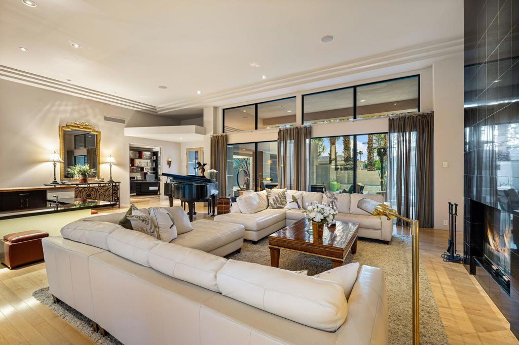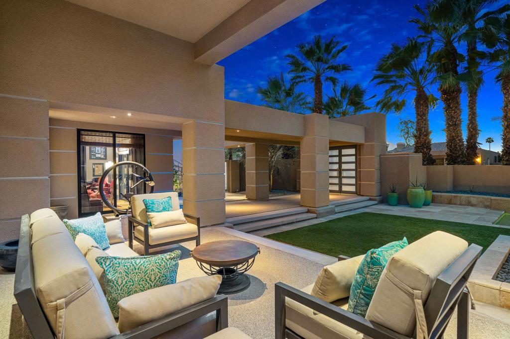 Spectacular Custom Lakeside Compound with Expansive Outdoor Living Spaces, Contemporary Architecture, Renovated Luxury Interiors and up to 5 bedrooms - Home of Tennis Legend Mark Woodforde. Enter through Double Gates to a resort compound on a double lot with custom landscaping including numerous Palm and Olive Trees. Double Glass Entry Doors lead to an open Great Room with walls of glass framing the lake and the pool terrace, clerestory windows, fireplace, entertainer's bar and stunning dining room with custom ceiling and stylish lighting - a dramatic space to gather family or entertain large groups of friends. Open Kitchen, Dining and Family Room also overlook the lake and provide informal gathering space. Gourmet Chef's Kitchen features large social island with seating, granite countertops, upgraded appliances and custom cabinetry with lighting. Informal Dining overlooks the lake terrace and BBQ area and Family/Media Room has a contemporary fireplace and great space for those movie nights. An office/library with fireplace opens to the Great Room. A nearby powder room services both formal and informal spaces. Primary Bedroom Suite features sliders to the pool terrace, marble and travertine filed bath with spa tub, shower and double vanities and an oversized closet with custom built-ins. Guest Room 1 overlooks the lake and could be a second primary with ensuite bath clad in granite and travertine. A dramatic hallway leads to a separate guest wing that includes 2 bedrooms and a large living room and separate terraces. Bedrooms with ensuite marble and travertine clad bathrooms and sliders to individual terraces. Outside is a true resort yard with large pool and spa with waterfalls, Covered outdoor living room with fireplace and TV, Outdoor Kitchen and Dining Area perfect for big family events or parties, expansive grass lawns and multiple stone terraces surrounding the pool side and the lake side. Lutron lighting system and automatic shades. Located in coveted Fairway Estates of Mission Hills Country Club, home of grass, clay and hardcourt tennis,pickleball and 3 18 hole championship golf courses. Privacy, Contemporary Luxury and Space provide the perfect resort compound for family or friends - come home to your desert retreat!