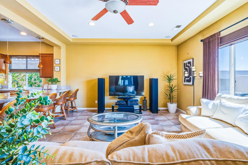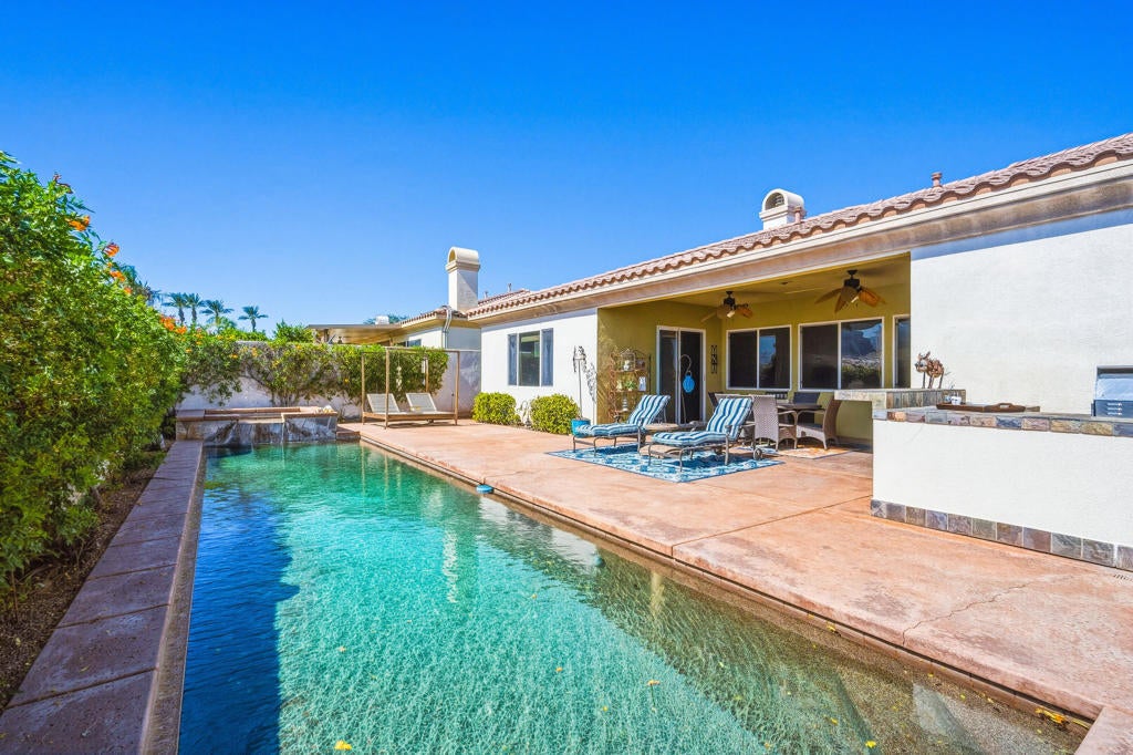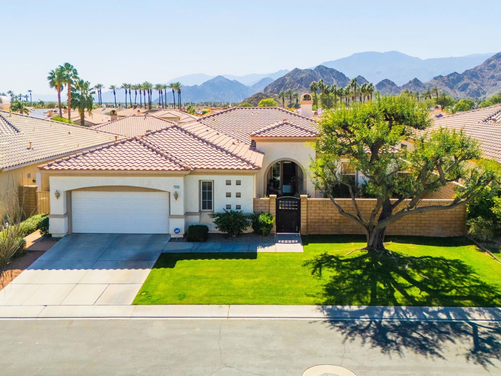 Here it is -- South Facing Pool and Mountain Views under 1 Million in La Quinta, featuring four bedrooms all with ensuite, located within the gated enclave of La Quinta Del Oro.Positioned in one of the most desirable school districts in the Coachella Valley, this residence offers an exceptional lifestyle location -- walking distance to the world-renowned Indian Wells Tennis Garden, and moments from La Quinta's favorite boutiques, dining destinations, and vibrant community offerings.A private gated courtyard welcomes you with a lush grassy retreat -- a rare and refreshing outdoor lounge space, perfectly shaded for relaxed mornings or cool desert afternoons away from direct sun.Inside, the thoughtfully designed open floor plan offers both comfort and flexibility. Two separate living areas, a formal dining room, and a spacious primary suite with an upgraded walk-in closet create effortless functionality for everyday living and entertaining alike. The 4th bedroom -- complete with built-in office space -- is ideal for guests, multigenerational living, or a refined work-from-home environment.The chef's kitchen is both spacious and efficient, featuring a center island, breakfast bar, and seamless workflow that invites gathering while meals are prepared. Just beyond, an outdoor built-in barbecue island overlooks the resort-style pool, allowing the grill master to enjoy sweeping south and west mountain views while entertaining.The south-facing backyard is the true showpiece -- a pool and spa stretching along the length of the property, perfectly positioned to capture optimal sun exposure and showcase the home's stunning southern mountain backdrop. Designed for both relaxation and active outdoor living, this private retreat embodies the very best of the desert lifestyle.Even the garage delivers -- a double attached garage with built-in overhead and wall cabinetry provides elevated storage solutions for an organized, active household.Centrally located within gated La Quinta Del Oro, and just minutes from premier shopping, dining, and entertainment -- plus close enough to walk or bike to the CV Link for outdoor fitness and recreation -- this home offers the ideal blend of luxury, location, and lifestyle.A special home in a special setting, ready for the next owner to embrace the very best of La Quinta living.