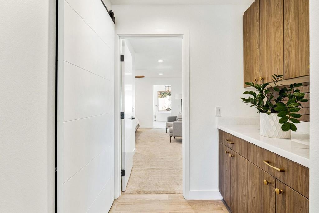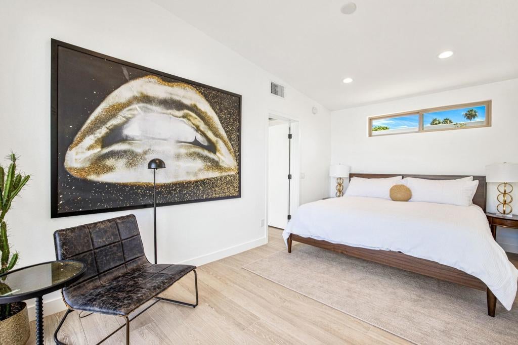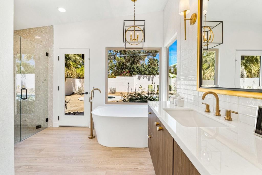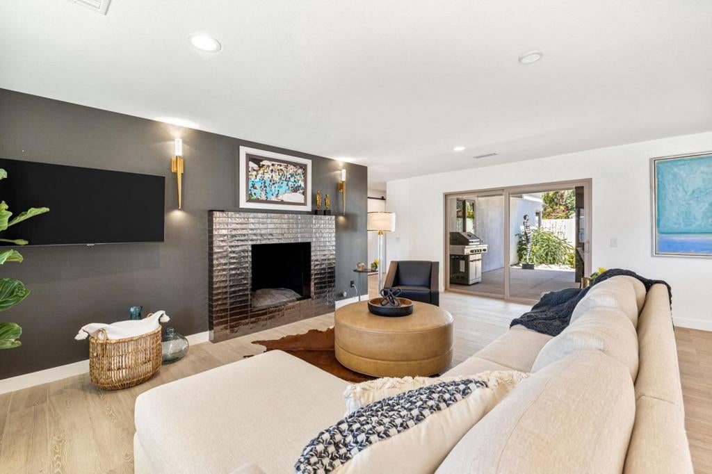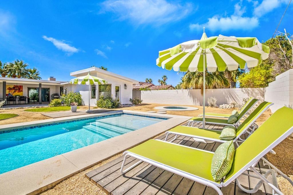 Moments from the boutiques, galleries, and dining of the famed El Paseo Shopping District, this beautifully reimagined mid-century ranch style home, captures the essence of relaxed desert living on an expansive .35-acre parcel in South Palm Desert. Originally built in 1950 and thoughtfully renovated from top to bottom, the residence blends timeless architectural character with contemporary design and modern comfort. Clean lines, open living spaces, and abundant natural light create a welcoming atmosphere throughout the home. At the heart of the residence, the chef's kitchen has been completely transformed with professional-grade appliances, sleek custom cabinetry, floating shelves, and a striking waterfall island designed for both everyday living and effortless entertaining. The open-concept great room features a gas-burning fireplace, designer tile flooring, and views that extend toward the surrounding mountains. The primary suite offers a tranquil retreat with a sitting area, walk-in closet, and a beautifully renovated bath featuring a soaking tub, dual vanities, and direct access to the pool and spa. Two additional bedrooms, including a private poolside casita connected by a breezeway, provide comfortable accommodations for guests while maintaining privacy and flexibility. Outdoors, the property unfolds as a private resort; a newly constructed pool and spa anchor the grounds, complemented by multiple lounging and dining areas, mature desert landscaping, and generous open space rarely found so close to El Paseo.Offering architectural charm, modern upgrades, and an exceptional location, this distinctive property presents a rare opportunity to experience the very best of desert living.