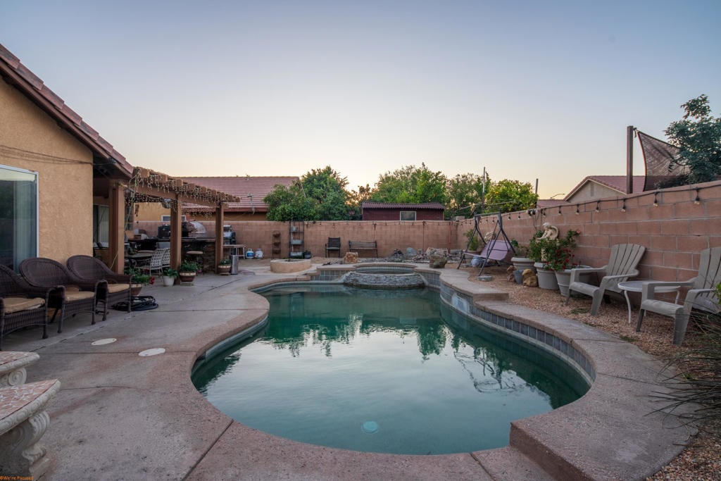 Corner home featuring 4 bedrooms and 2 bathrooms with a spacious layout that includes two separate living areas, offering plenty of room for relaxing or entertaining. The backyard is designed for outdoor enjoyment with a pool, spa, and a covered patio BBQ area, perfect for gatherings and warm desert evenings. The property also offers generous front parking space, providing plenty of room for multiple vehicles. Additional features include an aluminum patio cover and leased solar panels at $180 per month, which the new owner will assume. This home offers comfort, space, and great outdoor amenities, making it a wonderful opportunity for its next owner.