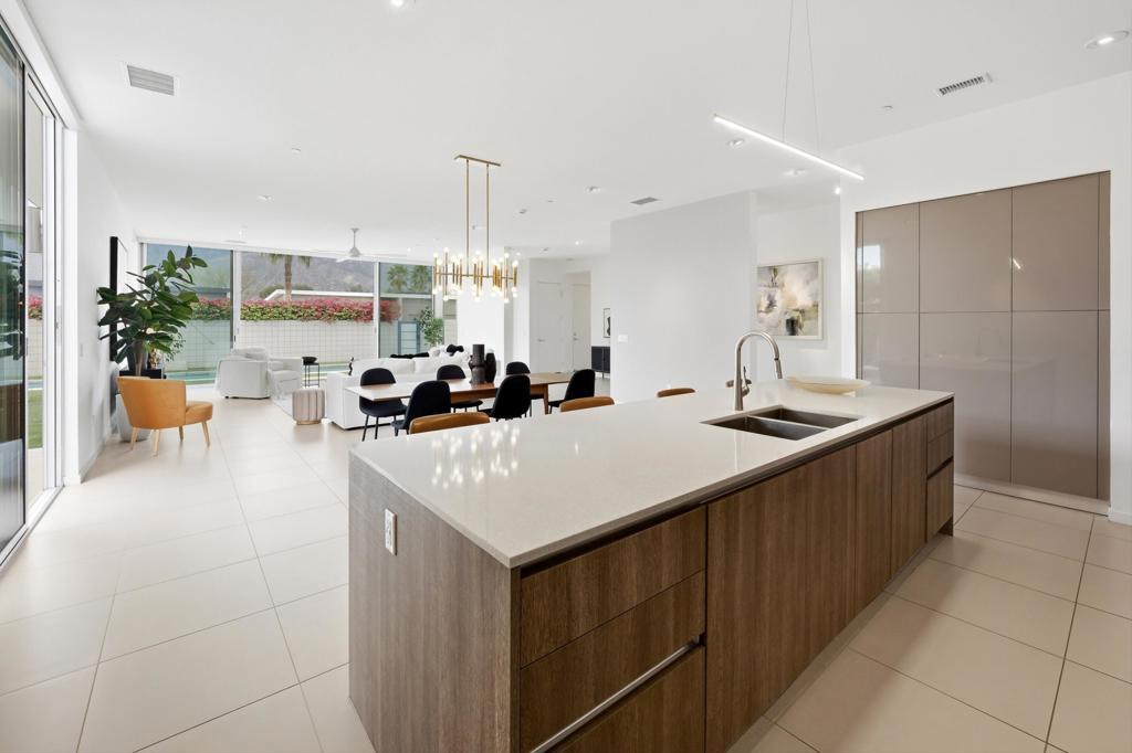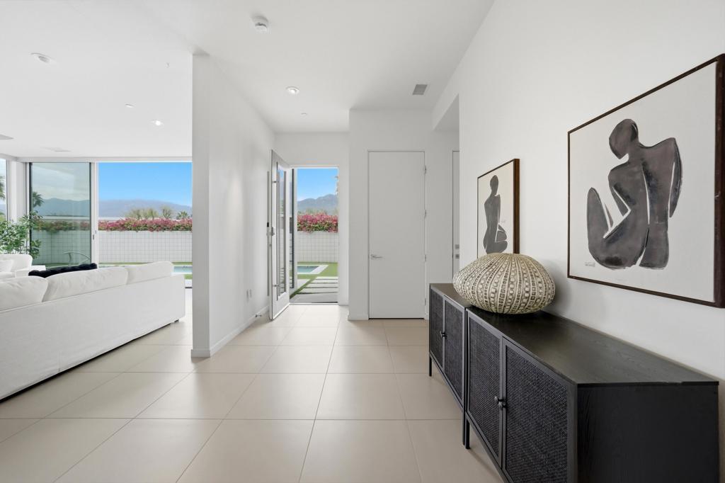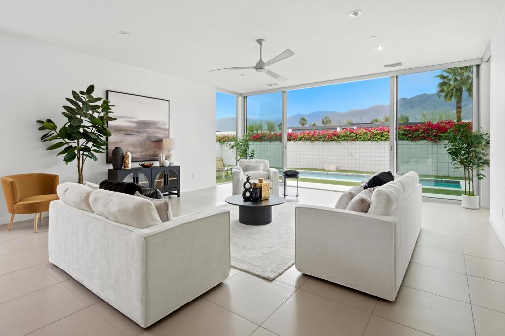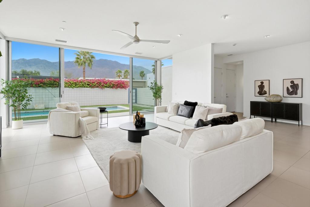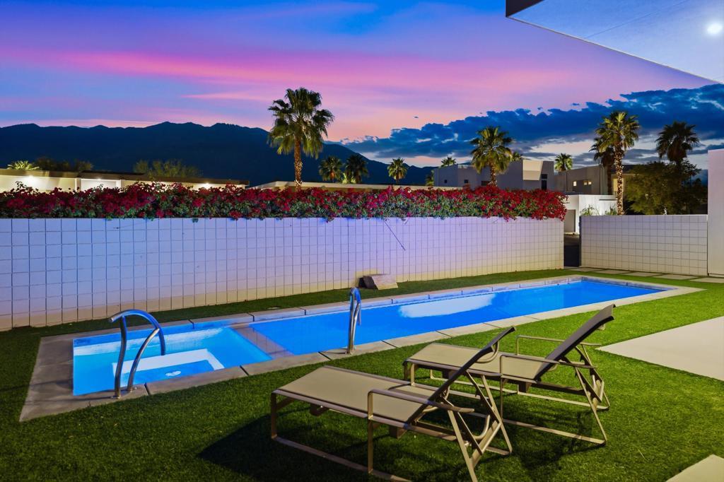Welcome to Escena, where luxury meets contemporary elegance in this highly desired Anthony Poon designed home. This beautiful Alta Verde home showcases a front-loaded pool and spa with PHENOMENAL views of the San Jacinto mountains. One of the larger homes in Escena, this home offers 2649 sq. ft. of luxurious living space with 3 bedrooms and 3 bathrooms. A chef's kitchen is a culinary delight with quartz countertops & backsplash, Italian designed cabinetry, stainless-steel Bosch appliances, a newer Samsung Smart refrigerator, and an oversized island. The spacious open floor plan consists of the kitchen, living and dining areas, 10'+ high ceilings, porcelain tile flooring, custom lighting, and mountain views from the home's great room and pool area. The expansive primary bedroom suite has cornered Fleetwood sliding door access to a private back patio, a huge double-headed walk-in shower, dual vanities, and an extra amount of closet space. The two guest bedrooms share a Jack & Jill bathroom, with good separation from the primary bedroom. Enjoy Palm Springs indoor/outdoor living at its finest with a floor to ceiling wall of Fleetwood sliding doors opening from the great room to the outdoor patio and pool, perfect for entertaining or just relaxing in the sun as you revel in the amazing mountain views. Another Fleetwood sliding door opens from the kitchen to a lovely, spacious side yard/patio of pavers and artificial turf, perfect for relaxing or cooking on the outdoor BBQ. Lighting and landscaping surround the property, adding to the privacy of the outdoor space and its alluring night-time beauty. Additional highlights include motorized blinds in the great room and primary bedroom, a powder room for guests, a separate laundry room with cabinetry and a sink, and 26 owned solar panels for energy efficiency. The 2-car garage has epoxy floor finish, a whole house water filtration system, and EV charger, extra storage space and an A/C split for added comfort on those hot summer Palm Springs days. Recent upgrades include a newer pool pump, newer washer/dryer, added sink to laundry room, newer tankless water heater, and a circulator for quicker hot water. Escena is a highly sought after guard-gated golf course community with low HOA dues and resides on fee simple land (you own it). Do not miss this beautiful Palm Springs contemporary home, offering luxury, unparalleled comfort, style, indoor-outdoor living, and some of the best views in Escena!