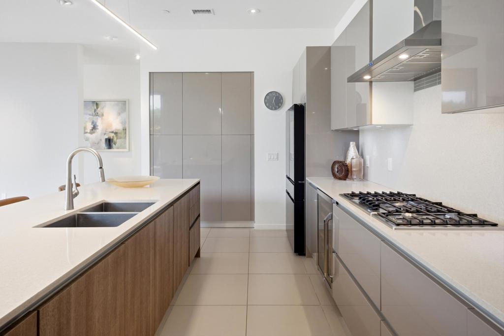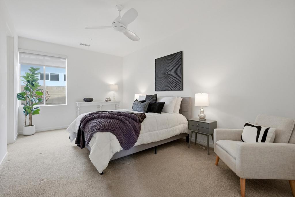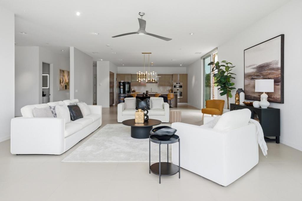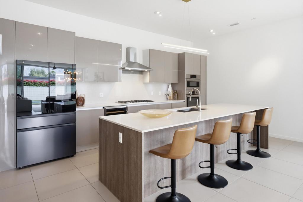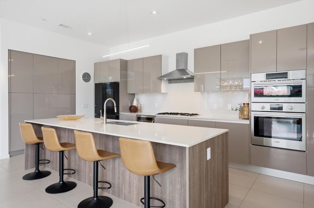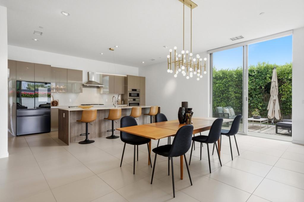 Welcome to Escena, where luxury meets contemporary elegance in this highly desired Anthony Poon designed home. This beautiful Alta Verde home showcases a front-loaded pool and spa with PHENOMENAL views of the San Jacinto mountains. One of the larger homes in Escena, this home offers 2649 sq. ft. of luxurious living space with 3 bedrooms and 3 bathrooms. A chef's kitchen is a culinary delight with quartz countertops & backsplash, Italian designed cabinetry, stainless-steel Bosch appliances, a newer Samsung Smart refrigerator, and an oversized island. The spacious open floor plan consists of the kitchen, living and dining areas, 10'+ high ceilings, porcelain tile flooring, custom lighting, and mountain views from the home's great room and pool area. The expansive primary bedroom suite has cornered Fleetwood sliding door access to a private back patio, a huge double-headed walk-in shower, dual vanities, and an extra amount of closet space. The two guest bedrooms share a Jack & Jill bathroom, with good separation from the primary bedroom. Enjoy Palm Springs indoor/outdoor living at its finest with a floor to ceiling wall of Fleetwood sliding doors opening from the great room to the outdoor patio and pool, perfect for entertaining or just relaxing in the sun as you revel in the amazing mountain views. Another Fleetwood sliding door opens from the kitchen to a lovely, spacious side yard/patio of pavers and artificial turf, perfect for relaxing or cooking on the outdoor BBQ. Lighting and landscaping surround the property, adding to the privacy of the outdoor space and its alluring night-time beauty. Additional highlights include motorized blinds in the great room and primary bedroom, a powder room for guests, a separate laundry room with cabinetry and a sink, and 26 owned solar panels for energy efficiency. The 2-car garage has epoxy floor finish, a whole house water filtration system, and EV charger, extra storage space and an A/C split for added comfort on those hot summer Palm Springs days. Recent upgrades include a newer pool pump, newer washer/dryer, added sink to laundry room, newer tankless water heater, and a circulator for quicker hot water. Escena is a highly sought after guard-gated golf course community with low HOA dues and resides on fee simple land (you own it). Do not miss this beautiful Palm Springs contemporary home, offering luxury, unparalleled comfort, style, indoor-outdoor living, and some of the best views in Escena!